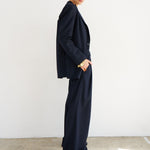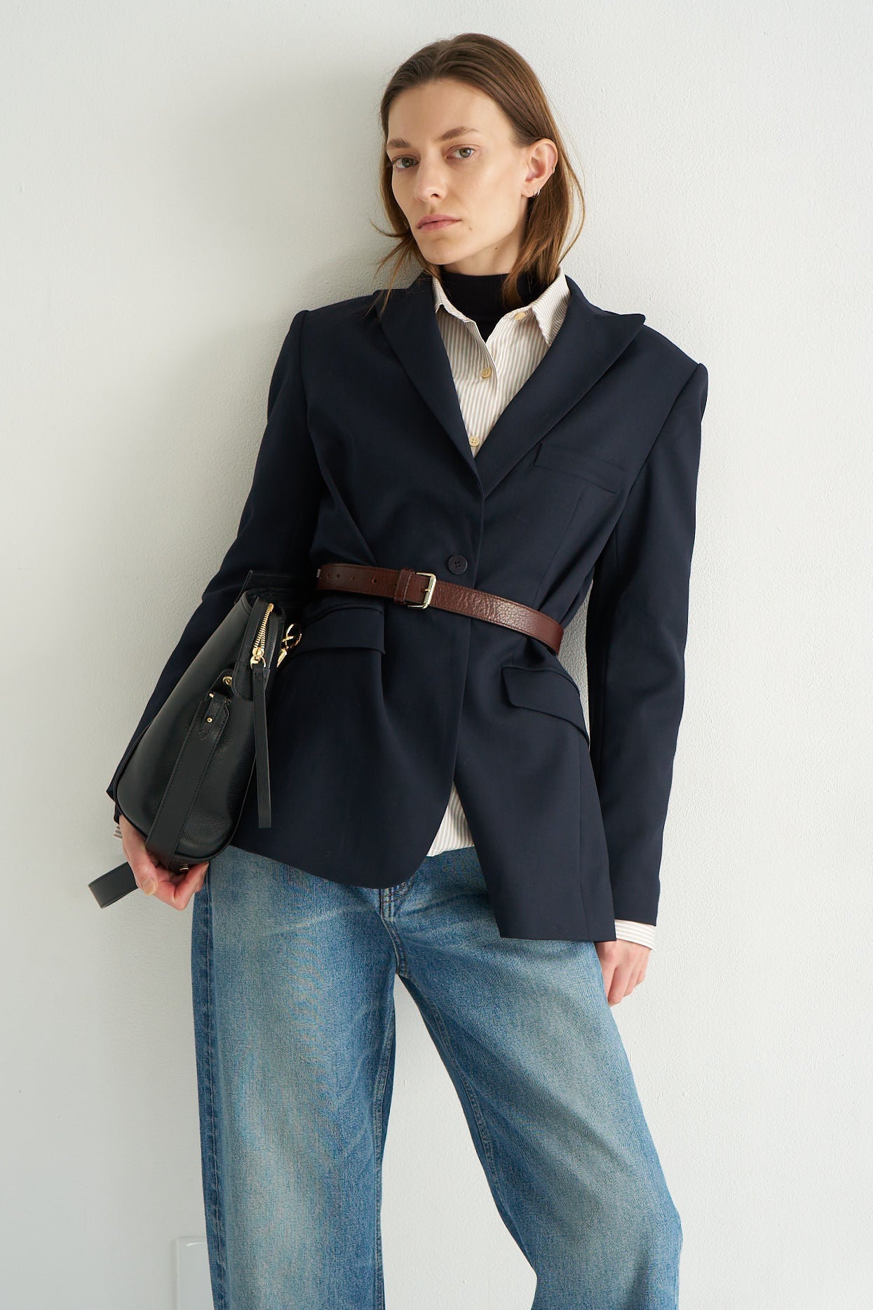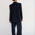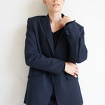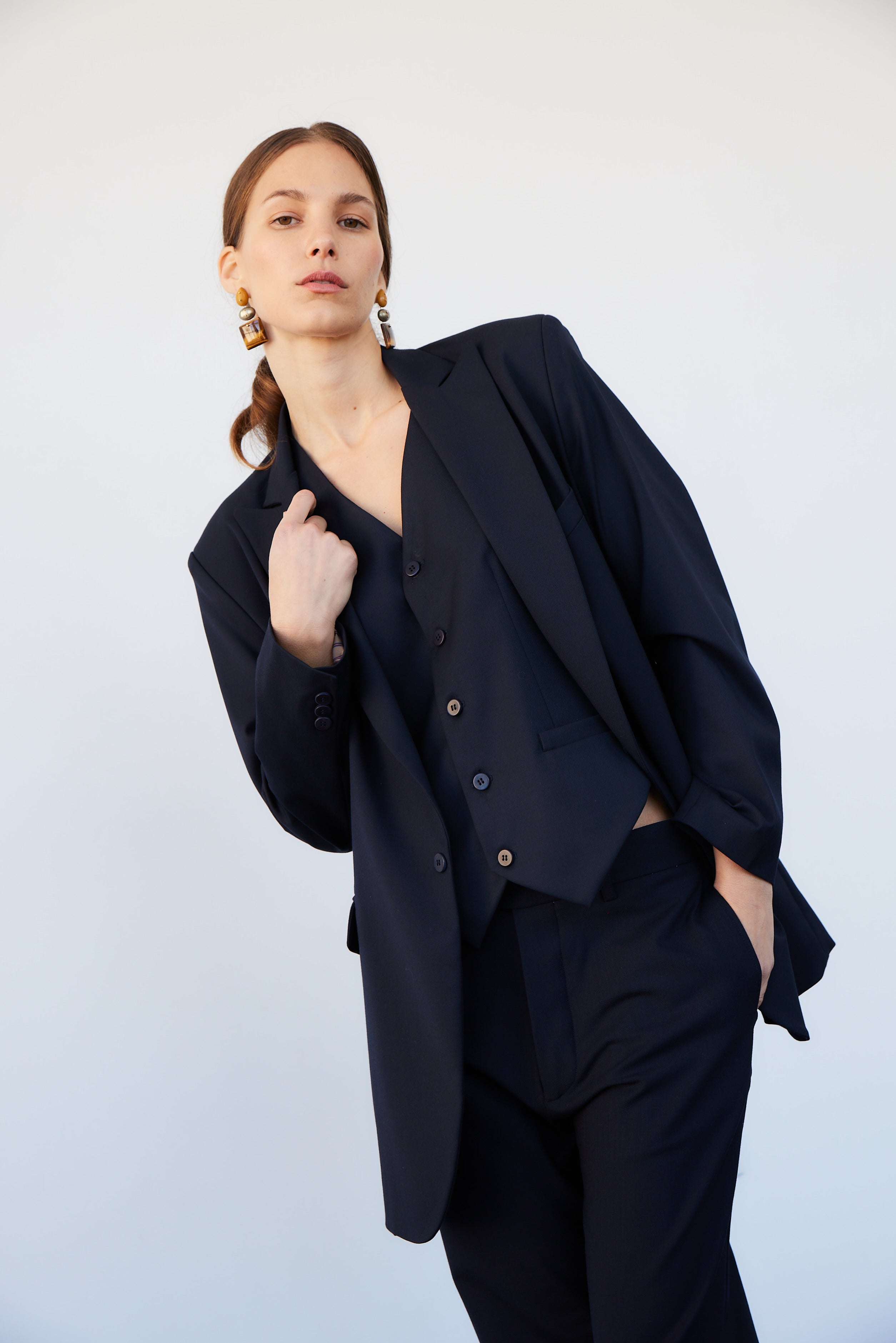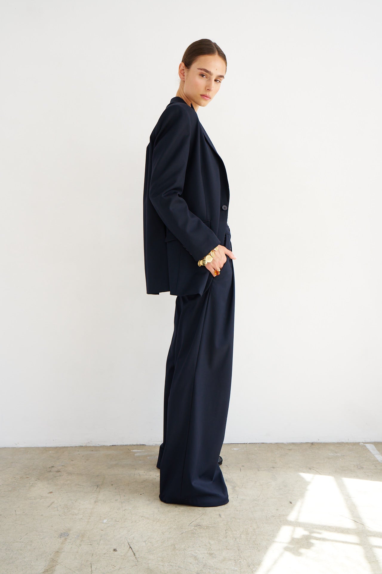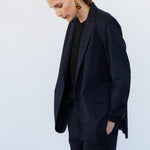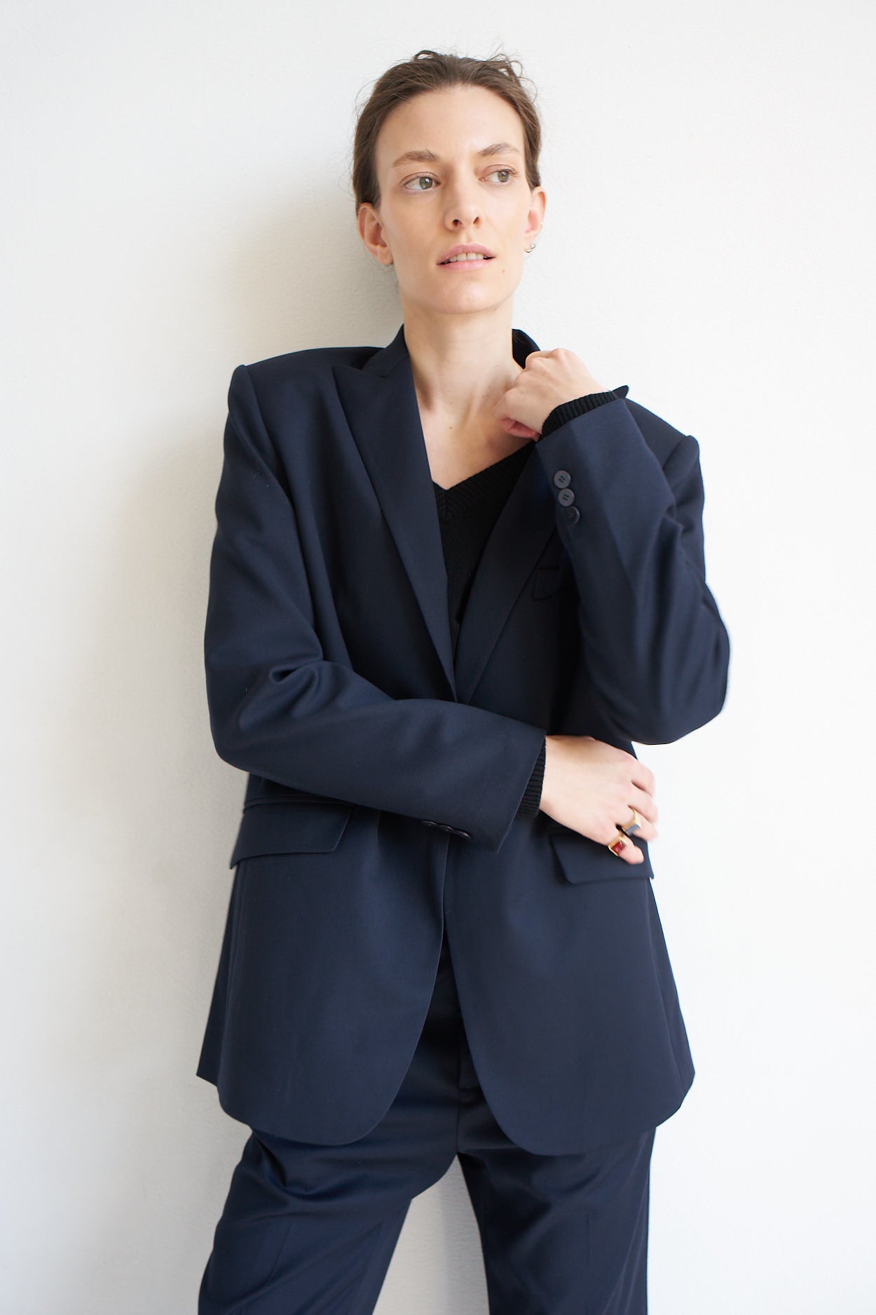A classic navy blazer. A relaxed cut, softly tailored. The Julius blazer wears nicely back to denim, is chic back to black. The silhouette is classic but advanced. Inspired by Julia Roberts in the last scene of Pretty Woman, by the navy suits in my Grandpas’s closet, inspired by men wearing Navy blazers in 1st class on airplanes, the idea that you dress. And this idea mixed with me, because I like to undress into casual. That mix. A classic blazer back to the fatigues, back to the Easy jean, back to the Waist Tape Trouser. All of that.