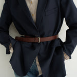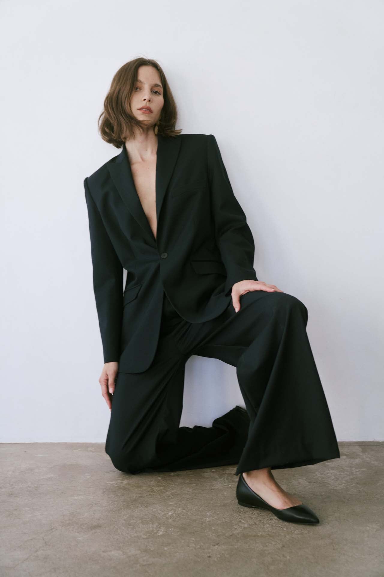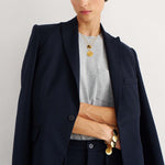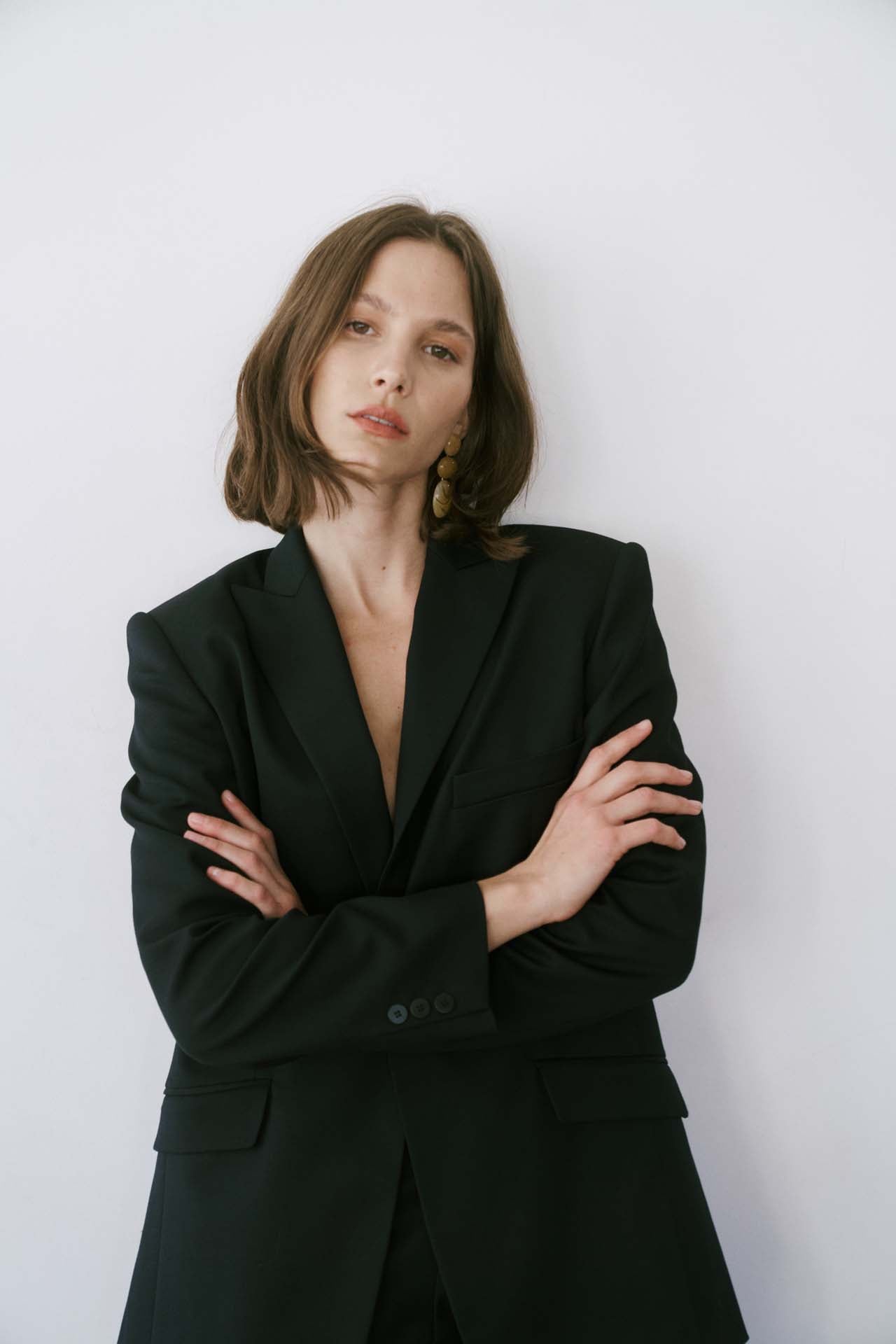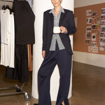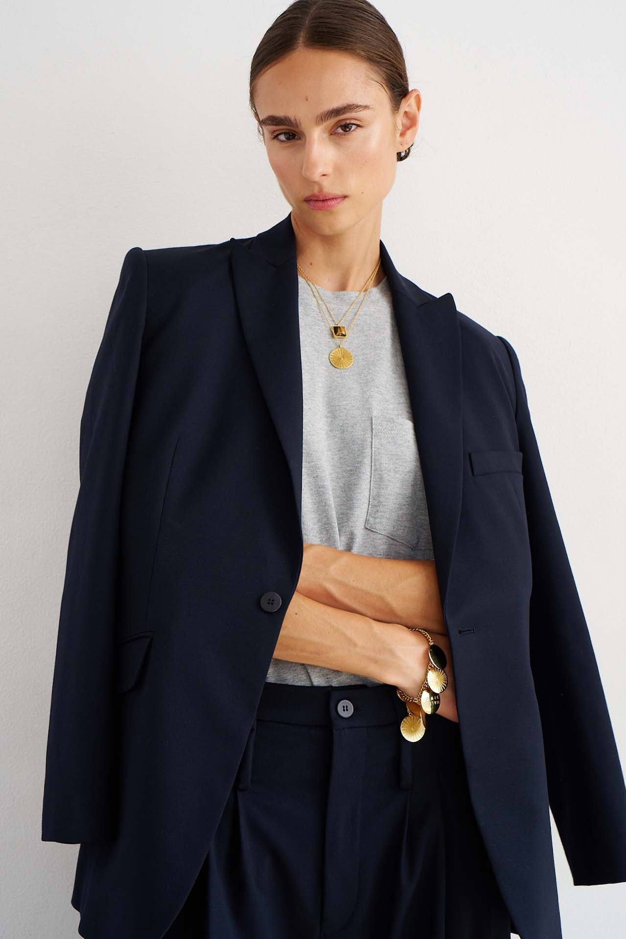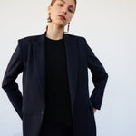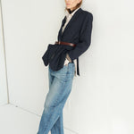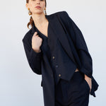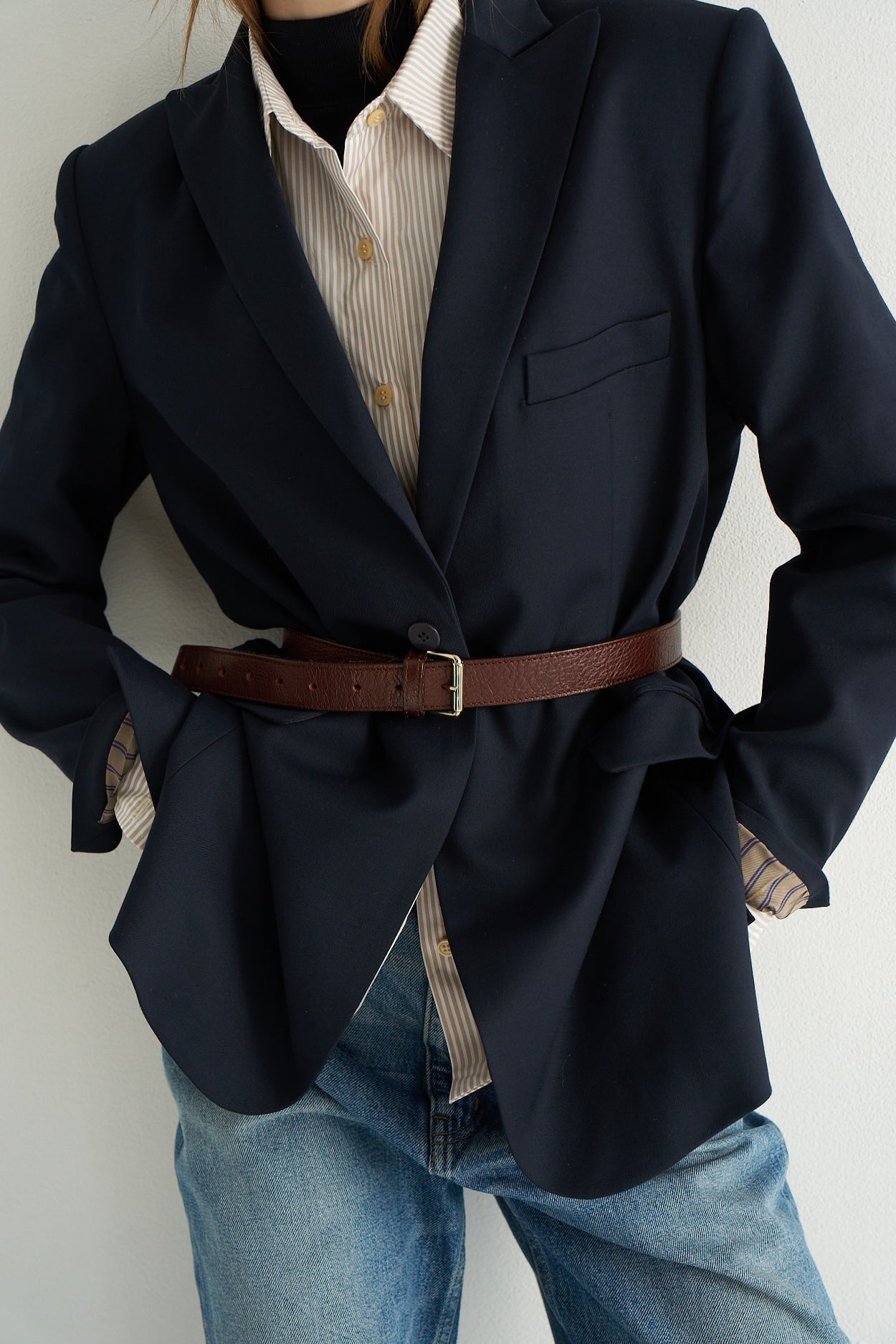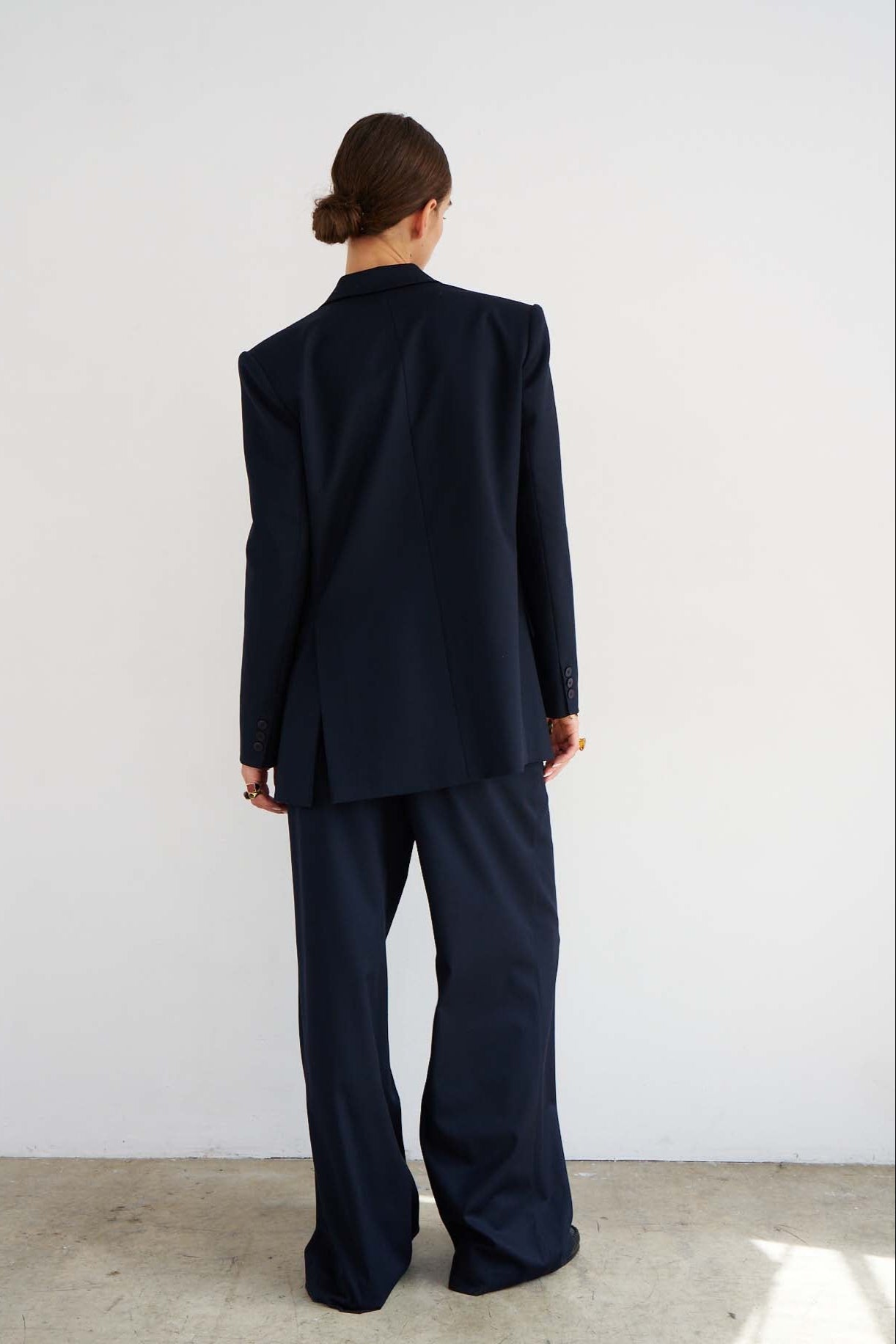 A classic navy blazer. A relaxed cut, softly tailored. The Julius blazer wears nicely back to denim, is chic back to black. The silhouette is classic but advanced. Inspired by Julia Roberts in the last scene of Pretty Woman, by the navy suits in my Grandpas’s closet, inspired by men wearing Navy blazers in 1st class on airplanes, the idea that you dress. And this idea mixed with me, because I like to undress into casual. That mix. A classic blazer back to the fatigues, back to the Easy jean, back to the Waist Tape Trouser. All of that.