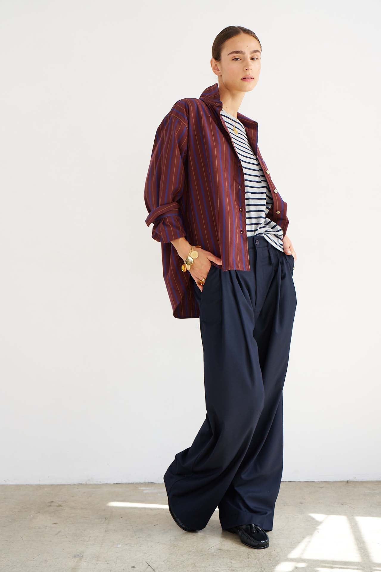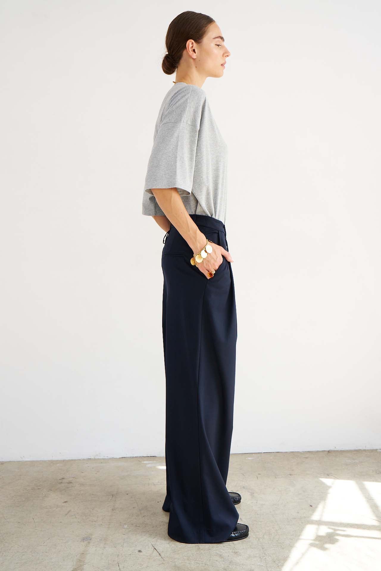 A mid rise trouser with triple pleat detailing at hip level offers beautiful drape and fullness in a low and extremely flattering position. Tailored in Los Angeles in European gabardine.