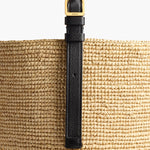 An elongated bucket bag handcrafted by artisans in Madagascar of finely knotted natural raffia. Grounded by a colored base, the cylindrical form is finished in Italy with an adjustable calfskin strap to carry on the shoulder or by hand. Buckle plated in 18-karat gold. Unlined for exceptional lightness.