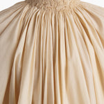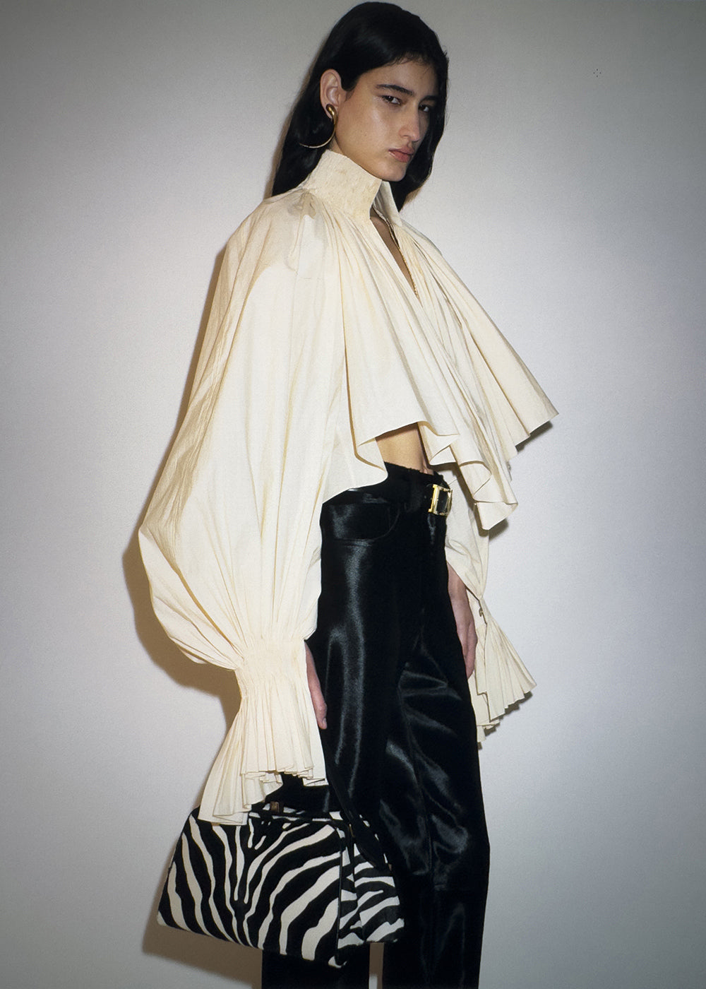 Fusing ‘90s grunge with a bohemian spirit, this fluidly formed shirt is framed by a high stand collar for a regal bearing. Cutaway silhouette animated by hand-crushed cartridge pleating, with billowing sleeves cinched at the wrist. Wear with slit neckline at front or back.