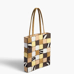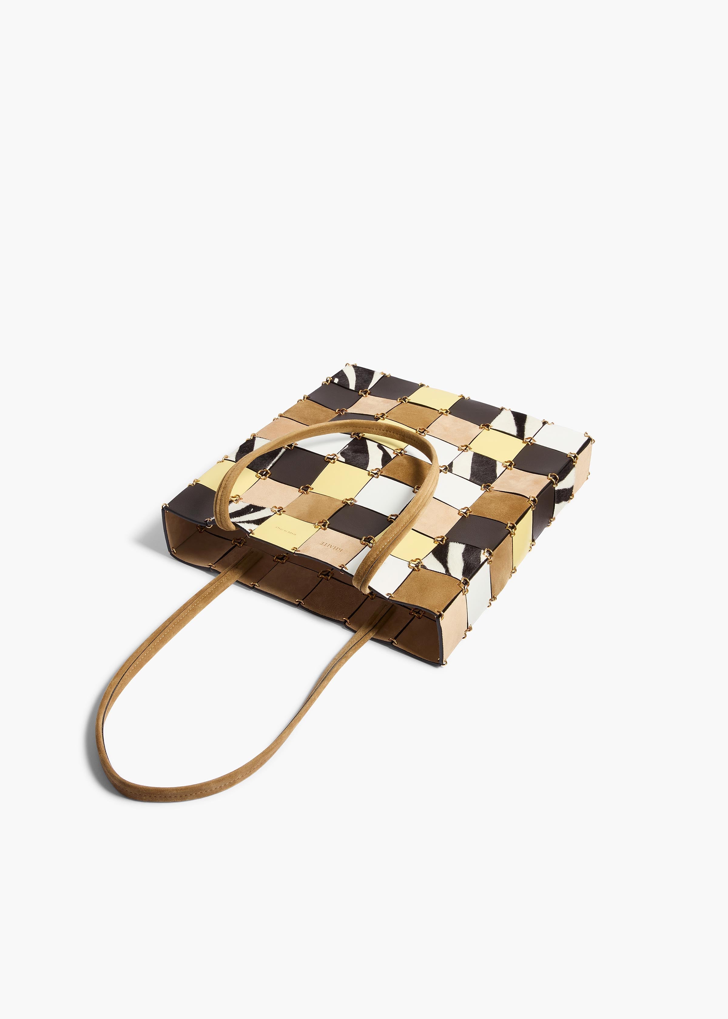 A slim, striking tote formed by grommeted panels of richly textured hair-on calfskin, at once supple and pristine. Each panel is bonded and edge-painted by hand before being hand-linked with gold-plated rings.