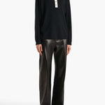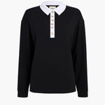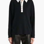 A long-sleeved polo that looks to vintage rugby shirts. Designed for unisex wear in jersey that gains its raw, natural quality from organic Japanese silk. Contrast collar and placket in robust cotton jersey that has been salt-shrinked for a crisp, dry, paper-like feel. Tortoiseshell buttons at placket.