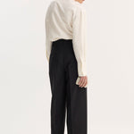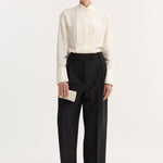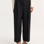High-waisted tailored trousers with sharp pleating and a wide leg. Finished with a slightly cropped, turned-up hem for a refined interpretation of classic tailoring.