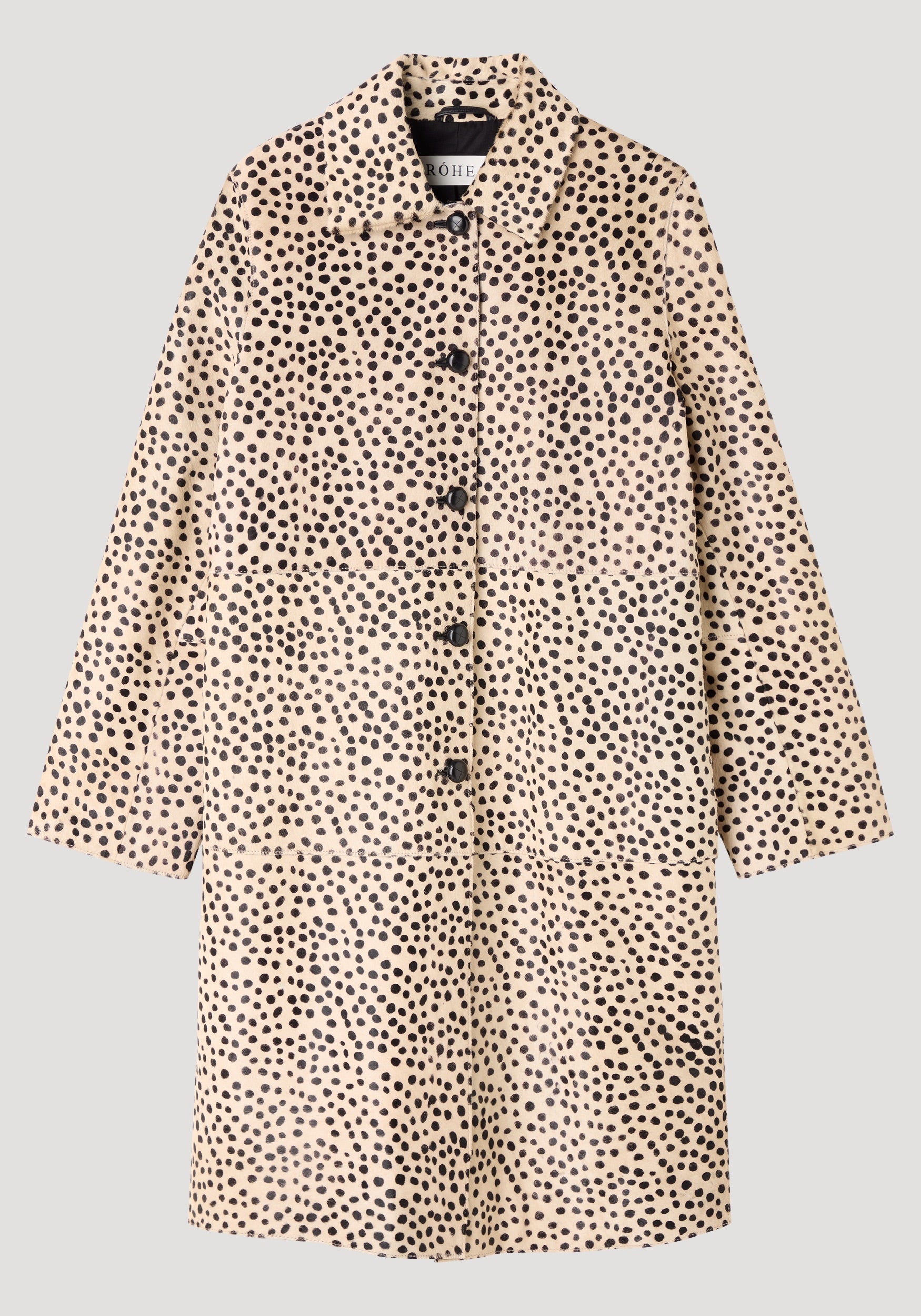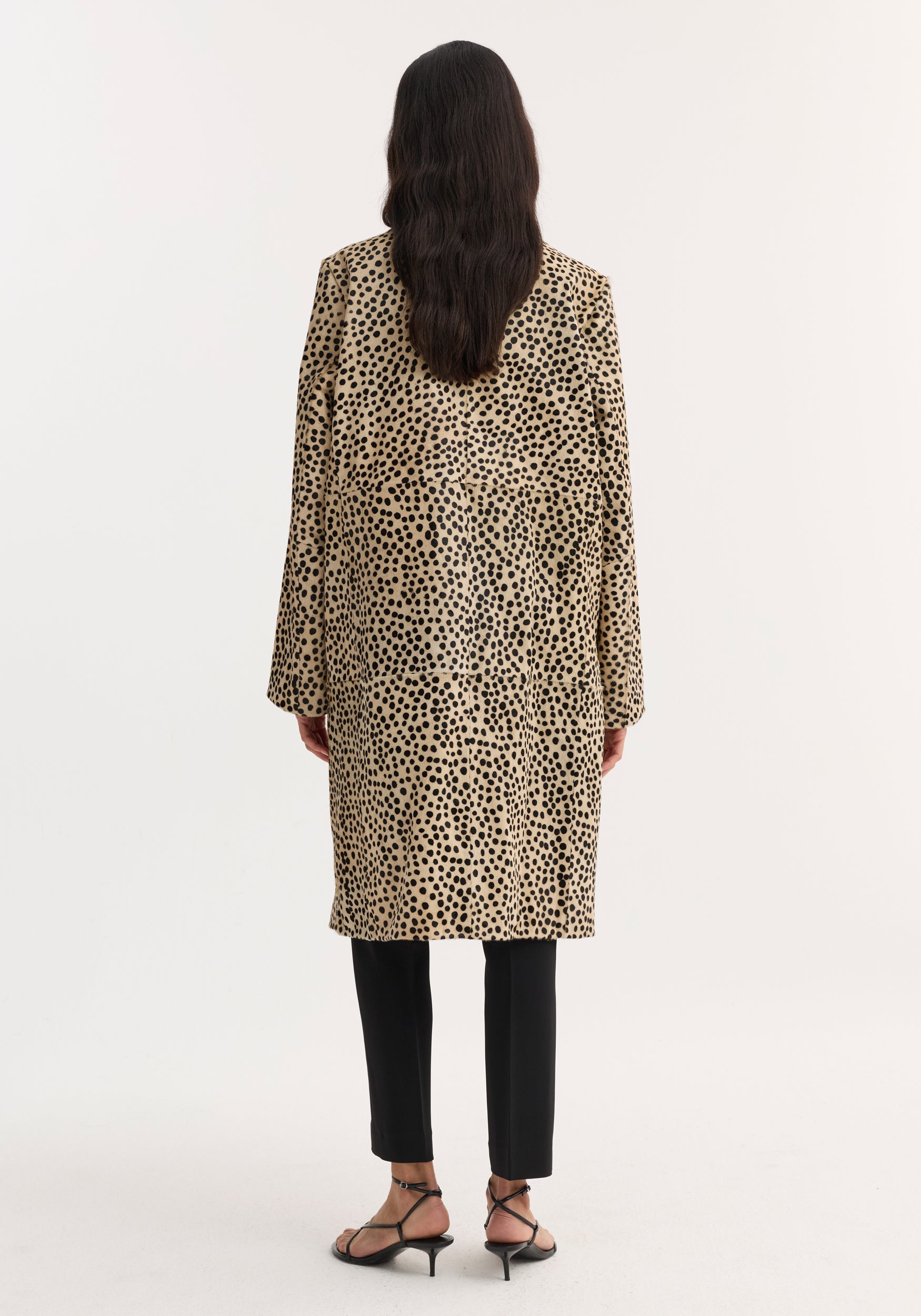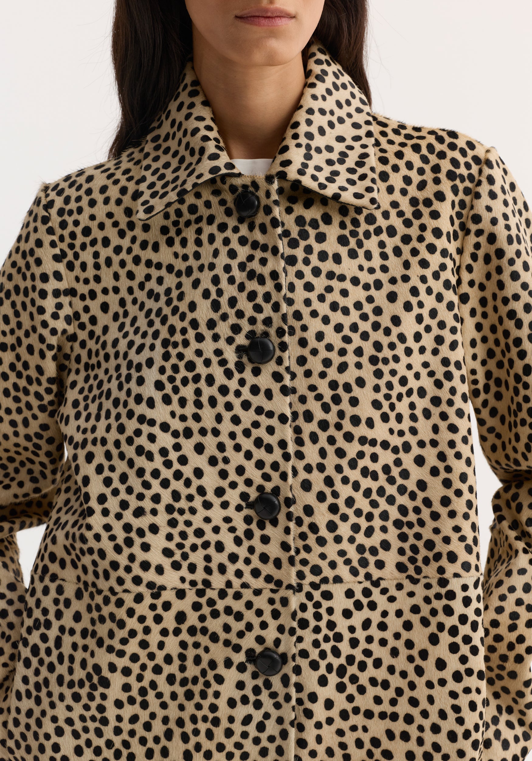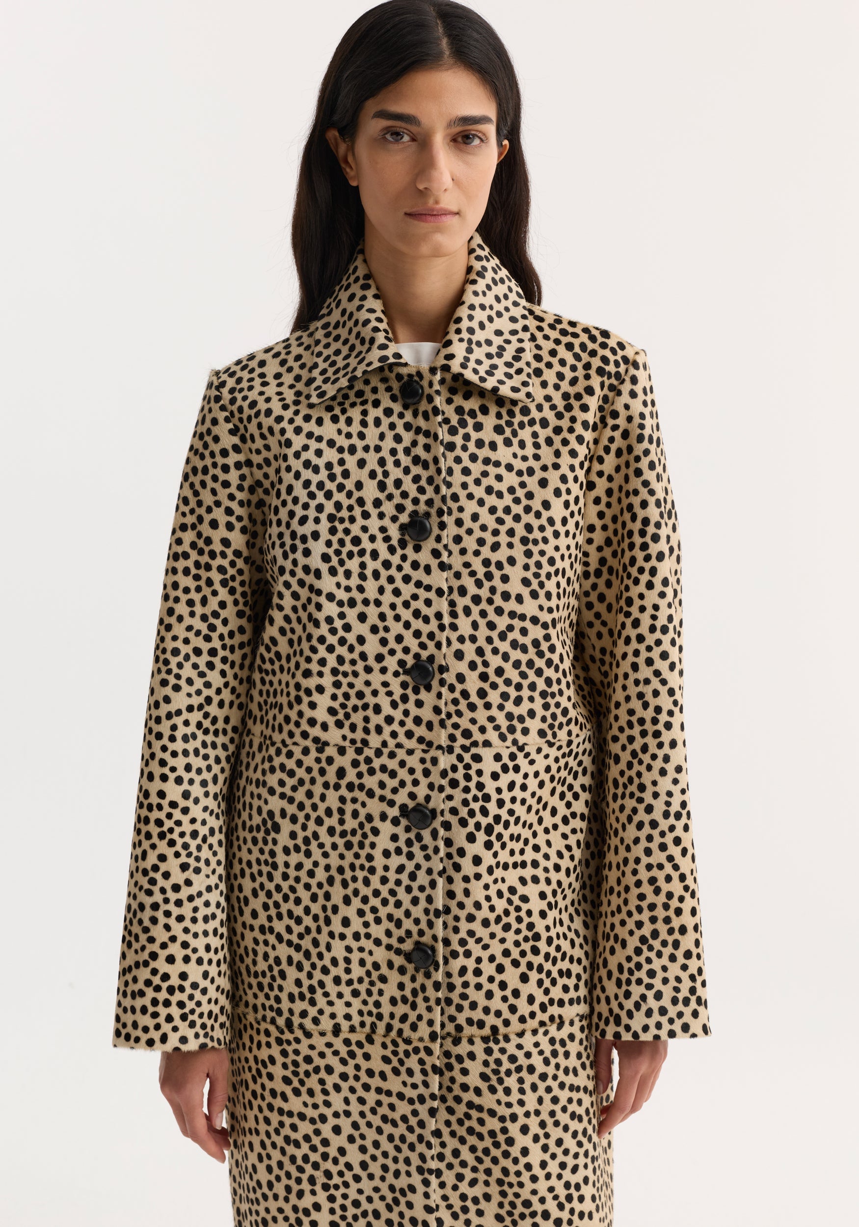 A statement coat crafted from cheetah-print pony hair and finished with leather-knotted button closures. Fully lined with hidden side-seam pockets, it offers a refined, structured silhouette.