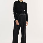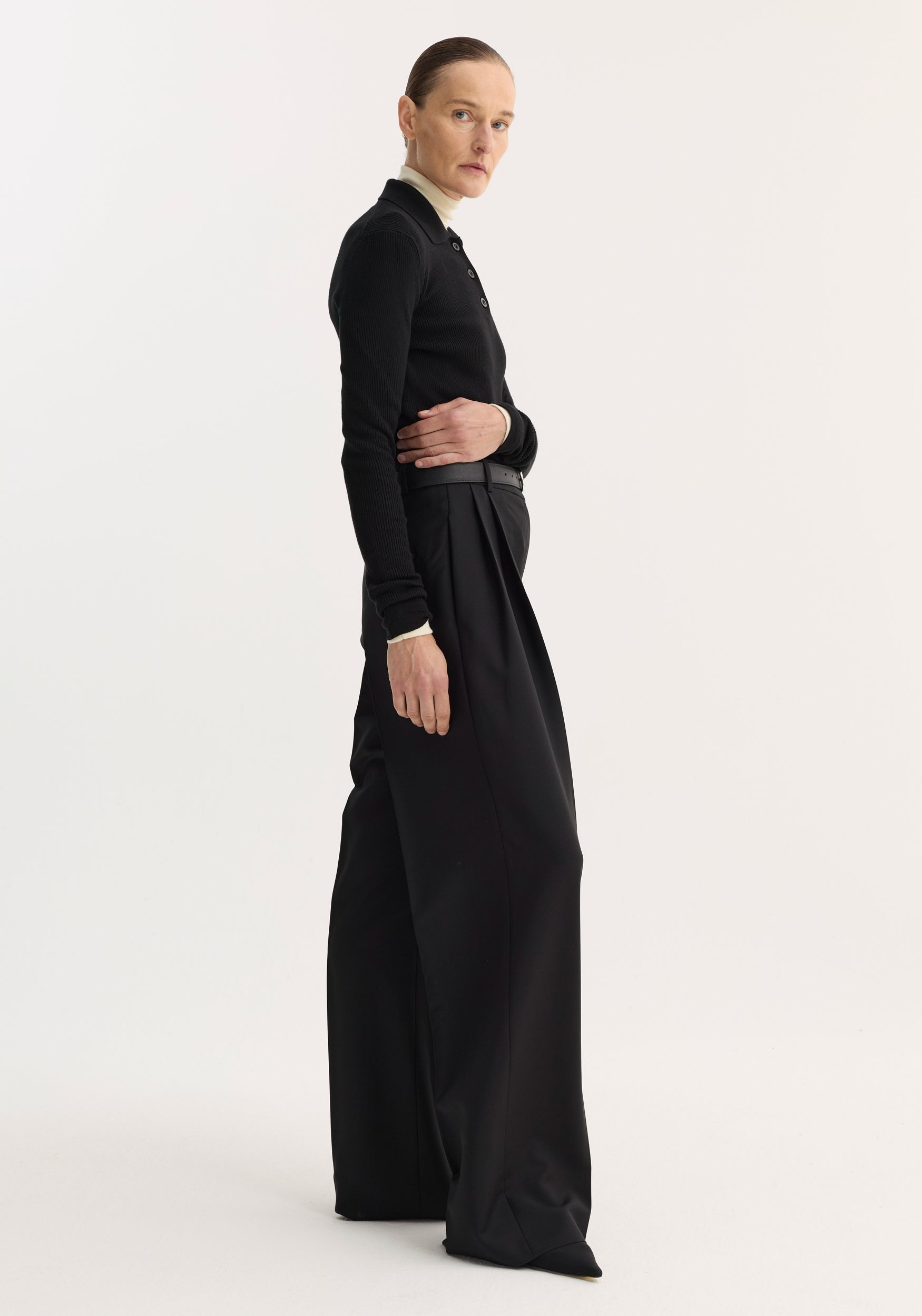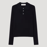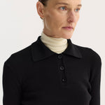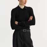 A ribbed black polo top crafted from a soft tencel–cotton blend. Designed with a fitted silhouette, long sleeves, and a classic three-button polo neckline for a refined wardrobe staple.