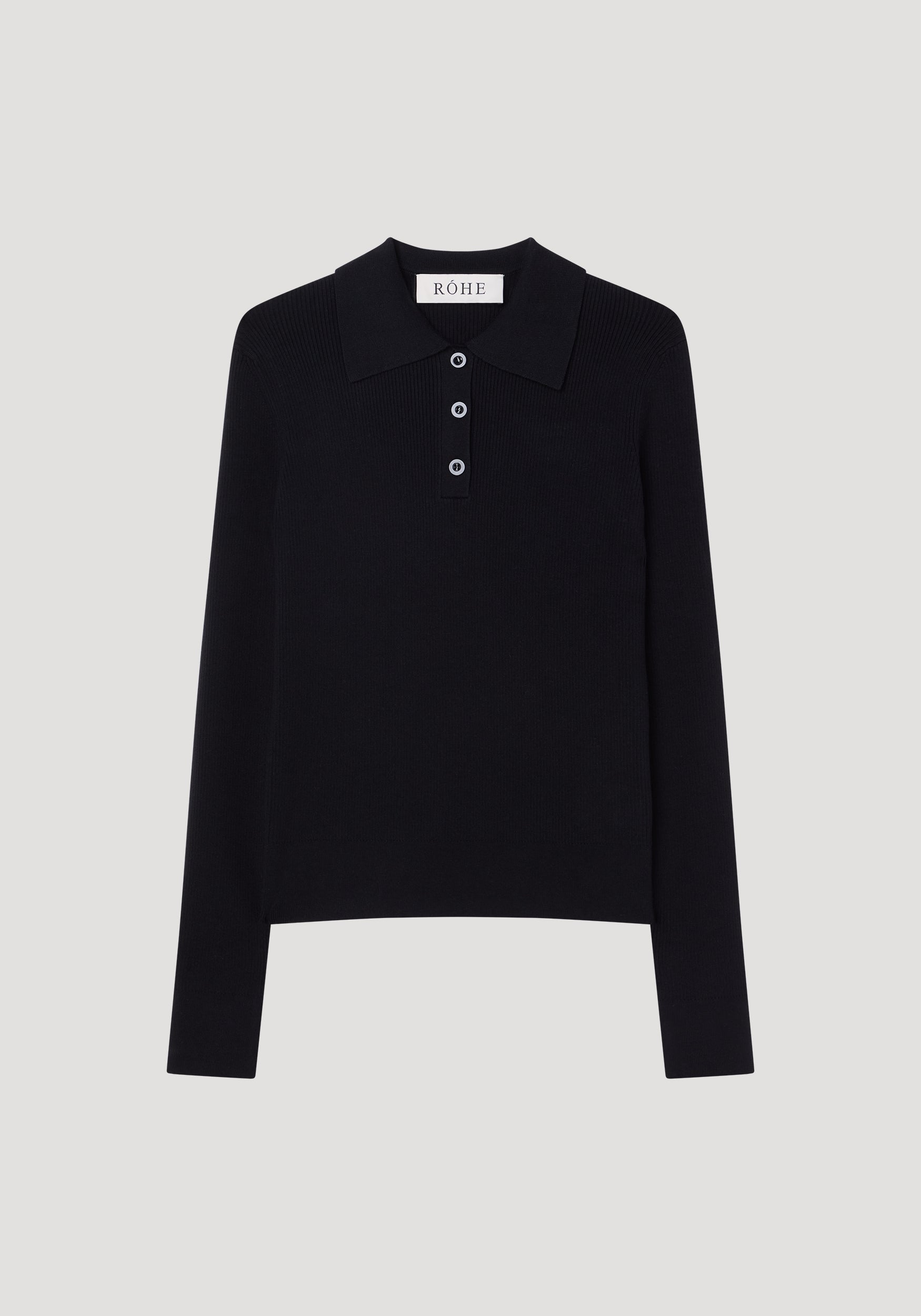 - Polo neckline, 3 buttons, ribbed knit, fitted, long sleeve