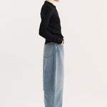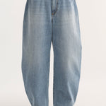 Sculptural denim trousers with a bold rounded balloon leg and a high waist, creating an artful, modern silhouette. Finished in a classic blue wash.
