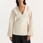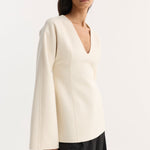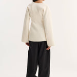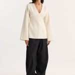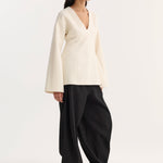 A double-faced wool top with sculptural, voluminous sleeves and a defined waist. Designed with a V-neckline and precise dart detailing, it creates an architectural silhouette that feels both structured and refined.