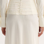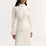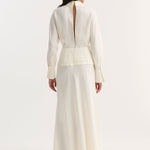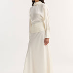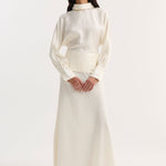 A full-length silk dress with flowing sleeves and a high collar. The waist is defined by cummerbund detailing, secured at the back with covered buttons. A reversed collar reveals an open back that extends to the waist, finished with a side zip for ease.