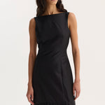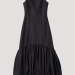 A fitted, sleeveless wool-silk dress with a boat neckline, featuring tailored seam detailing through the body for a refined fit. A voluminous peplum hem adds sculptural movement.