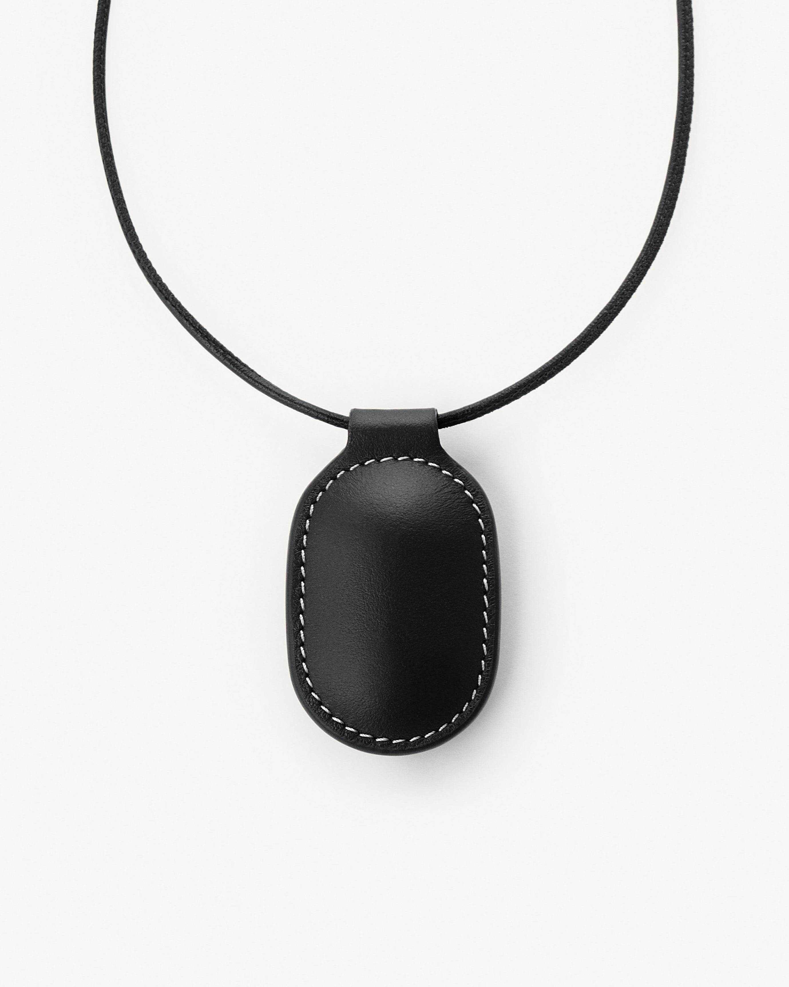 The Tondo pendant necklace takes its shape from the curved lines of the Tondo lock. Smooth calfskin encases a solid metal core, giving the pendant dramatic weight.