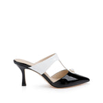 The Bayonne mule redefines statement dressing with bold black and white leather. A striking contrast T-strap crowned with a pearl accent adds a touch of vintage glamour, while the sharp pointed toe creates fashion-forward edge.