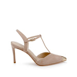 The Kaveh slingback pump delivers sharp sophistication in tan suede with a metallic gold cap toe. A T-strap and stiletto heel create an elongating silhouette—perfect for adding polish to tailored separates.