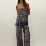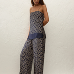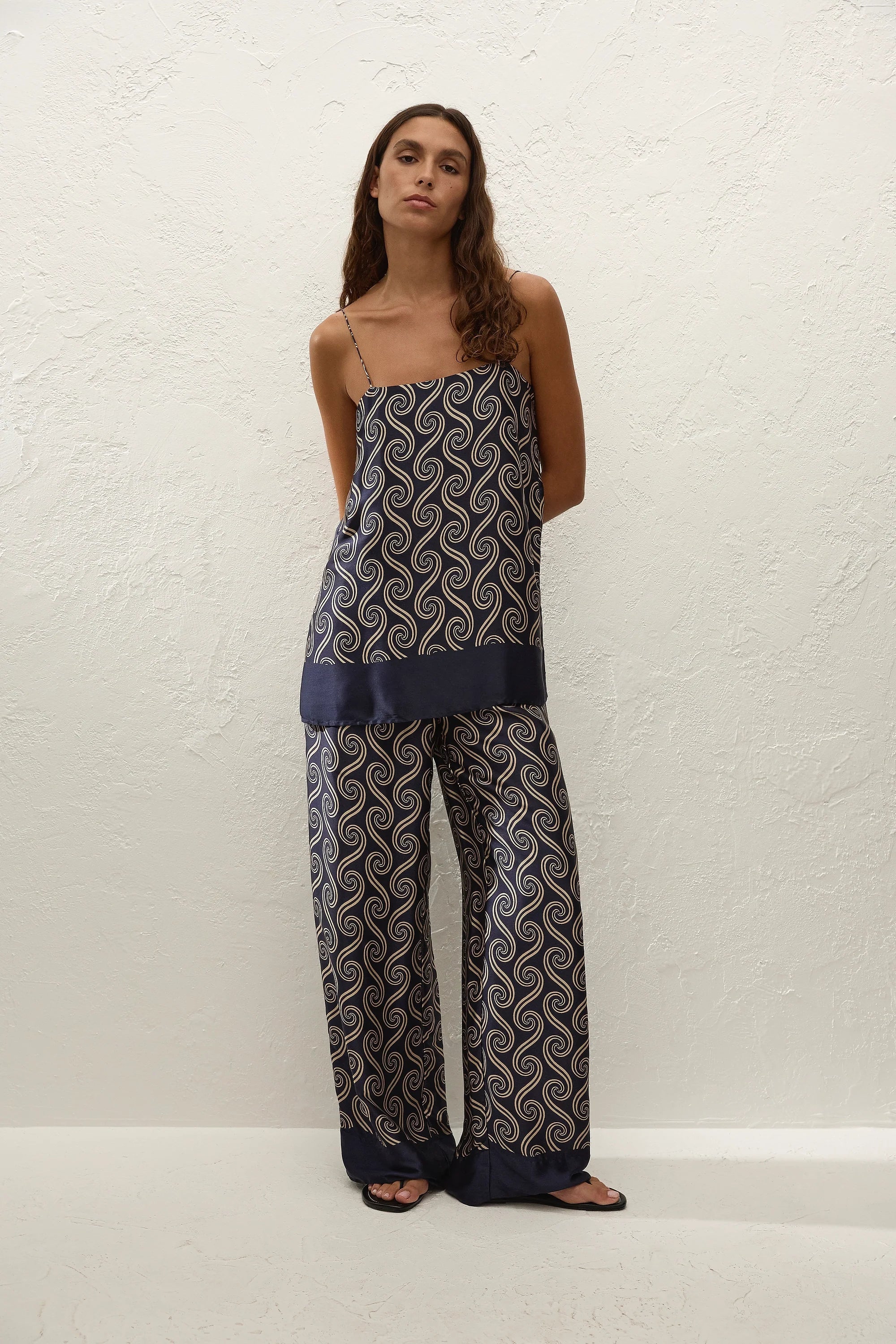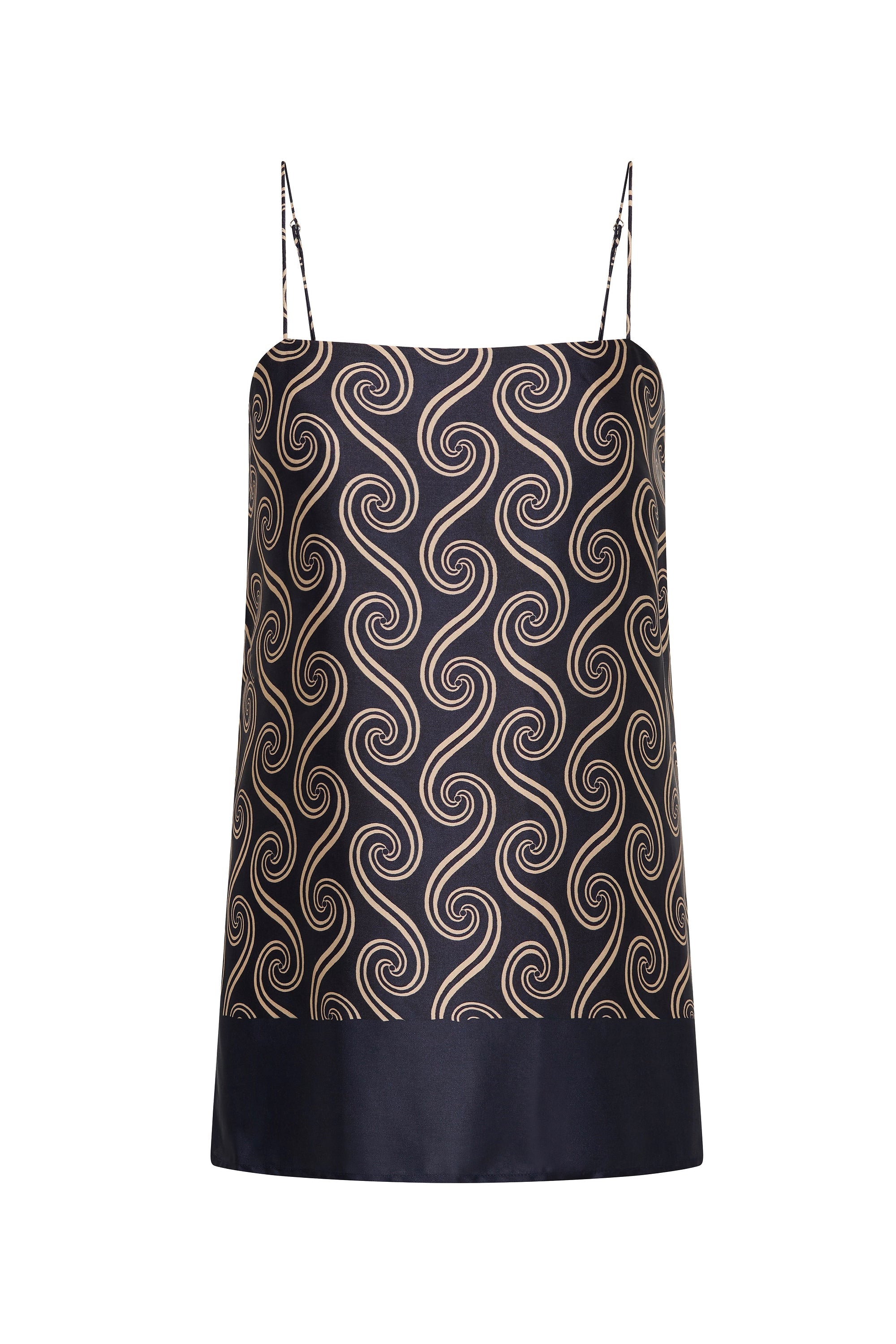 A 90s-inspired slip-style top, designed from a luxurious viscose satin fabrication, in a unique ocean swirl print. Hanging effortlessly off the body in a straight silhouette, it features a straight neckline and thin adjustable straps as well as side seam splits. The hem is finished with a navy blue band. Style over the matching Jensen Pant for an elevated approach to everyday dressing.
