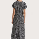 A romantic midi dress with a V-neckline and subtle ruching across the bust. Featuring soft, slightly flared sleeves and a floating skirt that crops above the ankles, it is designed in a vintage-inspired black and white floral motif. Back waist ties are offered for a custom fit. Pare back with simple accessories for long lunches and afternoon drinks.