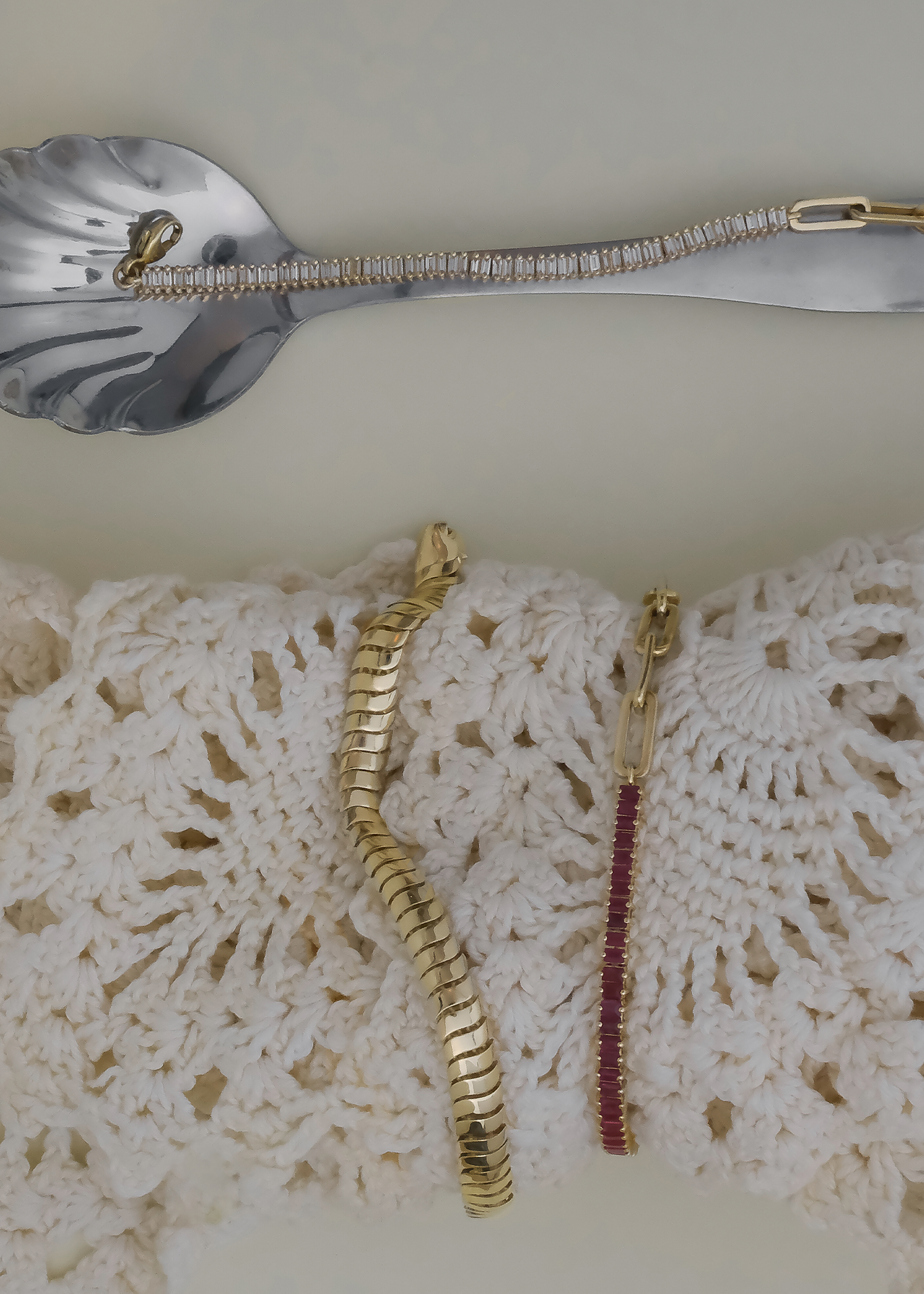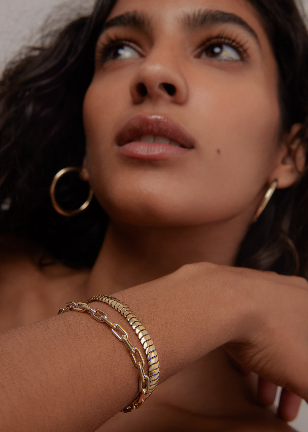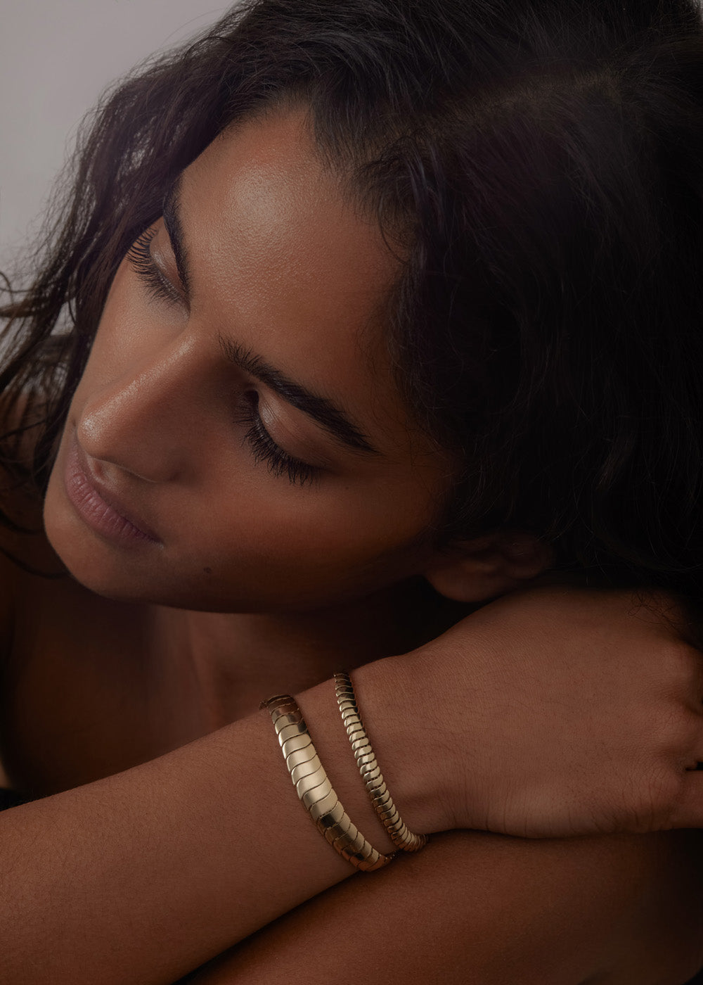 Our Cobra chain links are delicately crafted and hollow. Please handle with care, coiling and securely storing when not in use. For optimal longevity, it’s recommended to remove the bracelet during strenuous activities, as dented links cannot be repaired.