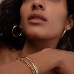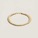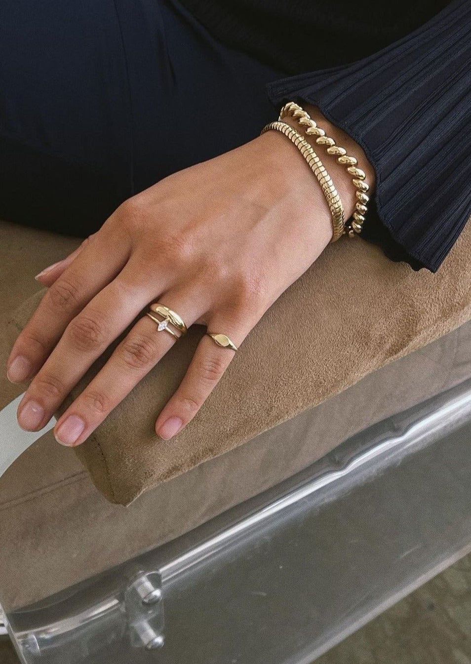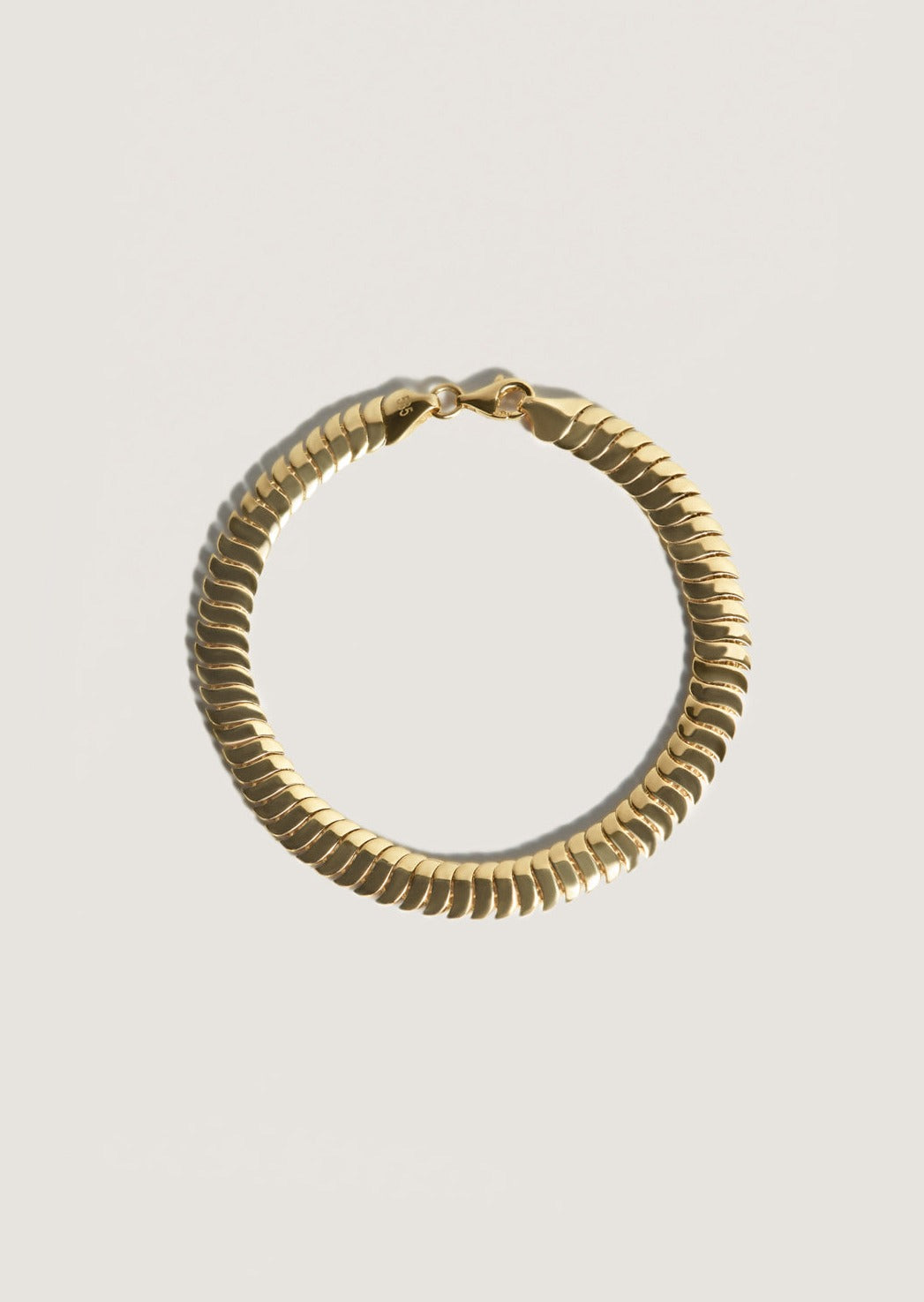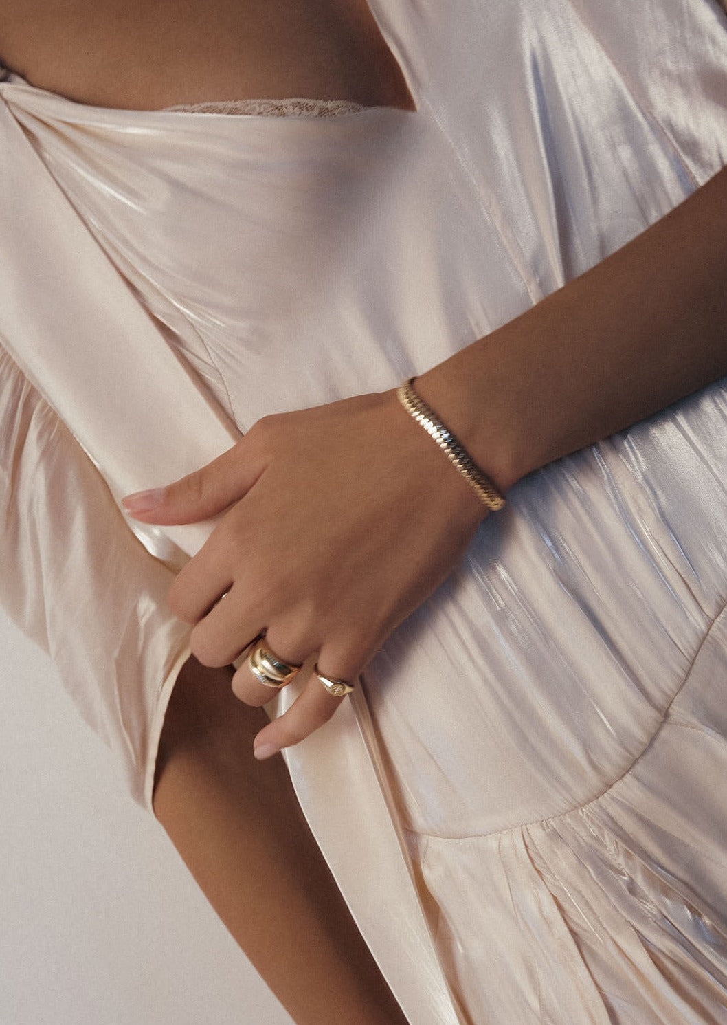 Our Cobra chain links are delicately crafted and hollow. Please handle with care, coiling and securely storing when not in use. For optimal longevity, it’s recommended to remove the bracelet during strenuous activities, as dented links cannot be repaired.