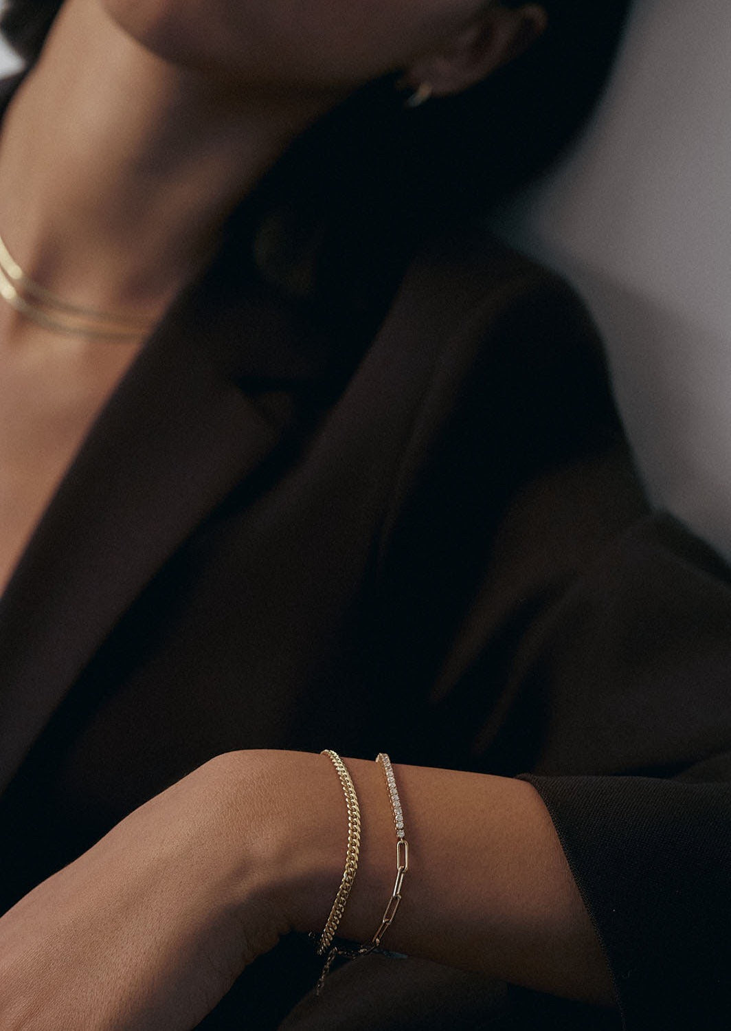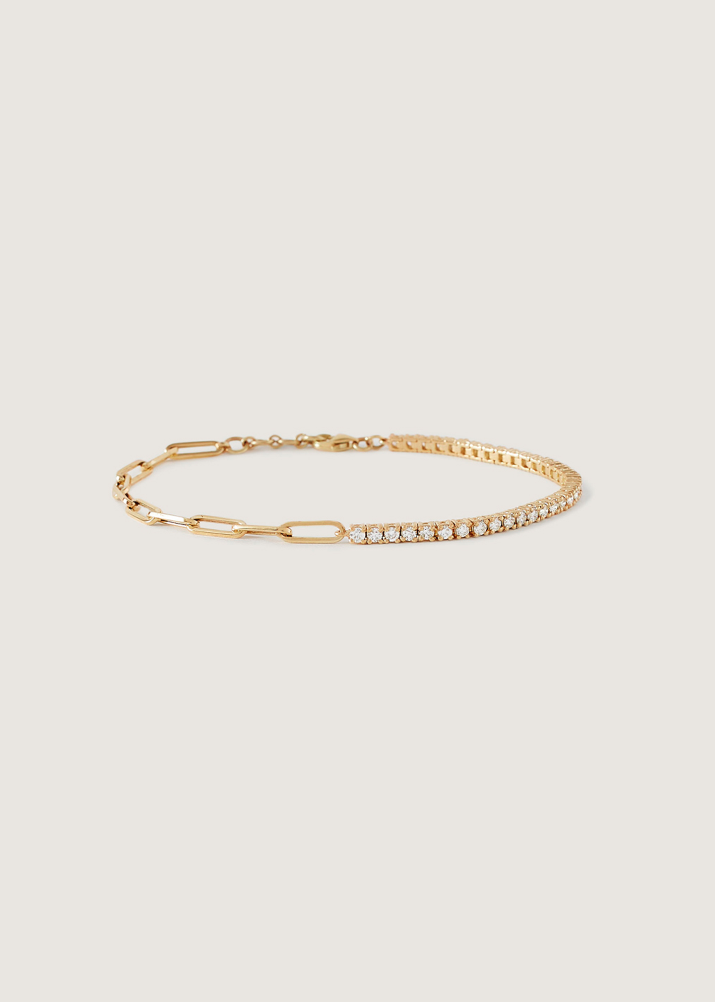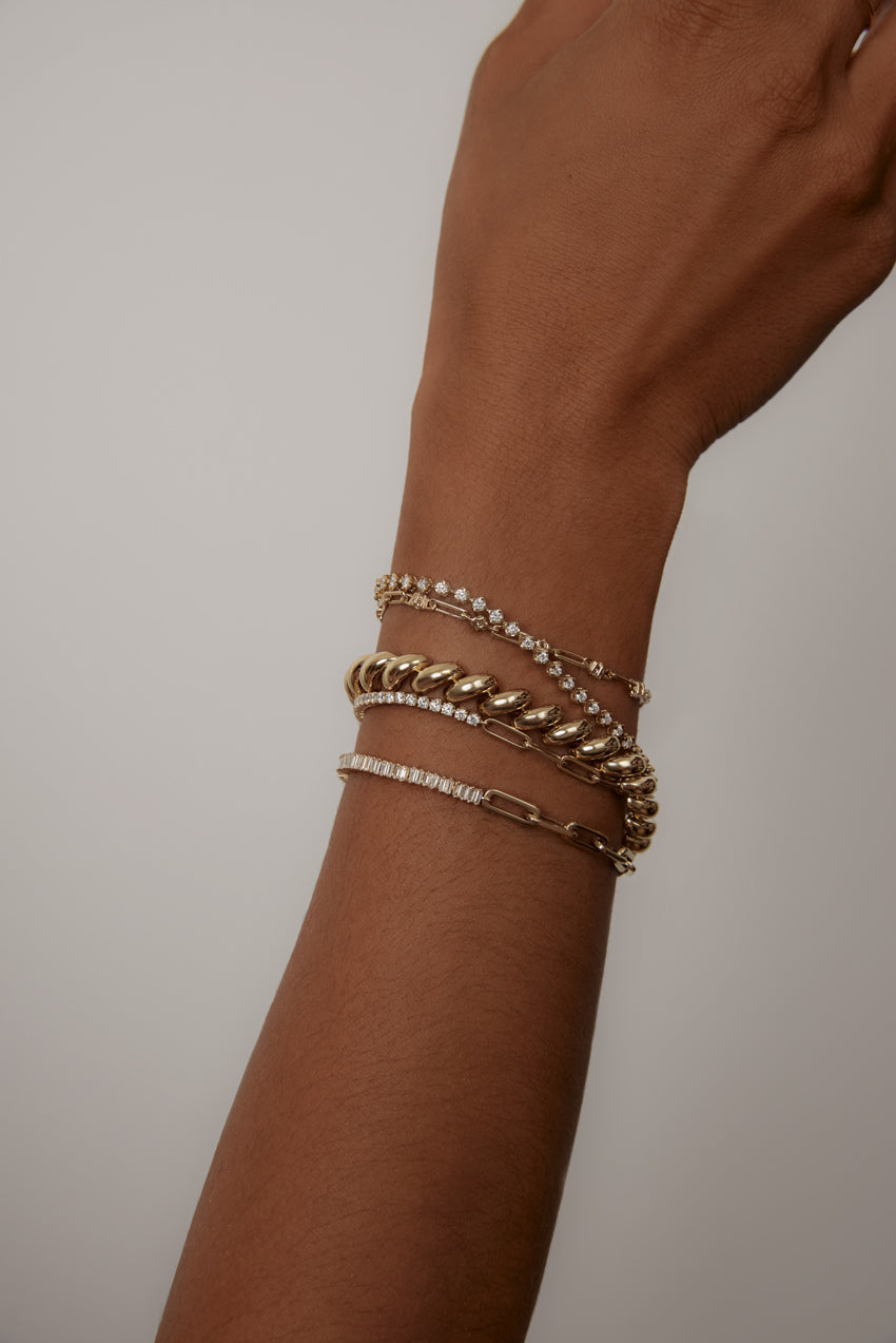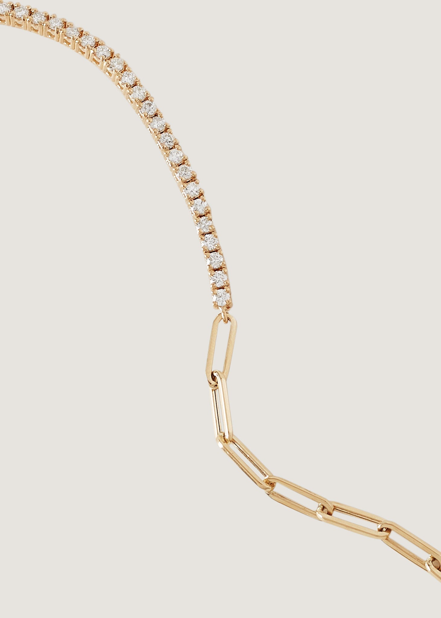 Half classic paperclip chain, half tennis bracelet, the Coco Round Tennis Link Bracelet is designed to be your new signature piece. Featuring 2mm round natural diamonds set in 14k yellow gold, it blends modern edge with timeless elegance.