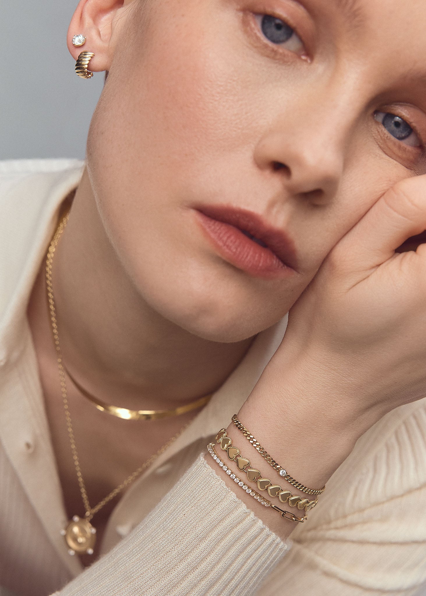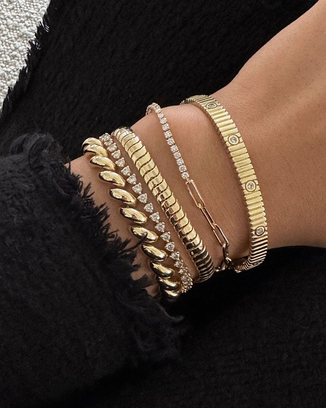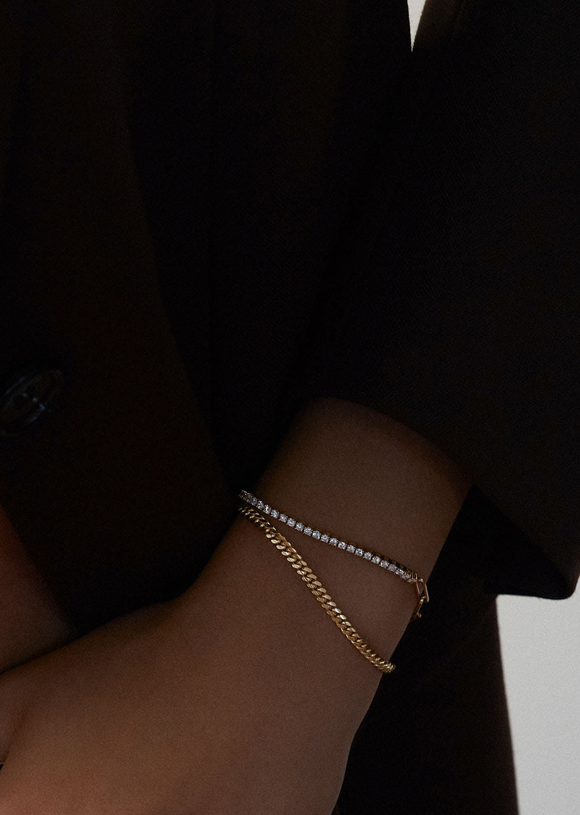 Half classic paperclip chain, half tennis bracelet, the Coco Round Tennis Link Bracelet is designed to be your new signature piece. Featuring 2mm round natural diamonds set in 14k yellow gold, it blends modern edge with timeless elegance.