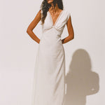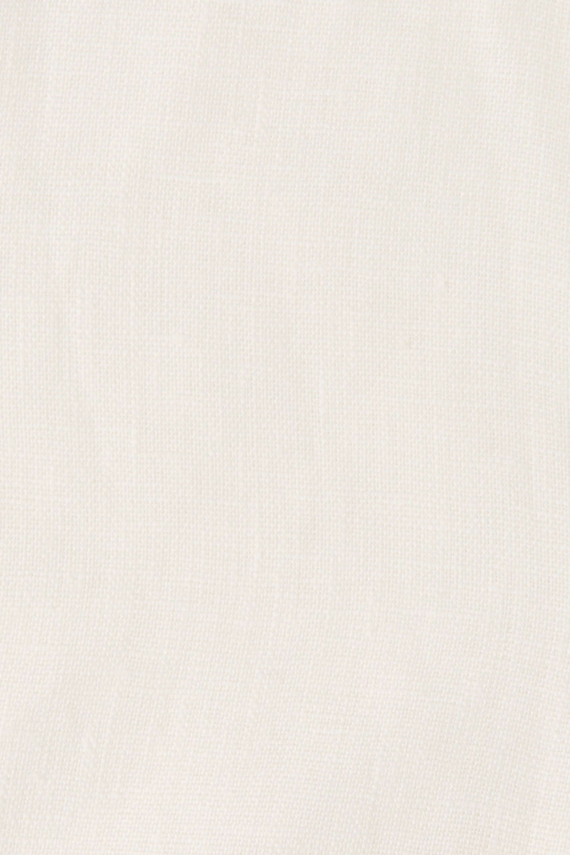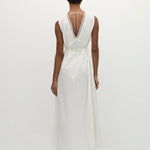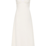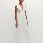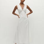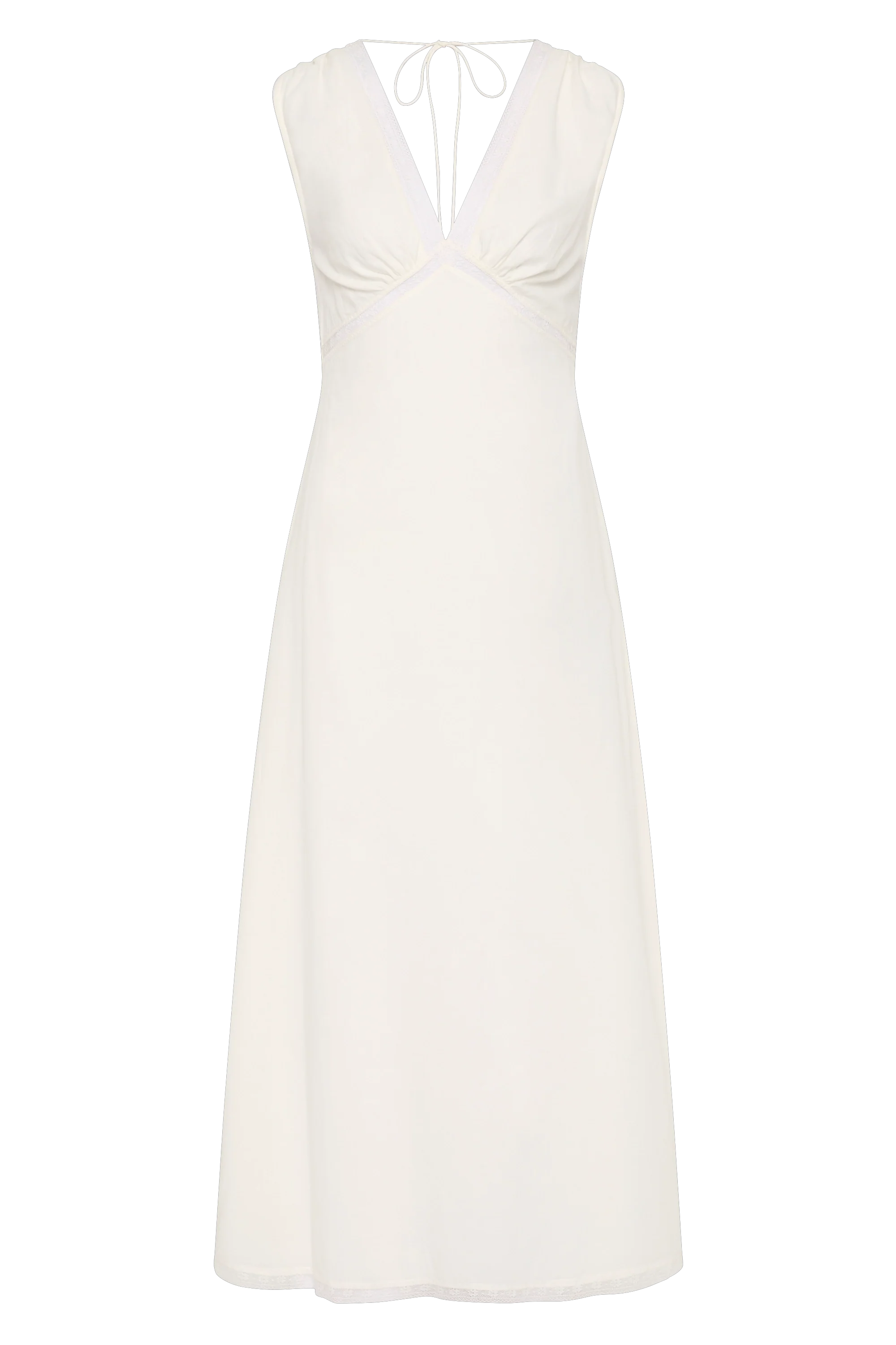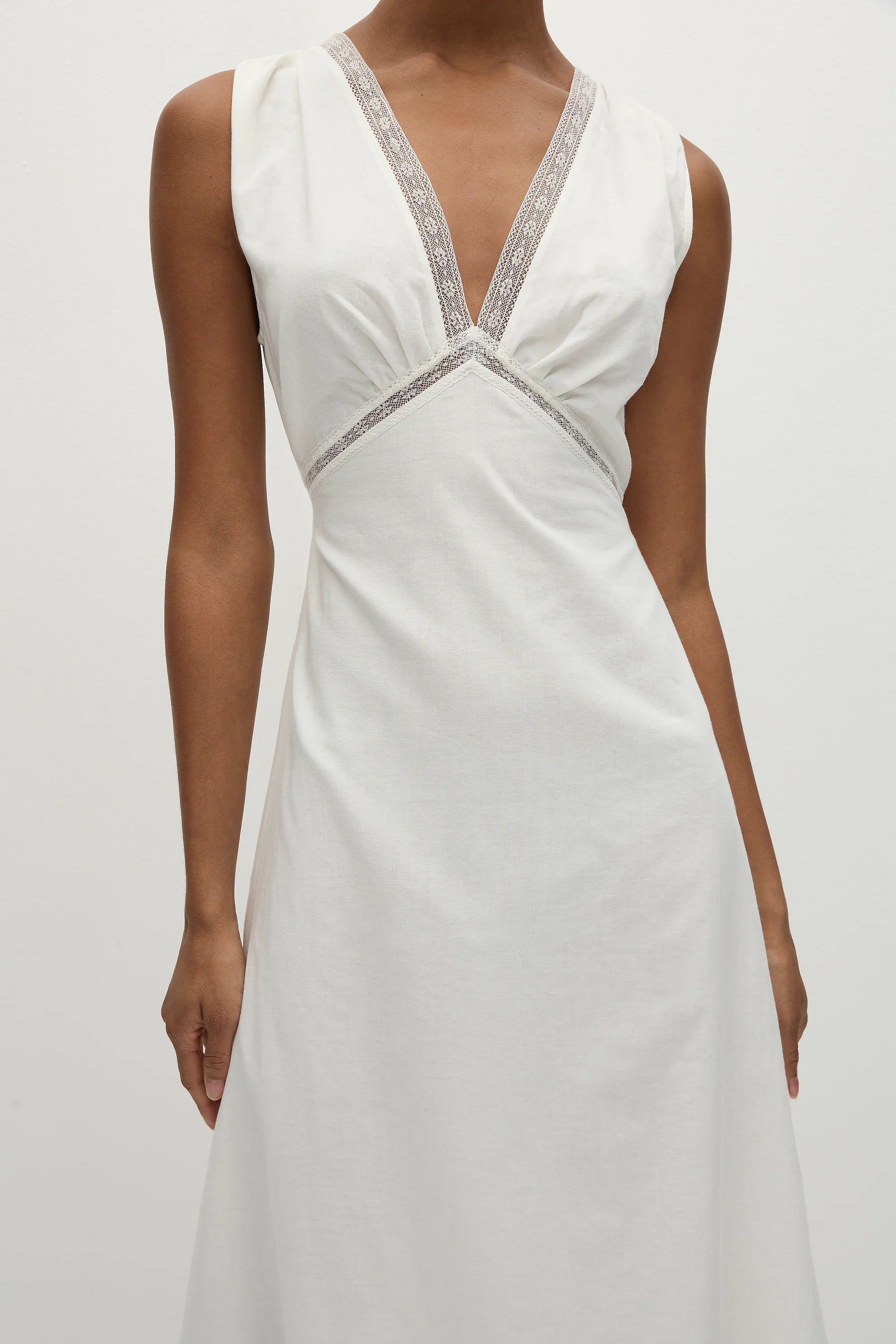 A midi dress with a deep V-neckline and wide straps that sit up on the shoulders. Designed from a delicate cotton voile in a warm white, it features vintage-inspired lace detailing around the neckline, under the bust and around the hem. There are back waist ties which allow for custom cinching and the skirt flares out in a soft A-line, cropping above the ankles. Style with a simple sandal for elevated everyday dressing.