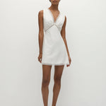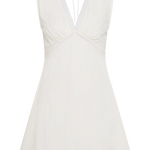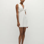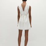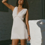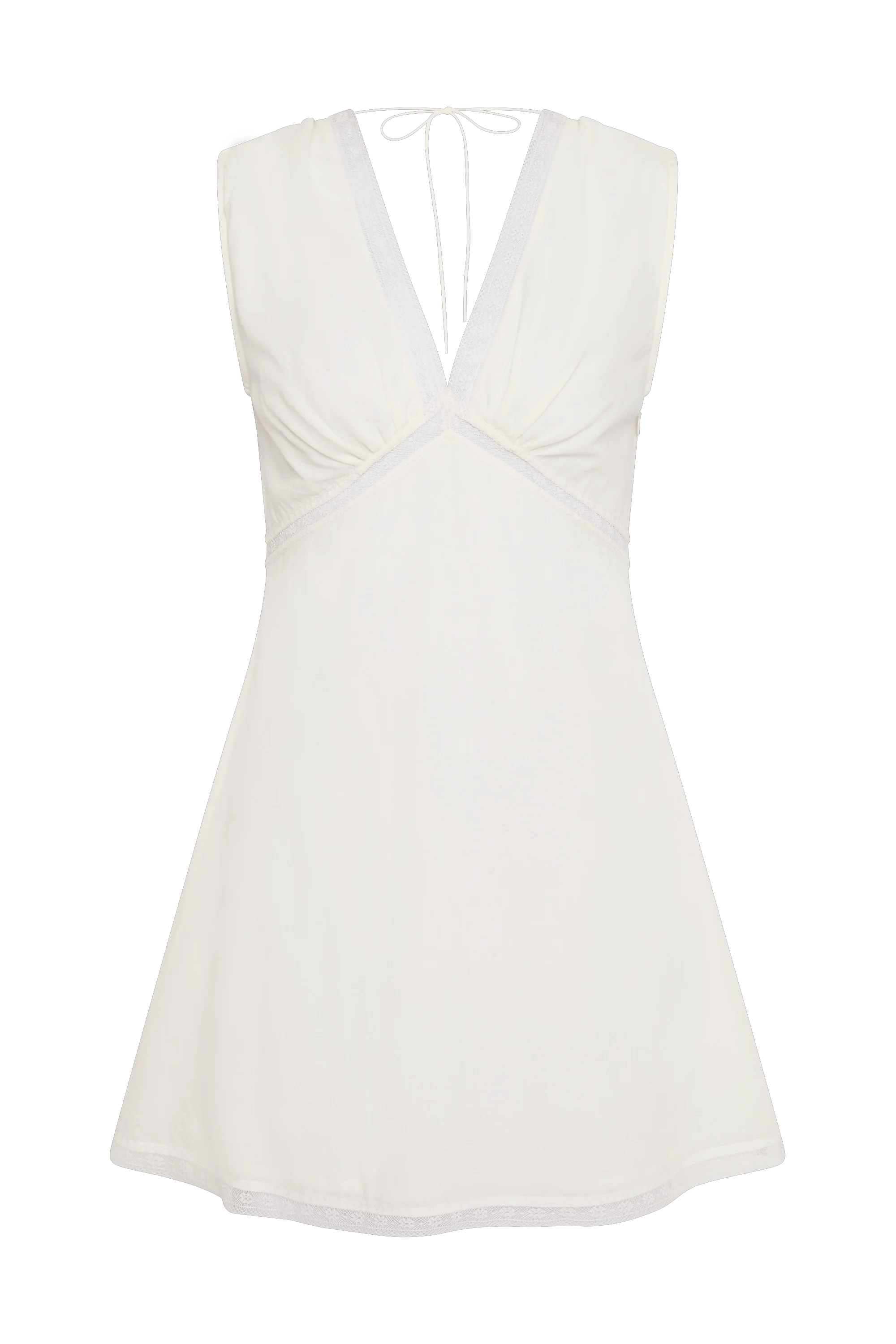 A mini dress with a deep V-neckline and wide straps that sit up on the shoulders. Designed from a delicate cotton voile in a warm white, it features vintage-inspired lace detailing around the neckline, under the bust and around the hem. There are back waist ties which allow for custom cinching and the skirt flares out in a soft A-line. Style with a simple sandal elevated everyday dressing.