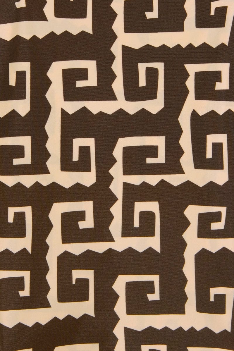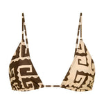 Mindfully made from certified recycled nylon, the Desima Bikini Top in Playa Minizo features sliding triangle cups, thin over the shoulder straps and a back tie closure. Patterned all over with a brown and beige island motif and spliced at the front. Pair it with the Mérida Bikini Bottoms for a matching set.