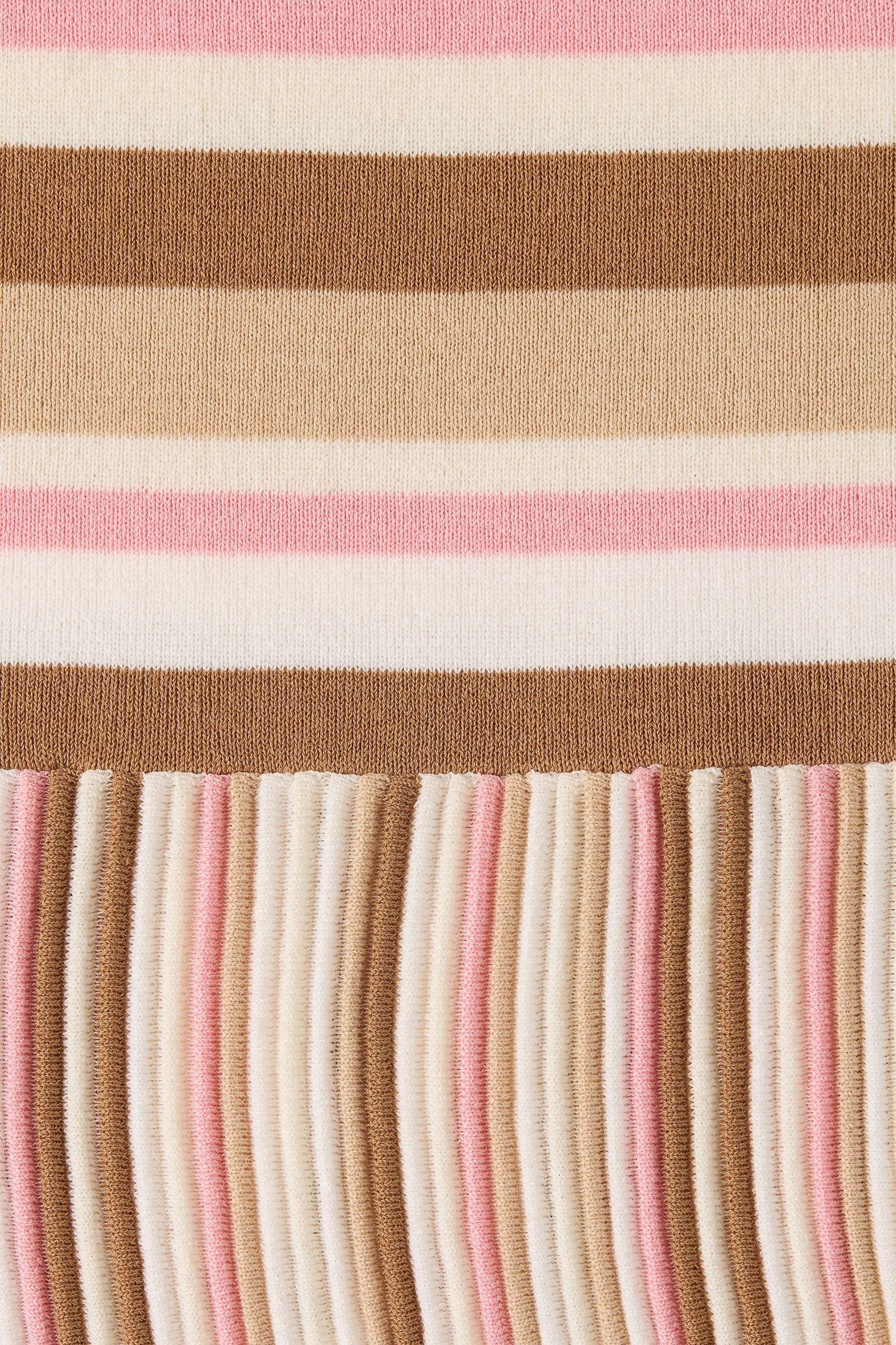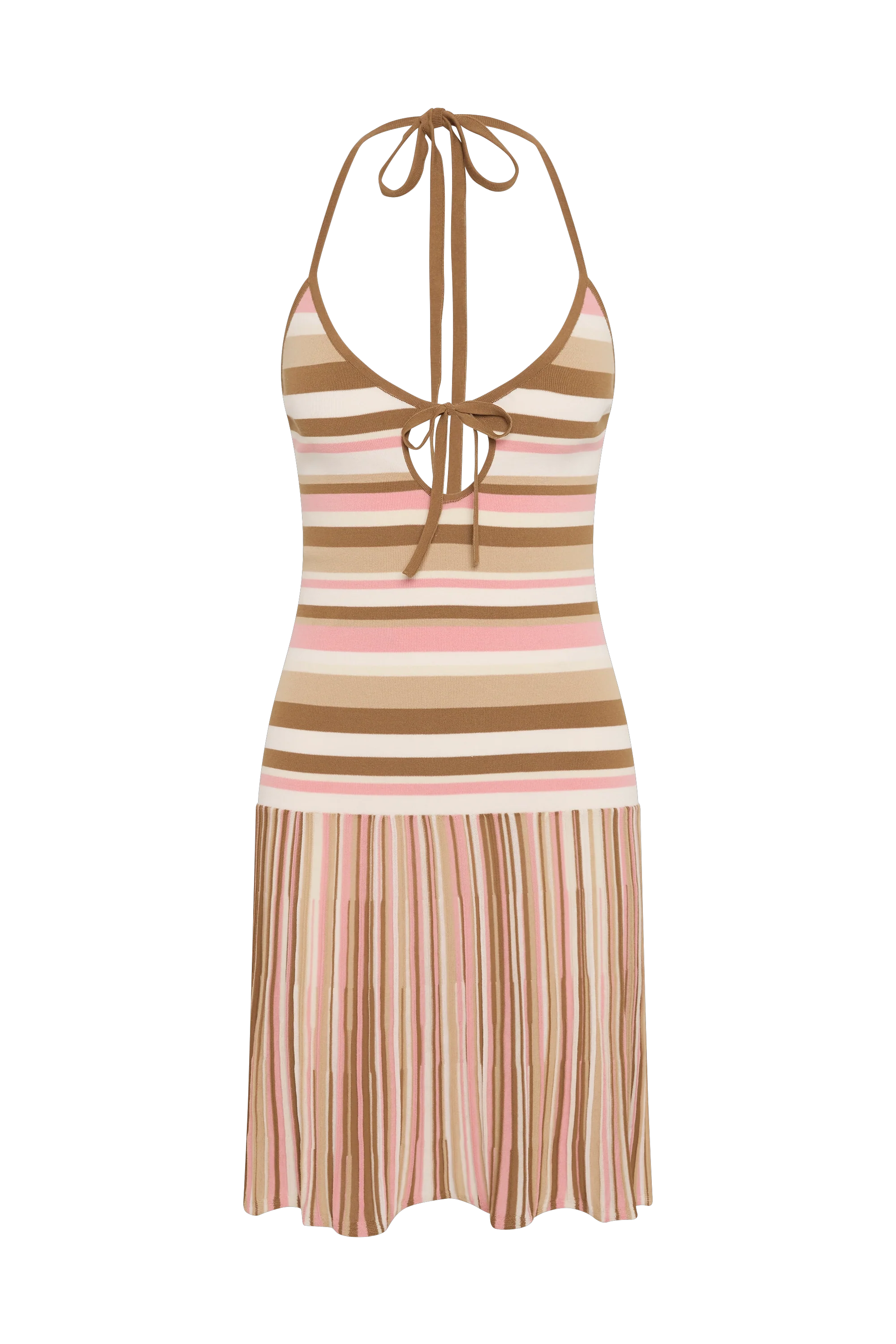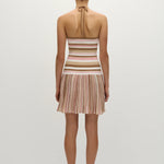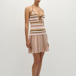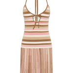 A new iteration of the beloved Citara silhouette, it is a mini dress with a scooped neckline and halterneck with delicate tie details. At the front bust there is a keyhole and tie detail for a feminine touch. Fitted through the bodice, it then flares into a soft A-line skirt that crops short above the knees. Designed from a uniquely ribbed true knitwear fabrication, blending cotton and nylon in a signature neapolitan stripe with pink and brown tones, inspired by nostalgic summers of childhoods past, style with a simple sandal for a FAITHFULL approach to vacation dressing.