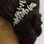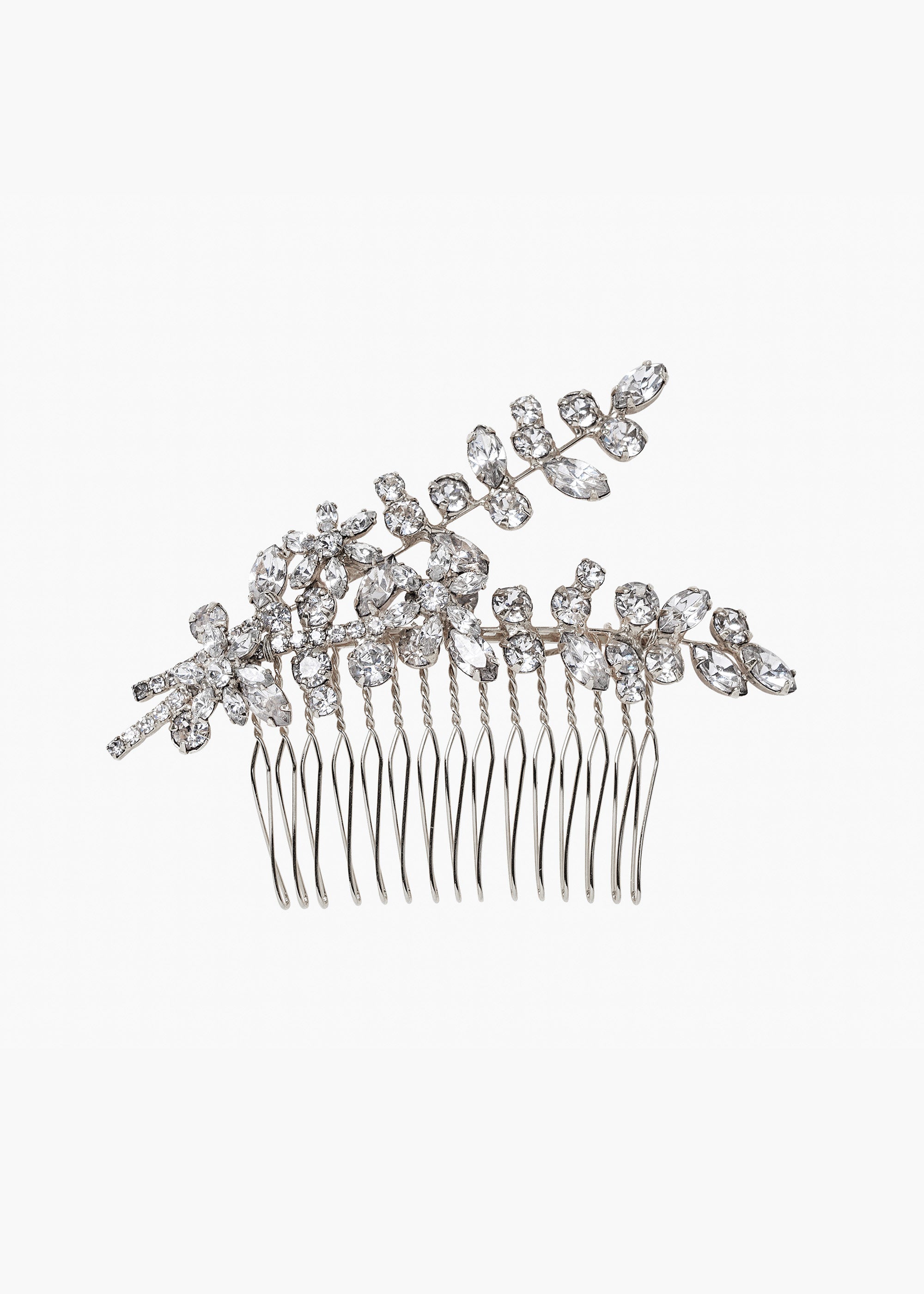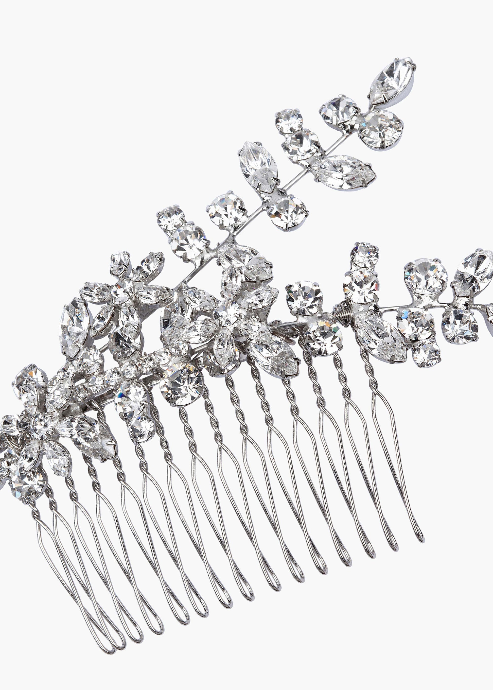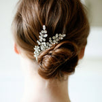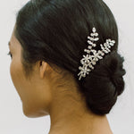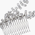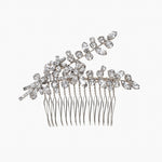 The Elissa Comb features a romantic botanical motif, with Swarovski crystals forming a floral arrangement in the hair. The best part is, this future-heirloom will last much longer than fresh blooms. The Elissa Comb can be worn countless ways, with hair up or down, and can be paired with a veil as well. Dimensions: 4 x 2.25 inches Weight: 25g
