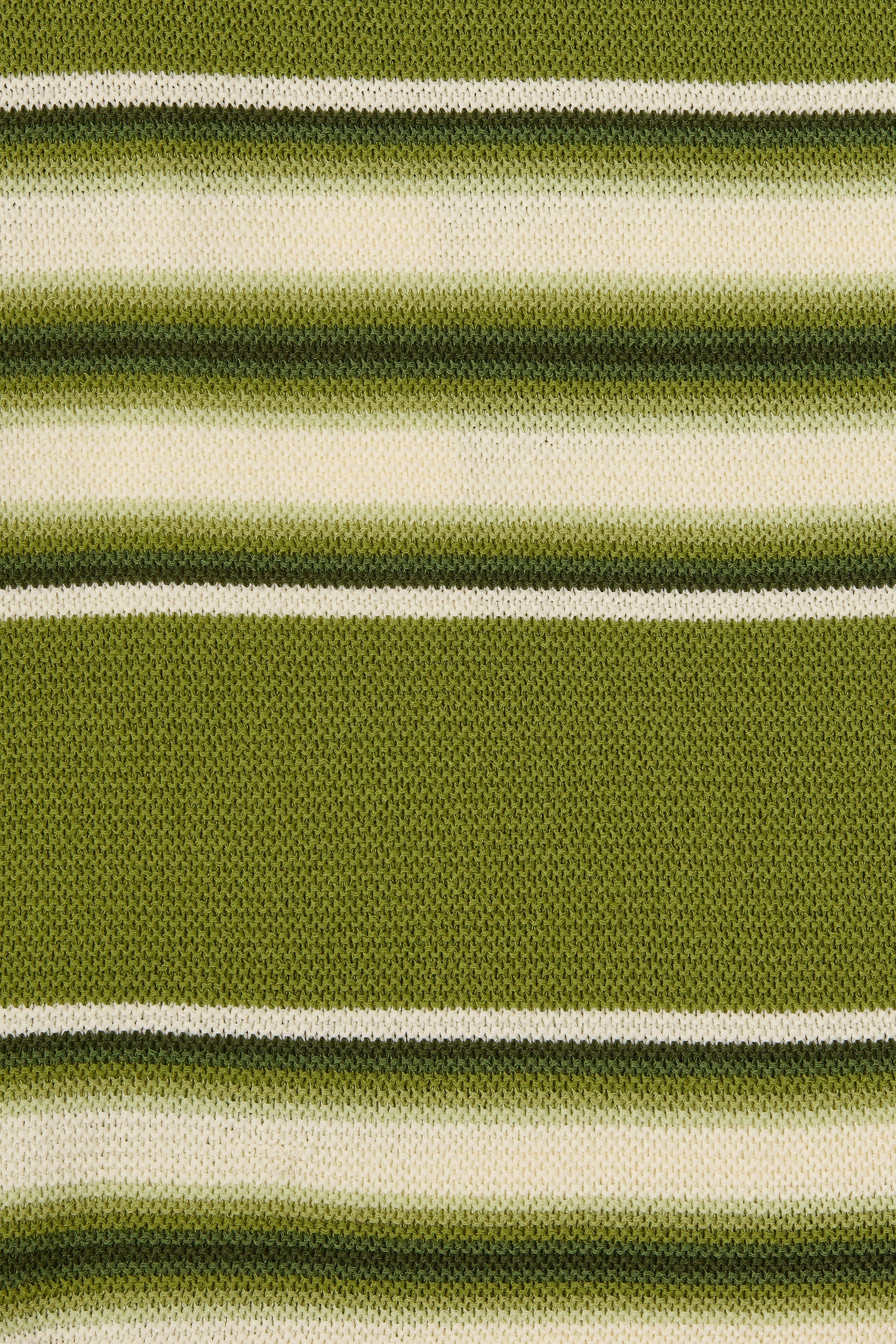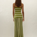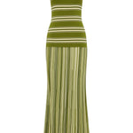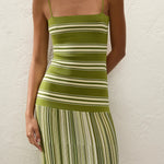 A maxi dress, designed from a signature true knitwear fabrication in a vibrant green stripe. Fitted through the bodice with a straight neckline and thin straps, adjustable in length, it then falls into a soft silhouette with a relaxed skirt that crops around the ankles. Style with a simple sandal for a unique approach to occasionwear dressing.