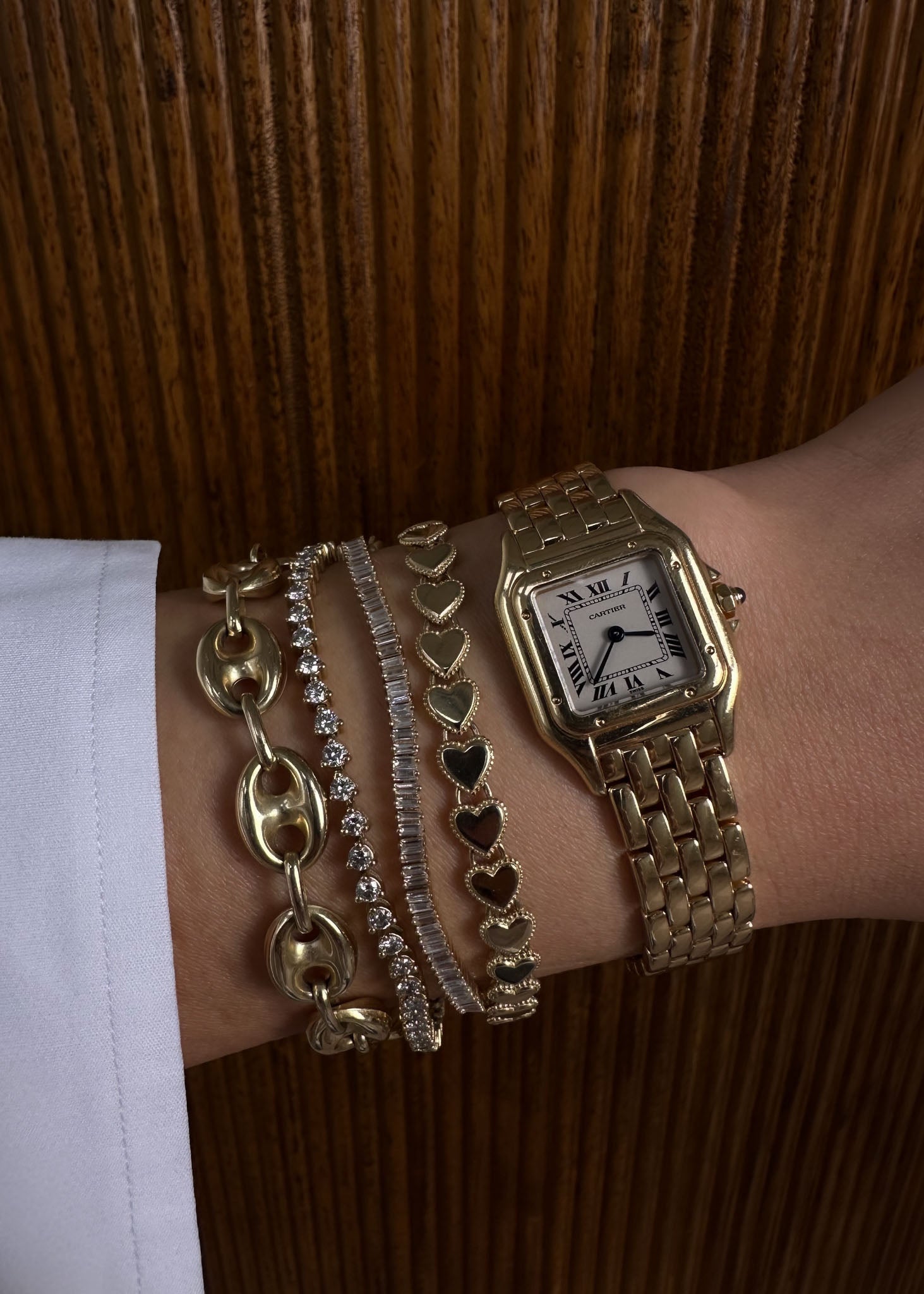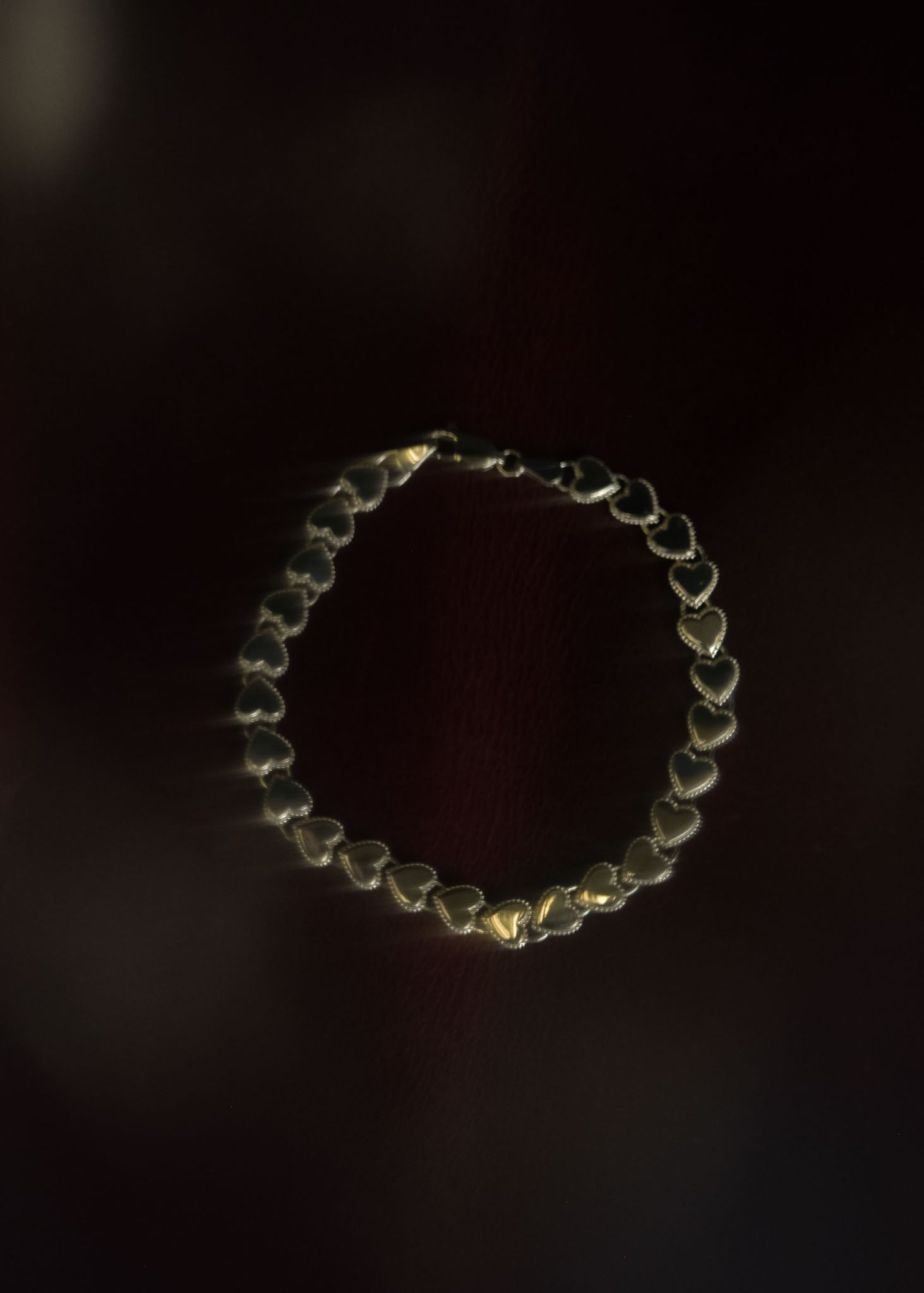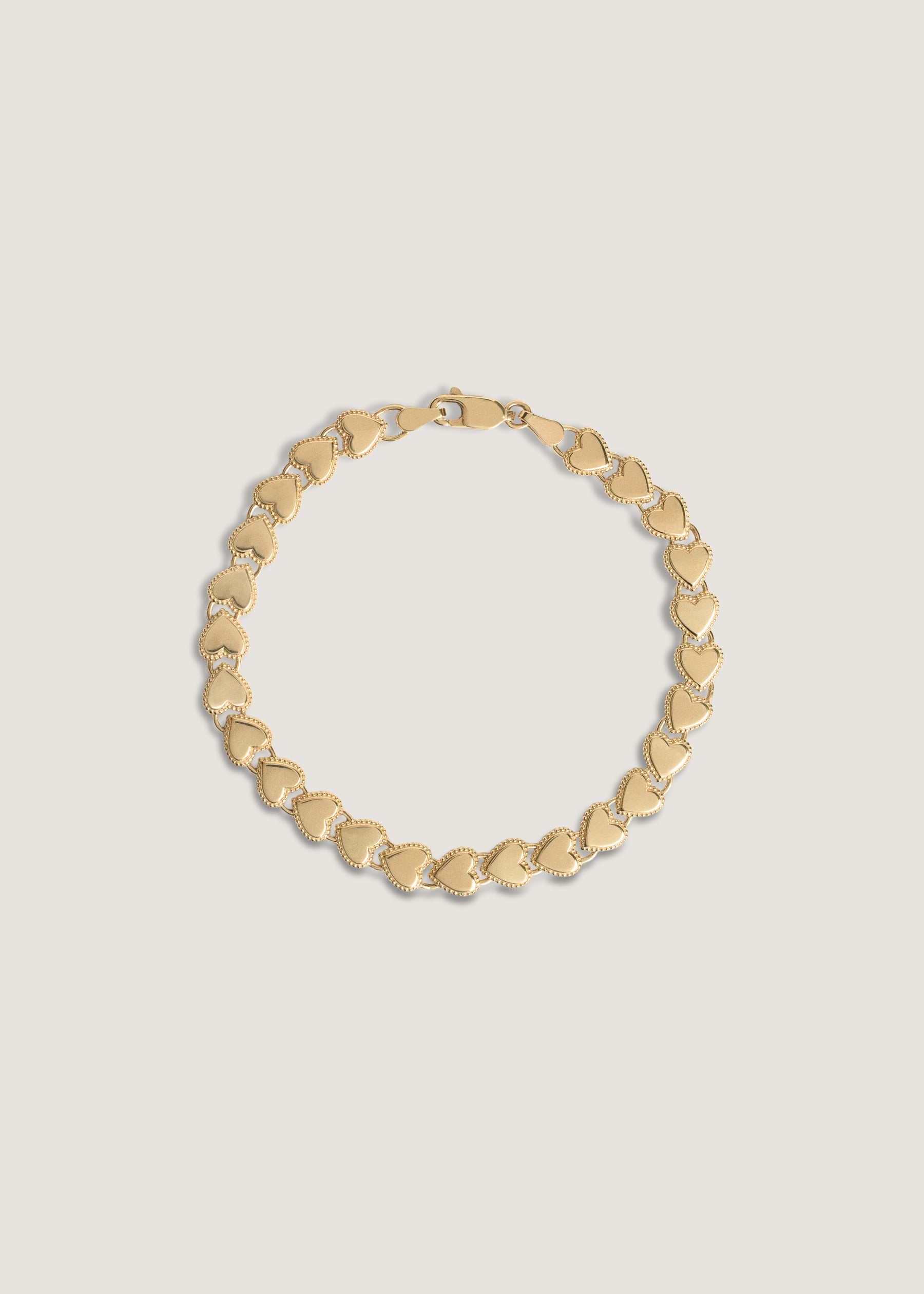 The hero piece from our Your Move Campaign, the Eternity Heart Chain Bracelet is a vintage inspired modern heirloom. Crafted with 14k solid gold, each individual heart is linked together by hand.