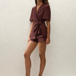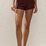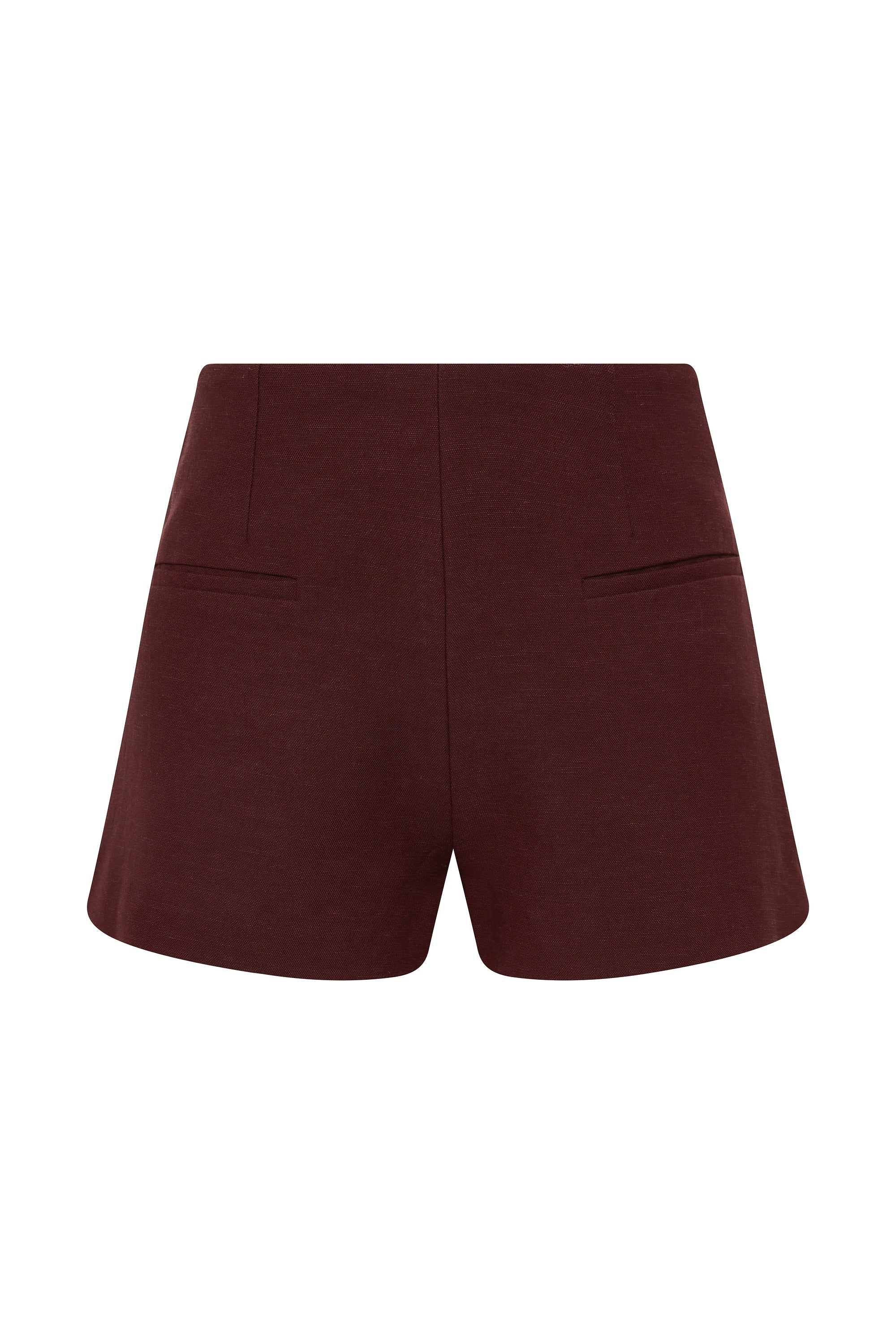A mid-rise mini short, designed from a signature soft tailoring fabrication, blending viscose, tencel, rayon and European Flax® linen, in a deep chestnut brown. Sitting comfortably at the hips, they feature single welt pockets and a straight silhouette that crops short on the body. Style with the matching Ida Knot Blazer for a summer-approach to suiting.