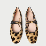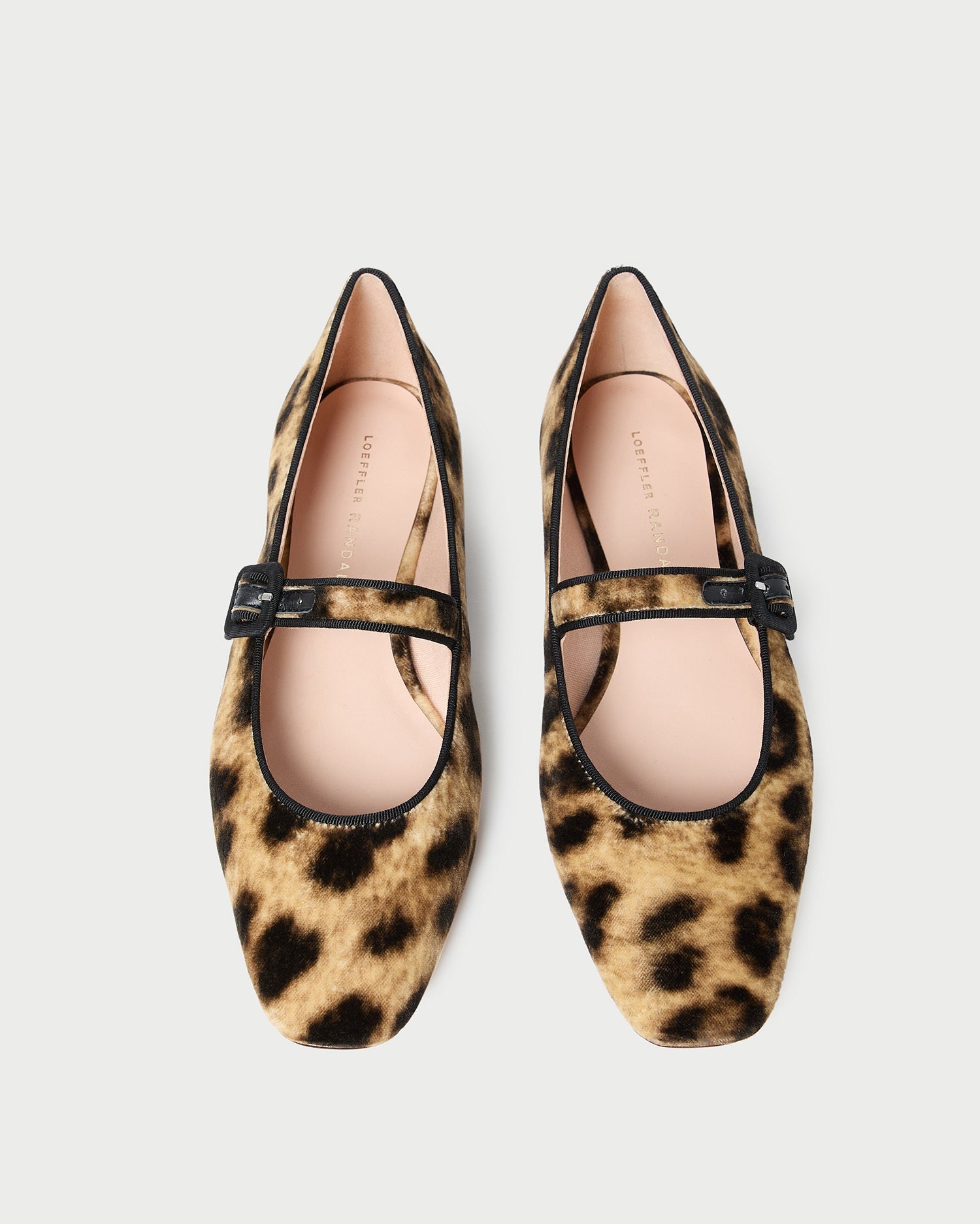 Mary Jane flat in leopard Italian velvet with delicate black piping. Features a padded leather footbed with gold stamped logo, a square toe, and an adjustable bridge strap with buckle closure.