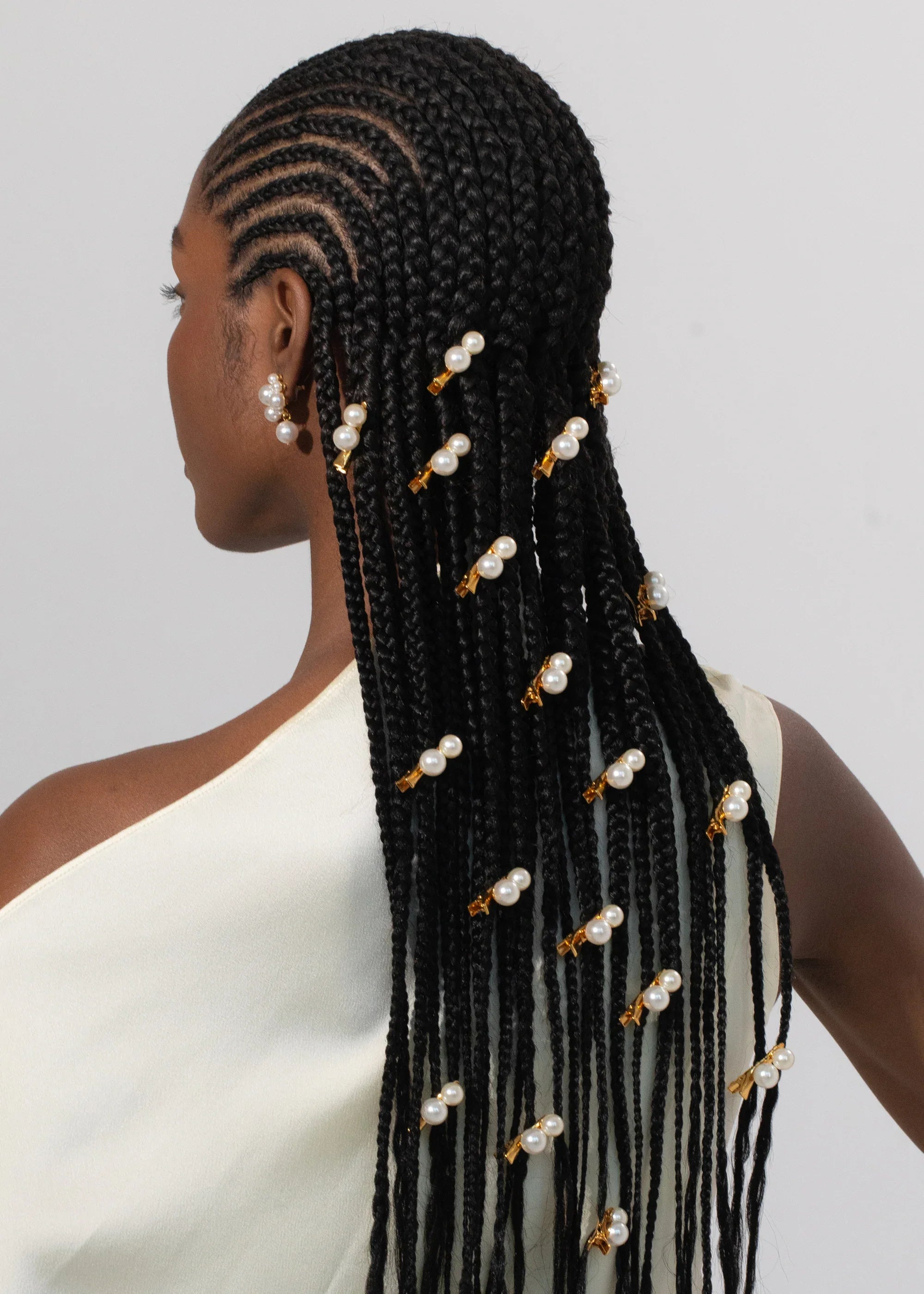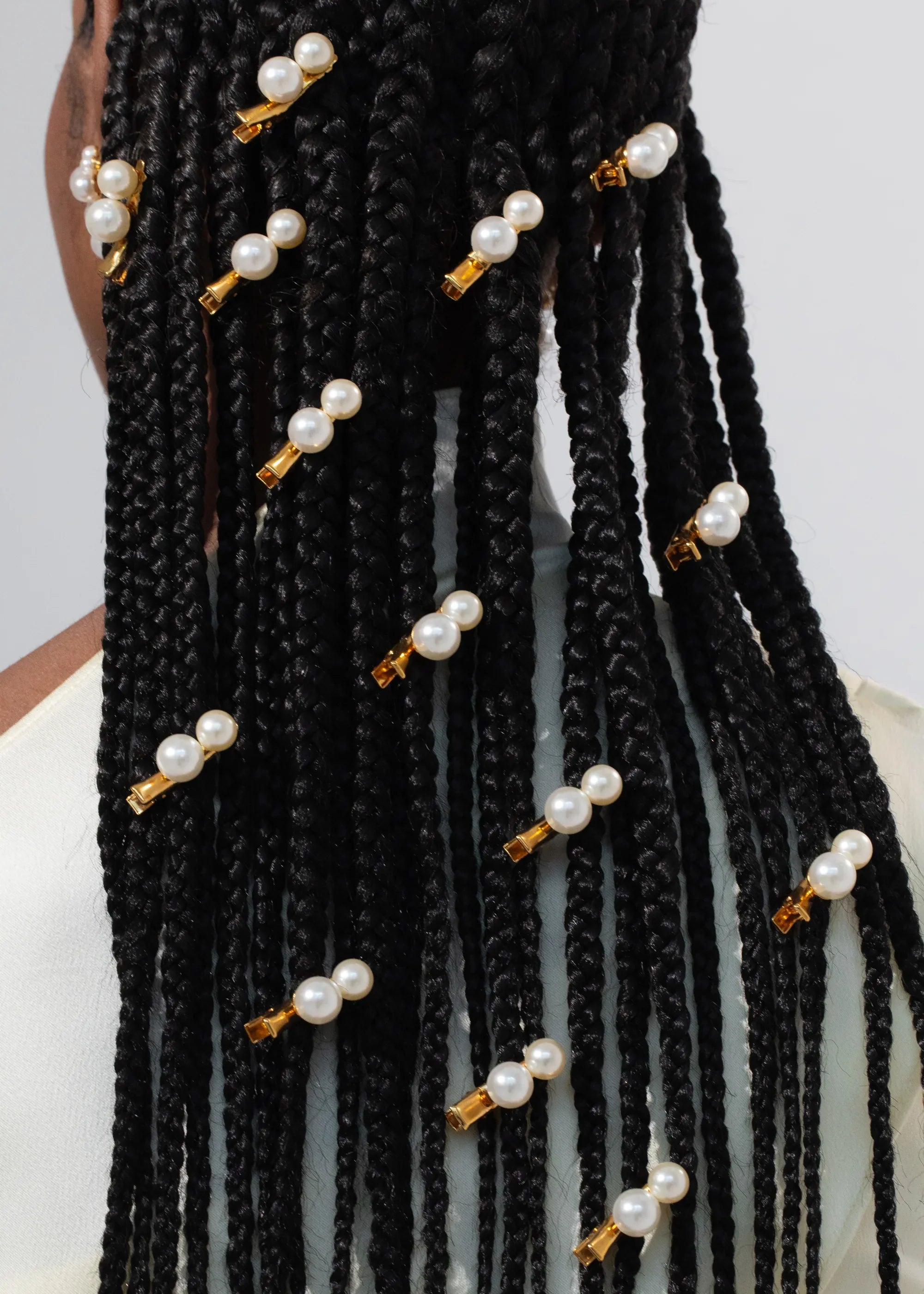 Giving the illusion of pearls floating in the hair, the Gretel Hair Clips are a set of two that can easily be styled for a variety of occasions, whether worn to pin back bangs or incorporated into an evening look. Made by hand in New York, each clip showcases a luminescent Czech crystal pearl, carefully set on an 18-karat gold-plated clip. The alligator clip makes for secure placement in the hair, and makes it easy to layer multiple sets at once. Dimensions: 7/8 inch height, 1 1/8 inch length
