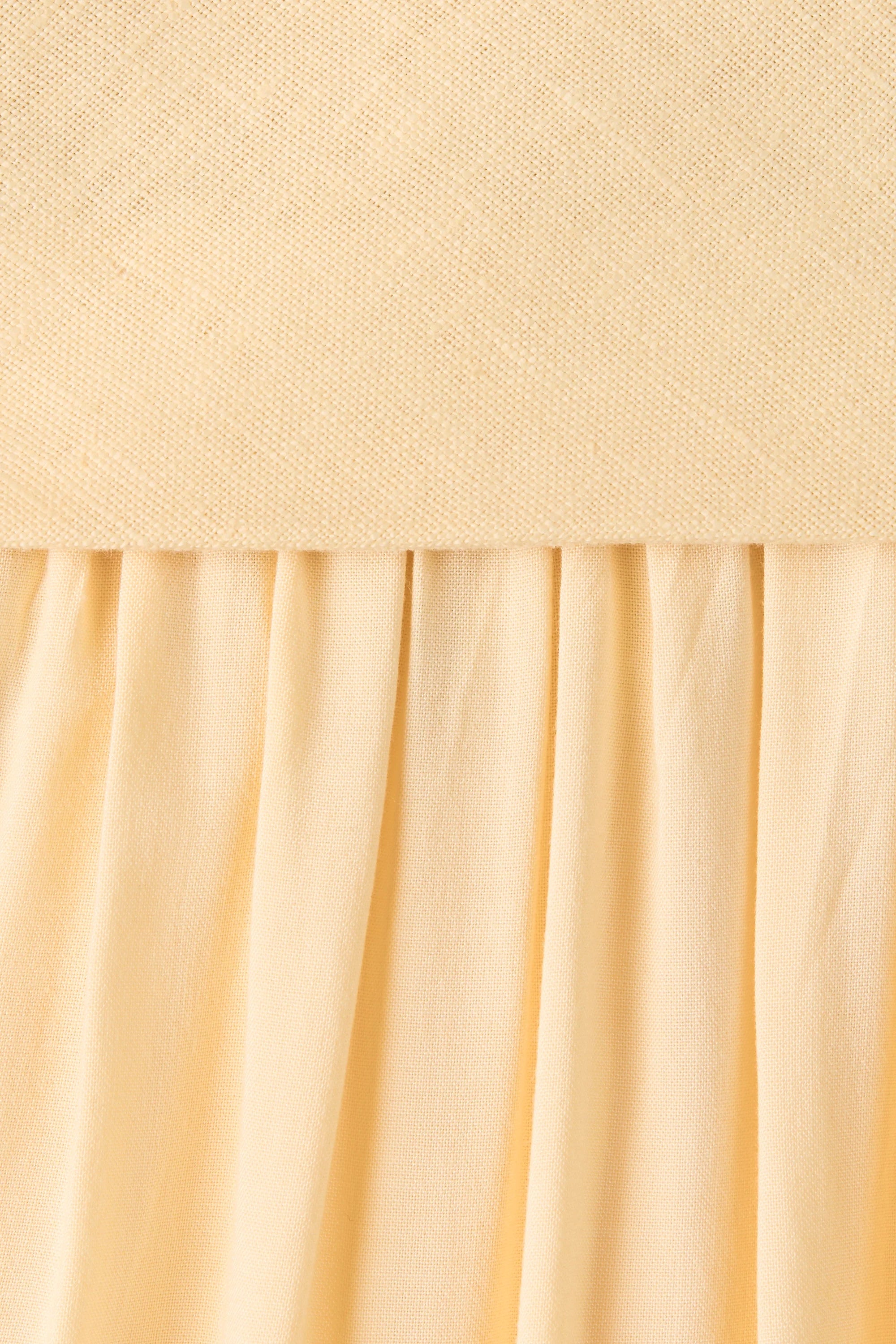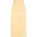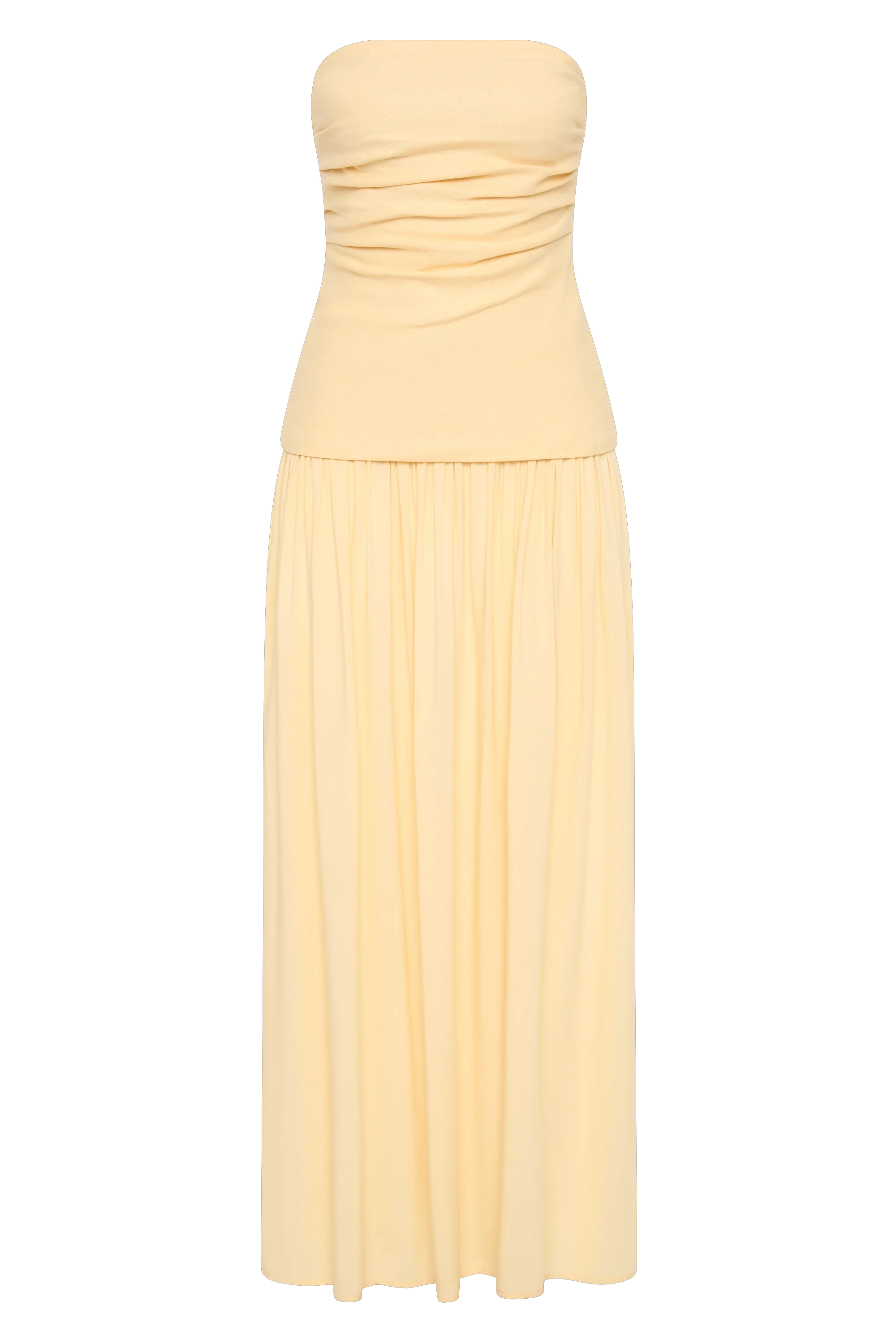 The silhouette of the season. A maxi dress with a fitted bodice designed from a signature 100% European Flax® linen fabrication, with gathered detailing across the front. It features a drop waist with a soft gathered skirt that flares into a slight A-line shape, cropping below the ankles. The skirt is designed from a rayon fabrication, offering a unique contrast to the bodice. In a buttery yellow, wear with a simple heel for effortless yet elevated occasion wear.