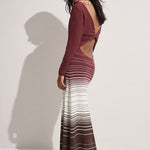 A late summer-inspired maxi dress with a relaxed boat neckline and long rounded sleeves, fitted at the wrists. Slightly oversized in the bodice, it offers an open back with a twisted knot detail in the centre. The silhouette is then fitted through the hips in a drop waist-style before flaring out into a soft floor-grazing skirt. Designed from a blend of cotton and nylon in a true knitwear fabrication, it is offered in a deep bordeaux, chocolate brown and cream stripe. Style with a kitten heel for your next occasion.
