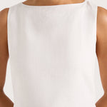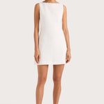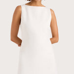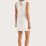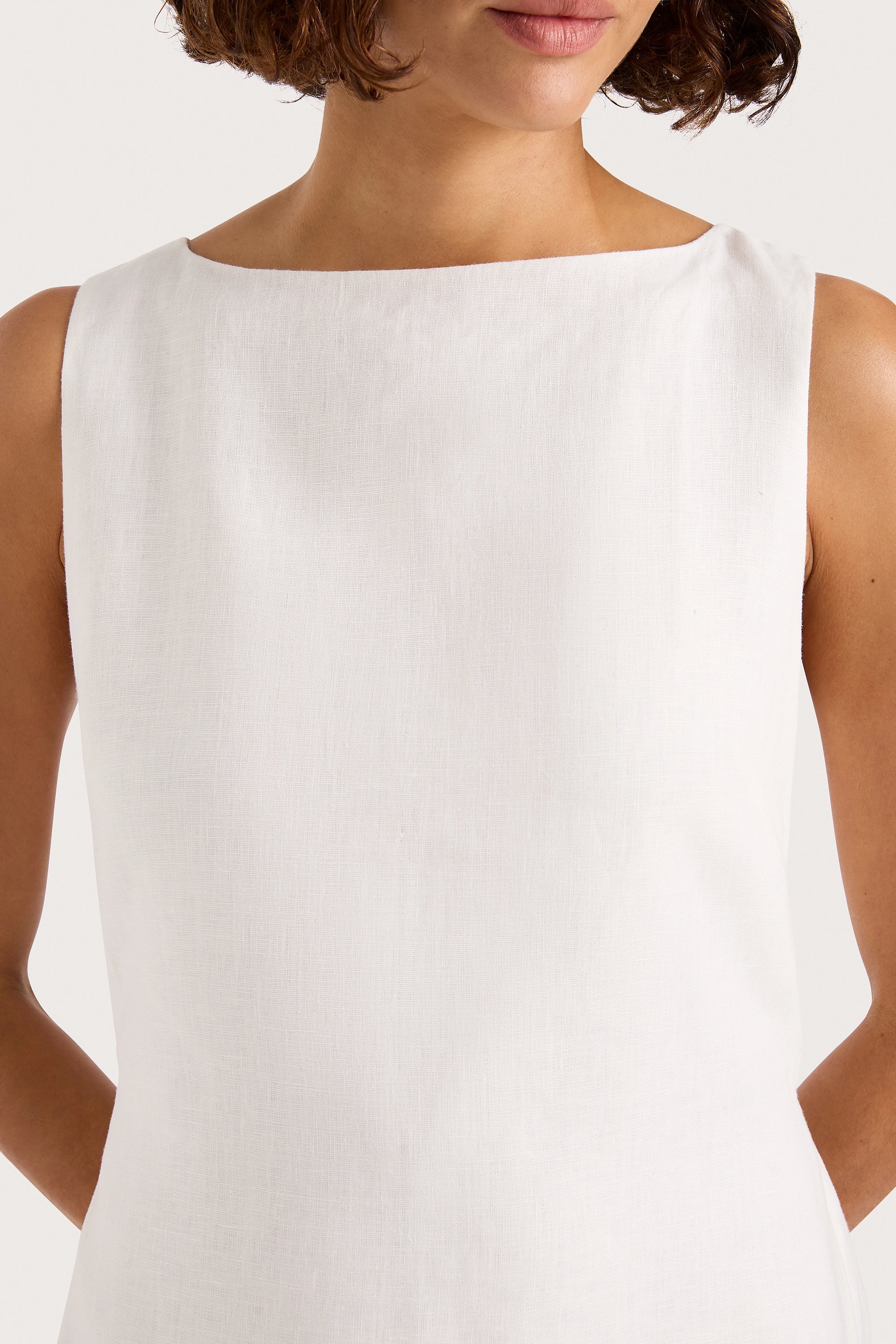 A signature FAITHFULL silhouette, reimagined with new elevated details and designed from a 100% European Flax® linen fabrication. It is a sleeveless mini dress with a boat-style neckline and wide straps. It sits comfortably on the body with a smooth finish, before flaring into a slight A-line skirt. There is a keyhole detail at the back neck and a back waist tie, adjustable to tie in a knot or a bow. Fully lined and offered in a creamy white, style with simple accessories for summer-inspired everyday wear or vacation wear.