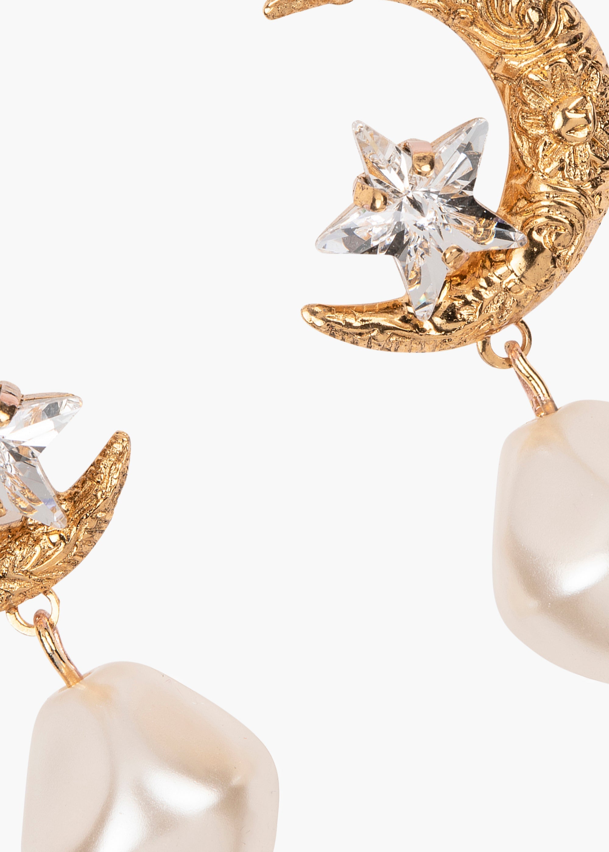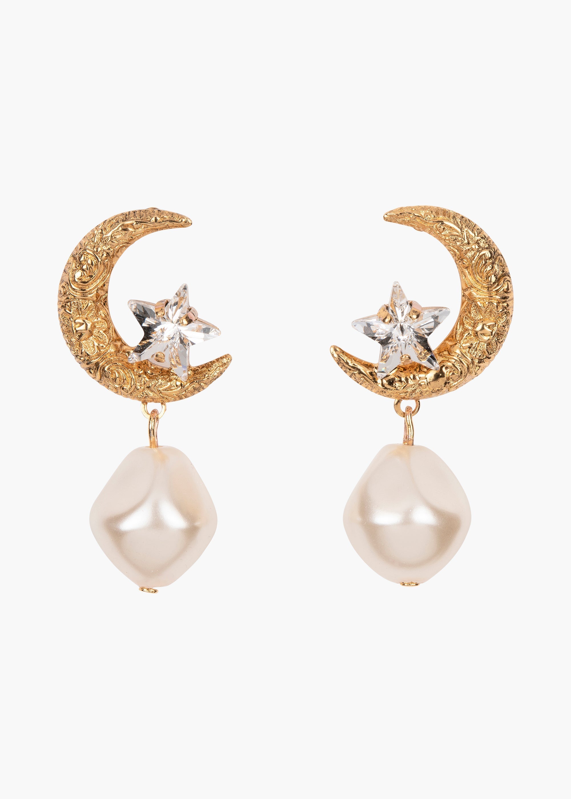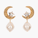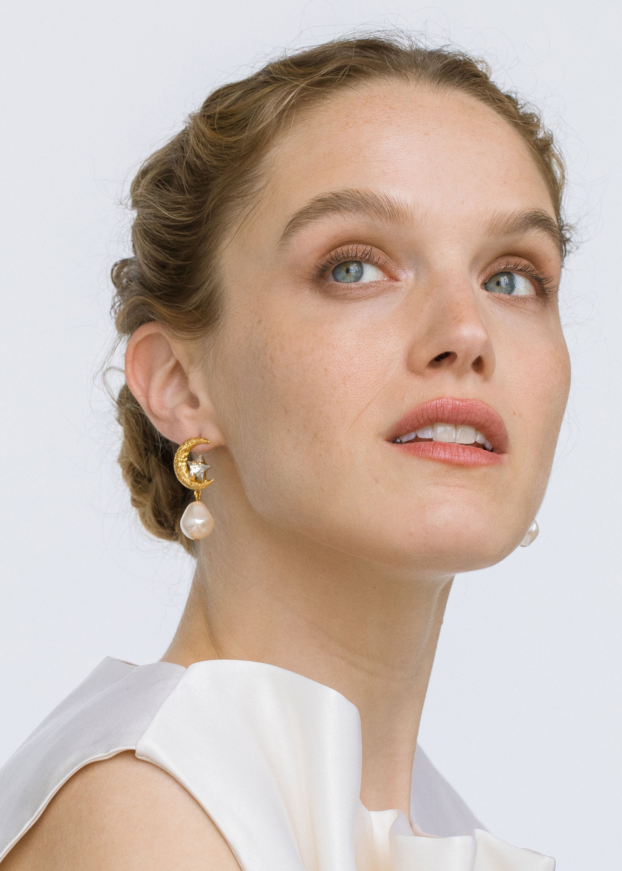 The Lune Earrings feature a gold moon with carefully carved detail. These earrings celebrate the inspiration of the moon as a symbol of femininity, wisdom, and spiritual connection. A tiny crystal star is nestled in the crook of the moon, and a baroque-style pearl adds a feminine touch. Explore more styles from The Celestial Edit.