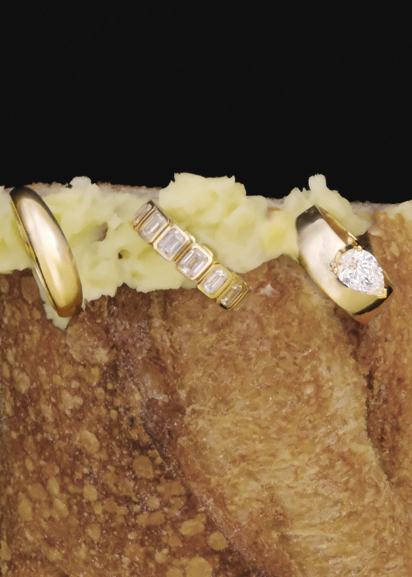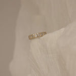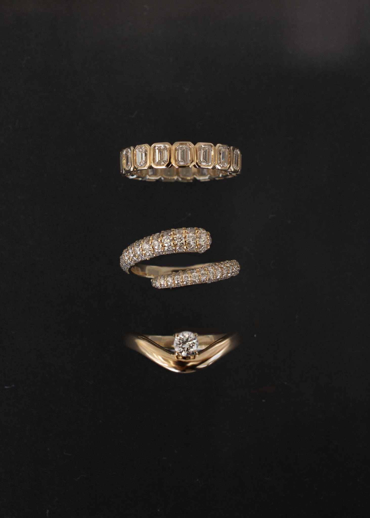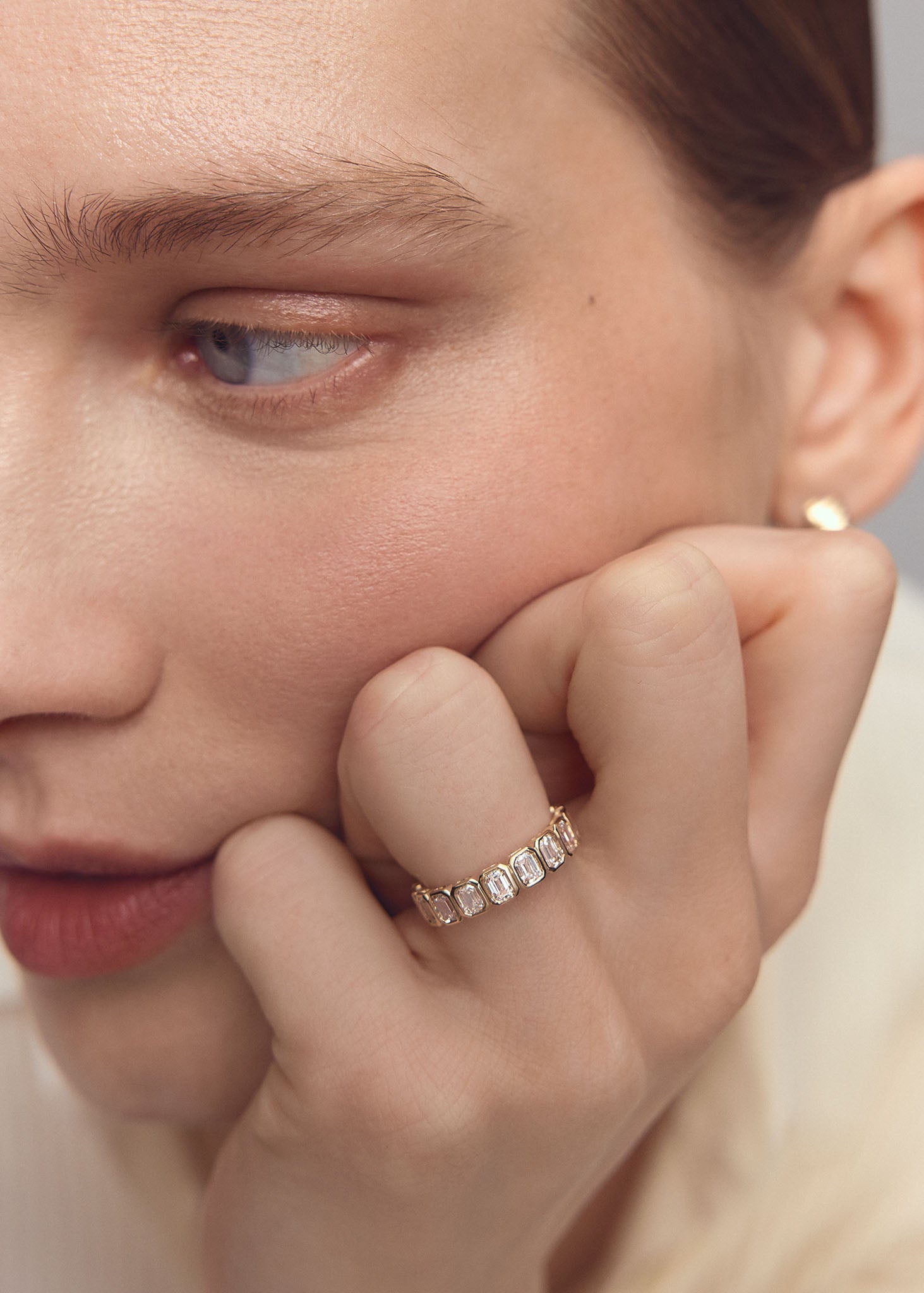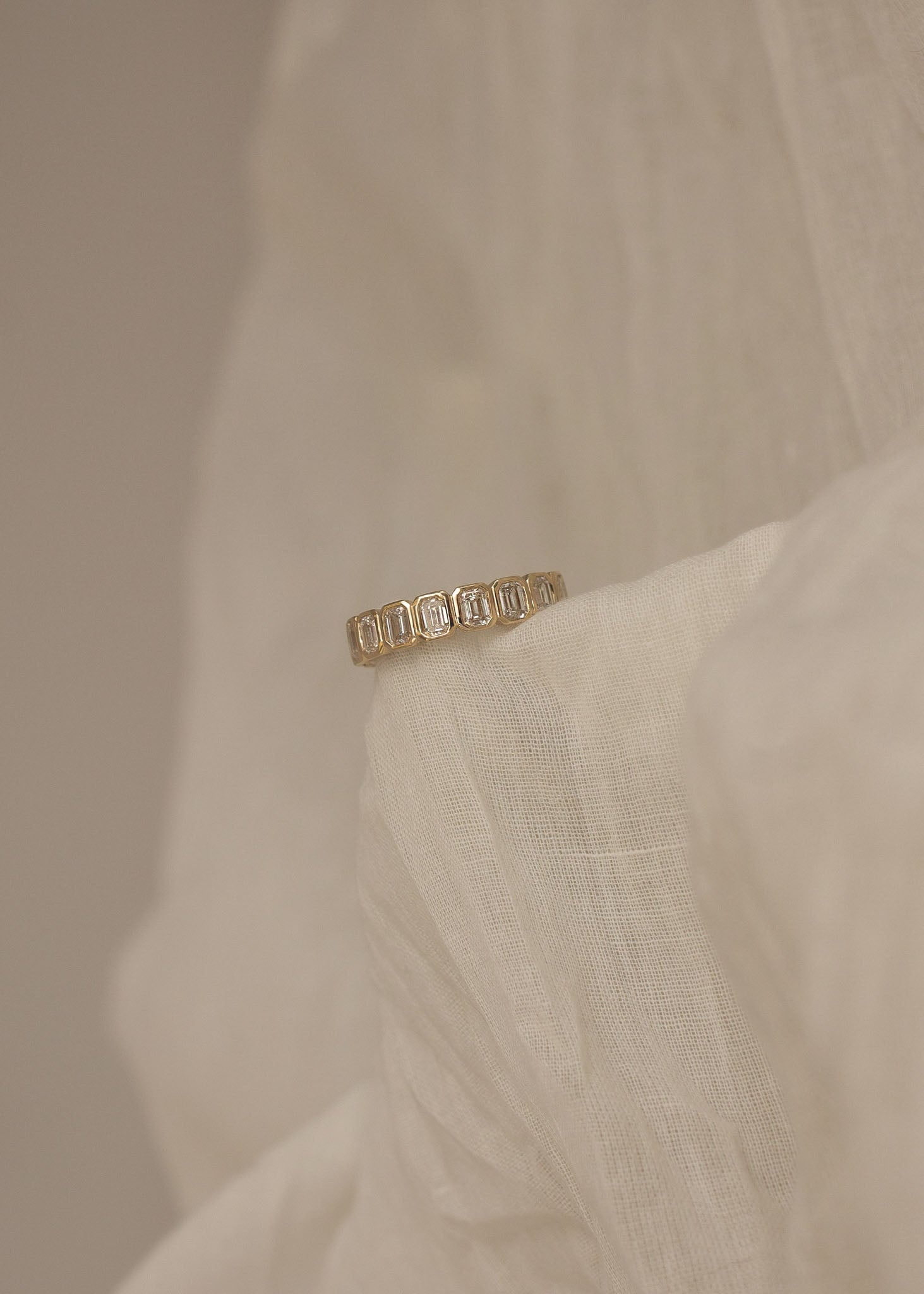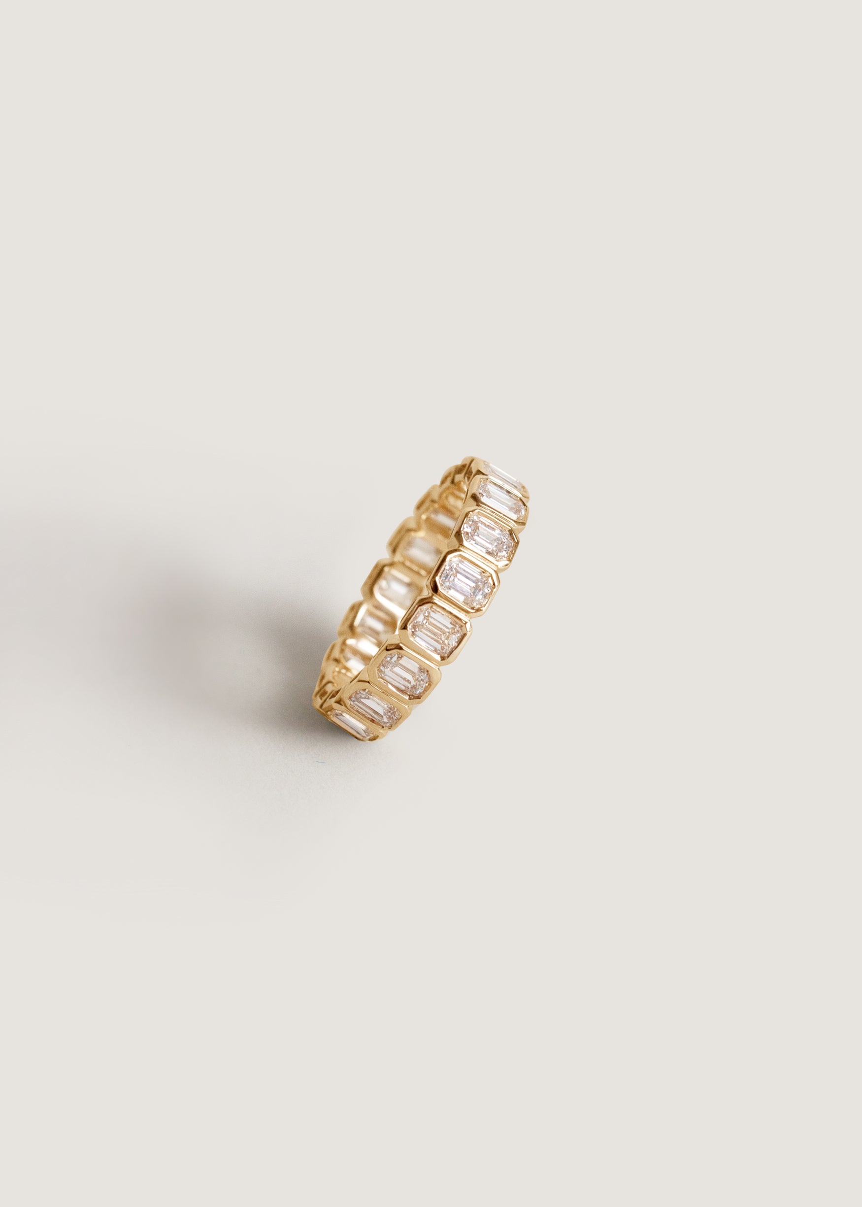 The Margot Emerald Cut Eternity Ring Diamond is a timeless modern heirloom. Featuring natural or lab-created radiant cut diamonds bezel set in 14k solid gold—pass this iconic ring down for generations. Our Marianna Ring draws from its silhouette, offering a distinct take with east-west emerald cuts.
