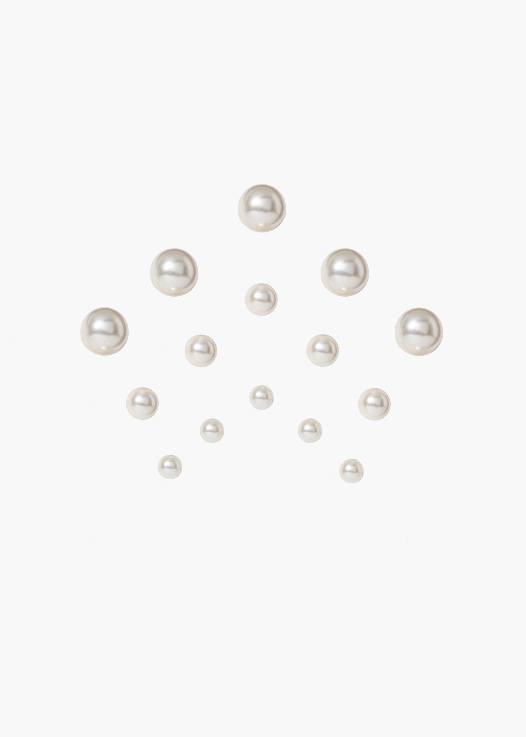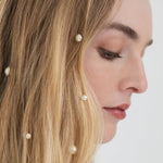 The Paige Hair Magnet Set magically manages to create the sublime look of hair dripping with pearls. Made by hand in New York, this set of 15 pieces uniquely employs magnets to secure to any hair type, with pearls on each side of the magnet, so that all you see is their opalescent glow. With stones in a variety of sizes for a sense of depth, this set can be layered with the Kira Hair Magnet Set for a dynamic combination of pearls and crystals. Dimensions: Biggest pearl: 1/8” width, 1/8” height. Medium pearl: 1/16” width, 1/16” height. Smallest Pearl: 1/32” width, 1/32” height.
