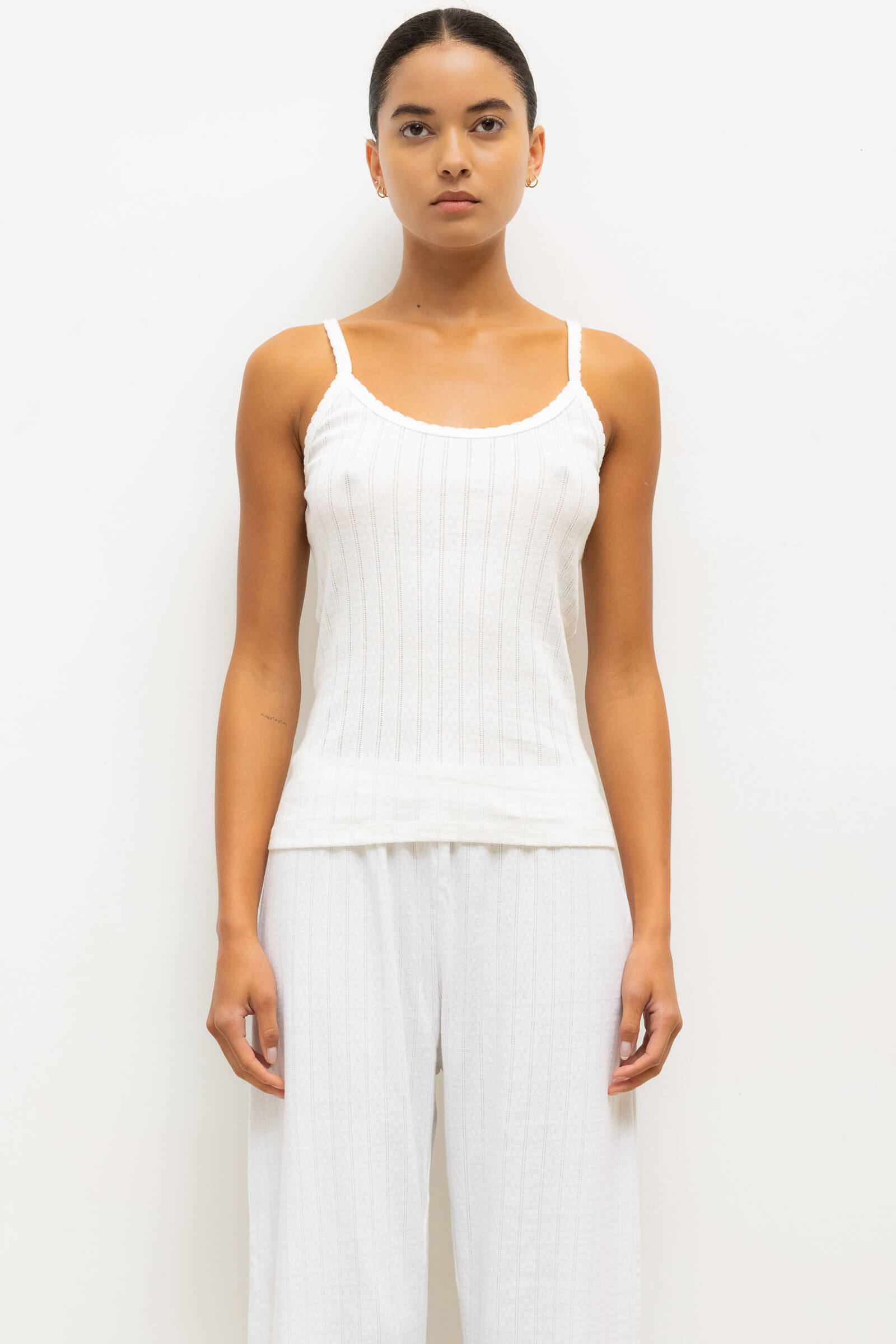Cut in our nostalgic Pointelle Cotton, The Pointelle Tank is a classic spaghetti strap silhouette, featuring our signature pinhole stripes, dainty eyelets and scalloped edging. Wear this by itself, or layered underneath button downs and sweaters.