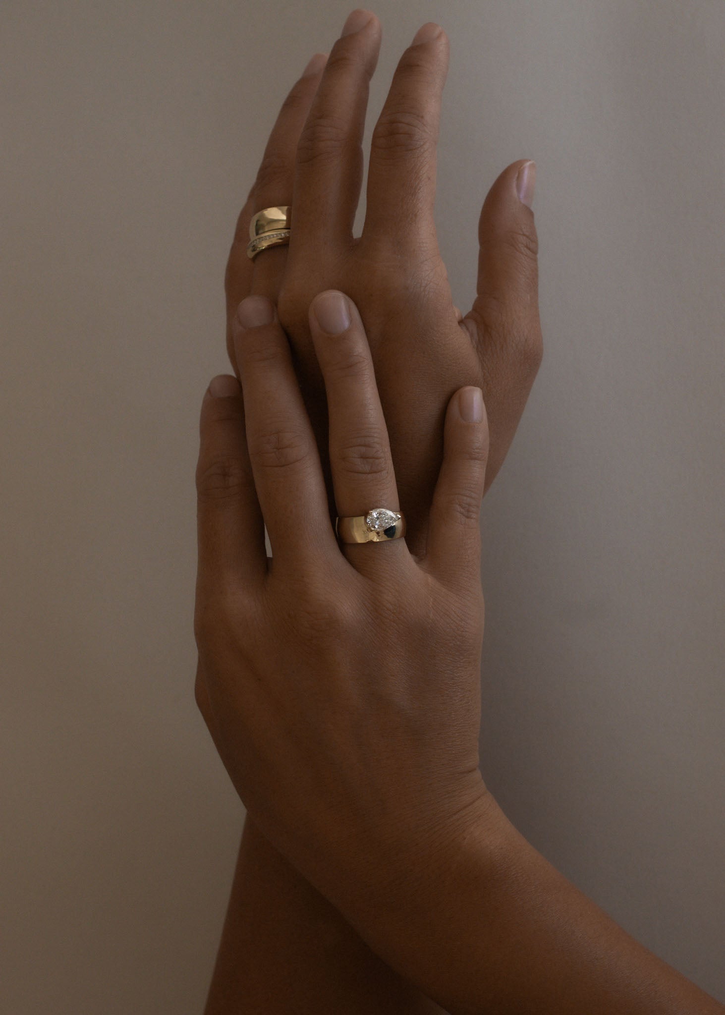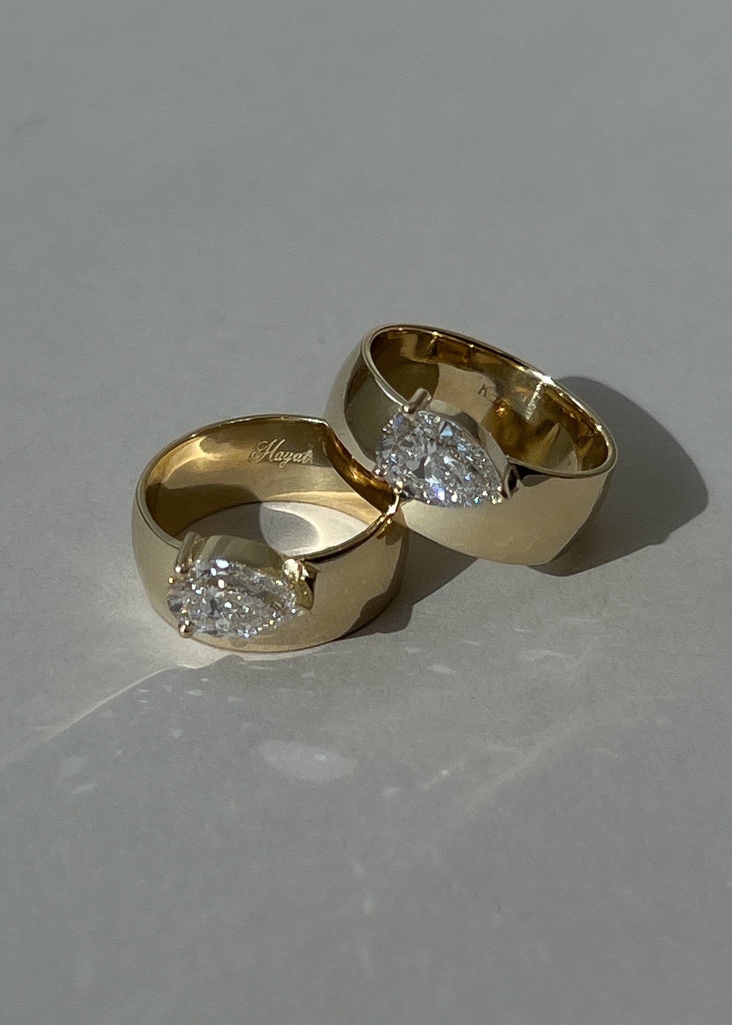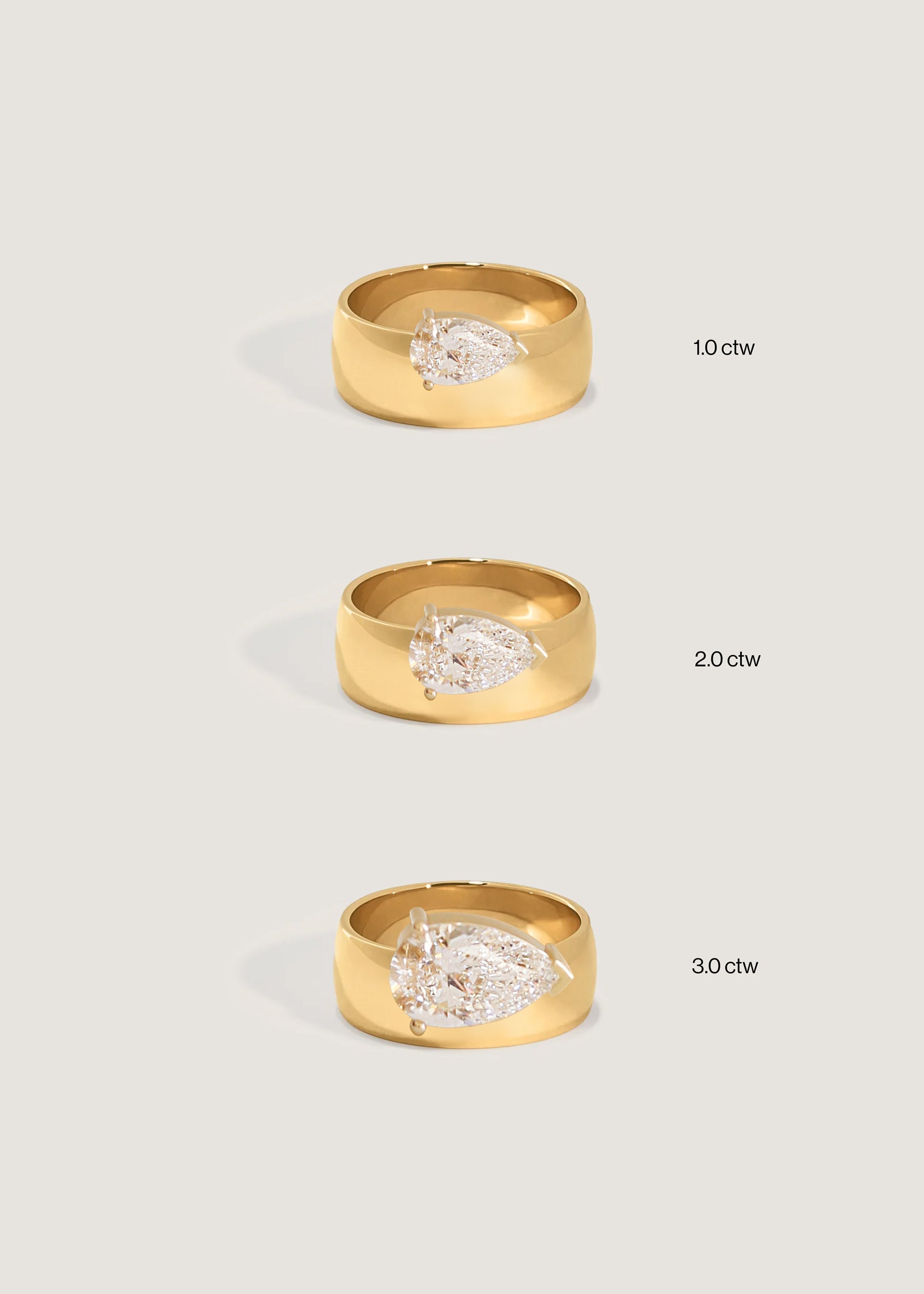 Named for her mom’s maiden name, our Porter Cigar Band Ring Pear Diamond features an east-west set diamond on a sleek 14k gold cigar band. Available in 1, 2, and 3 carat sizes, it blends sentiment, elegance, and modern style.