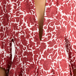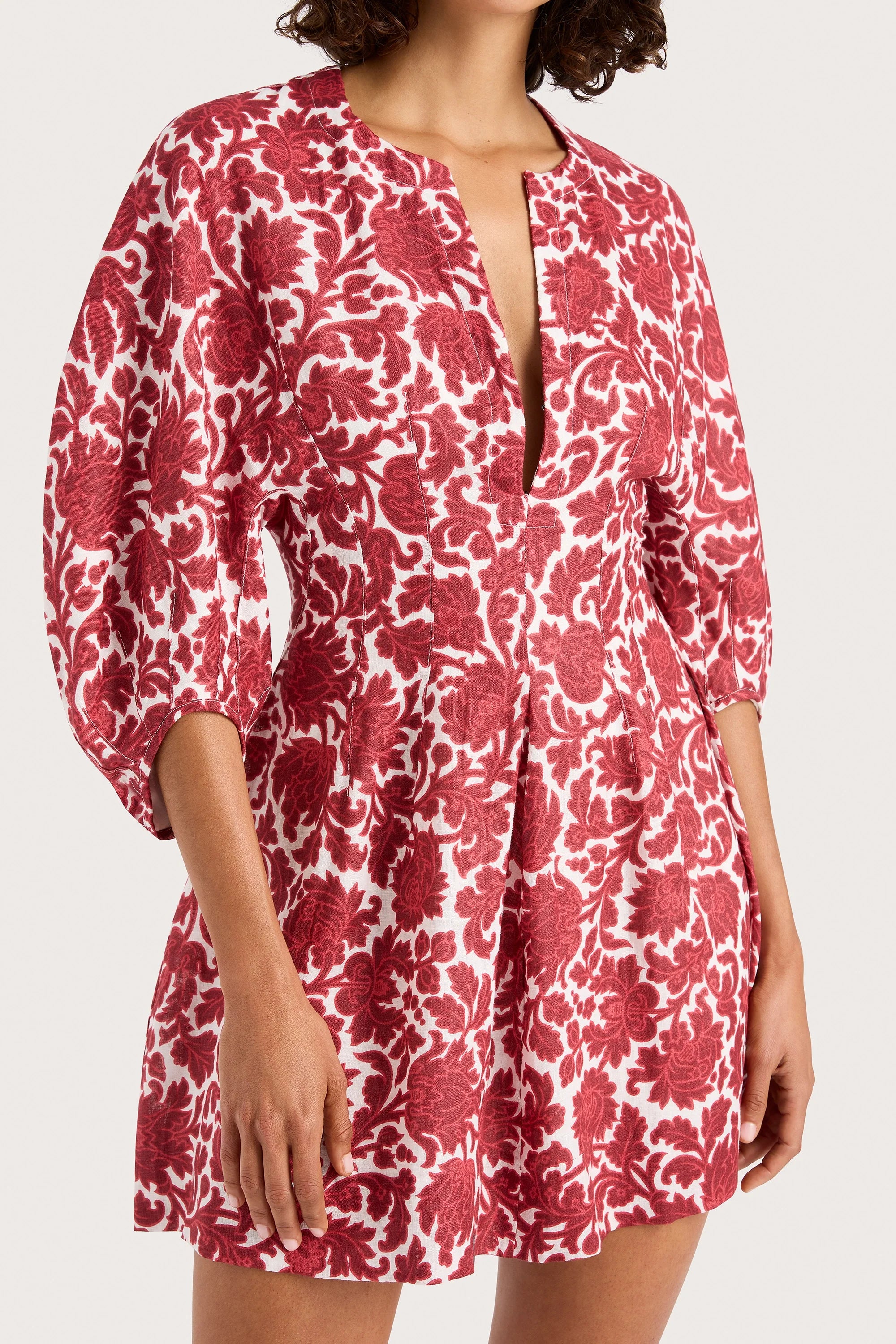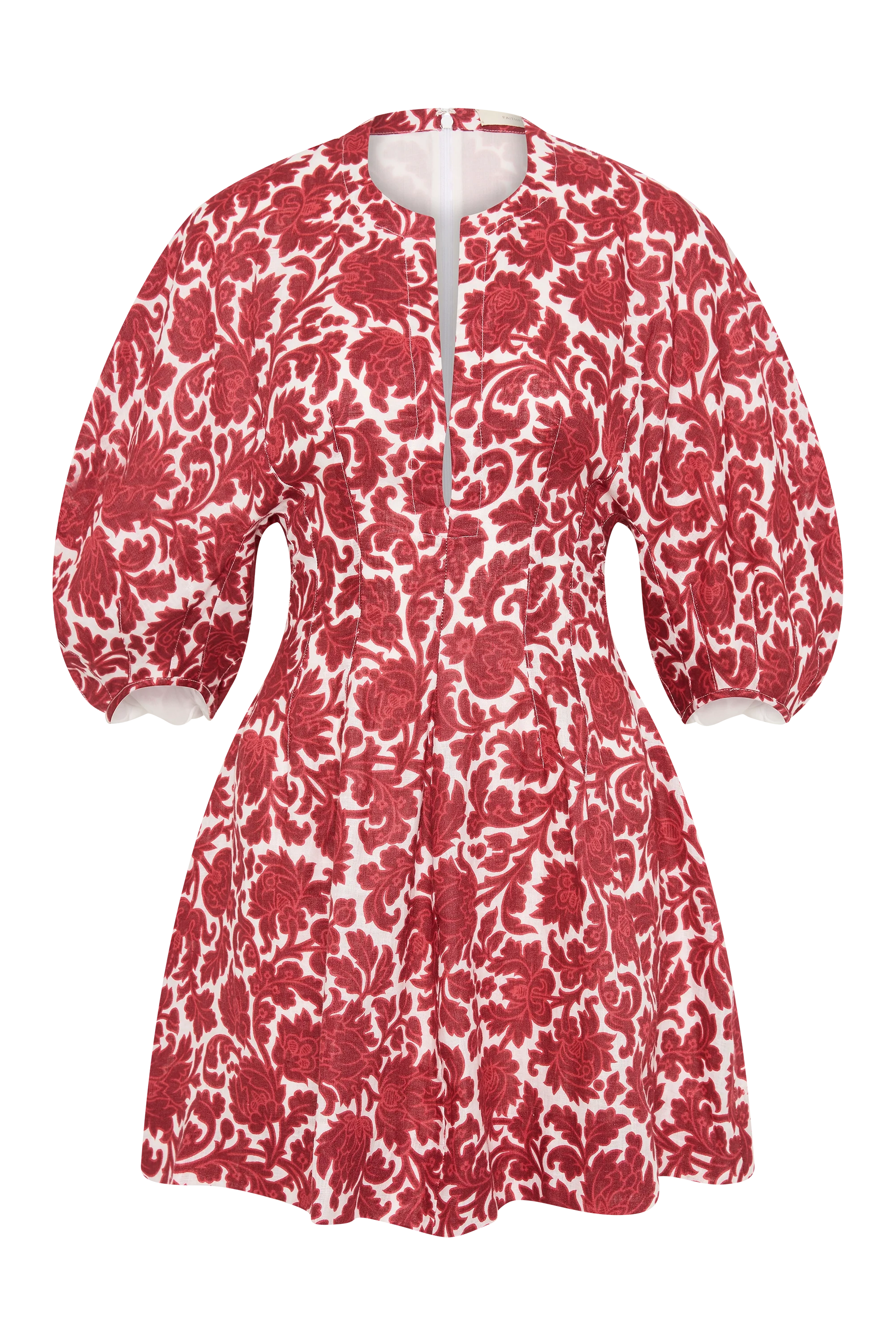 A vacation-style mini dress with a low split at the neckline and oversized rounded sleeves that reach down to the elbow. Imagined in a vibrant red paisley in 100% European Flax® linen, it cinches in at the waist before falling into a soft A-line skirt with pleat details. Intended to transcend seamlessly from everyday wear to occasionwear.