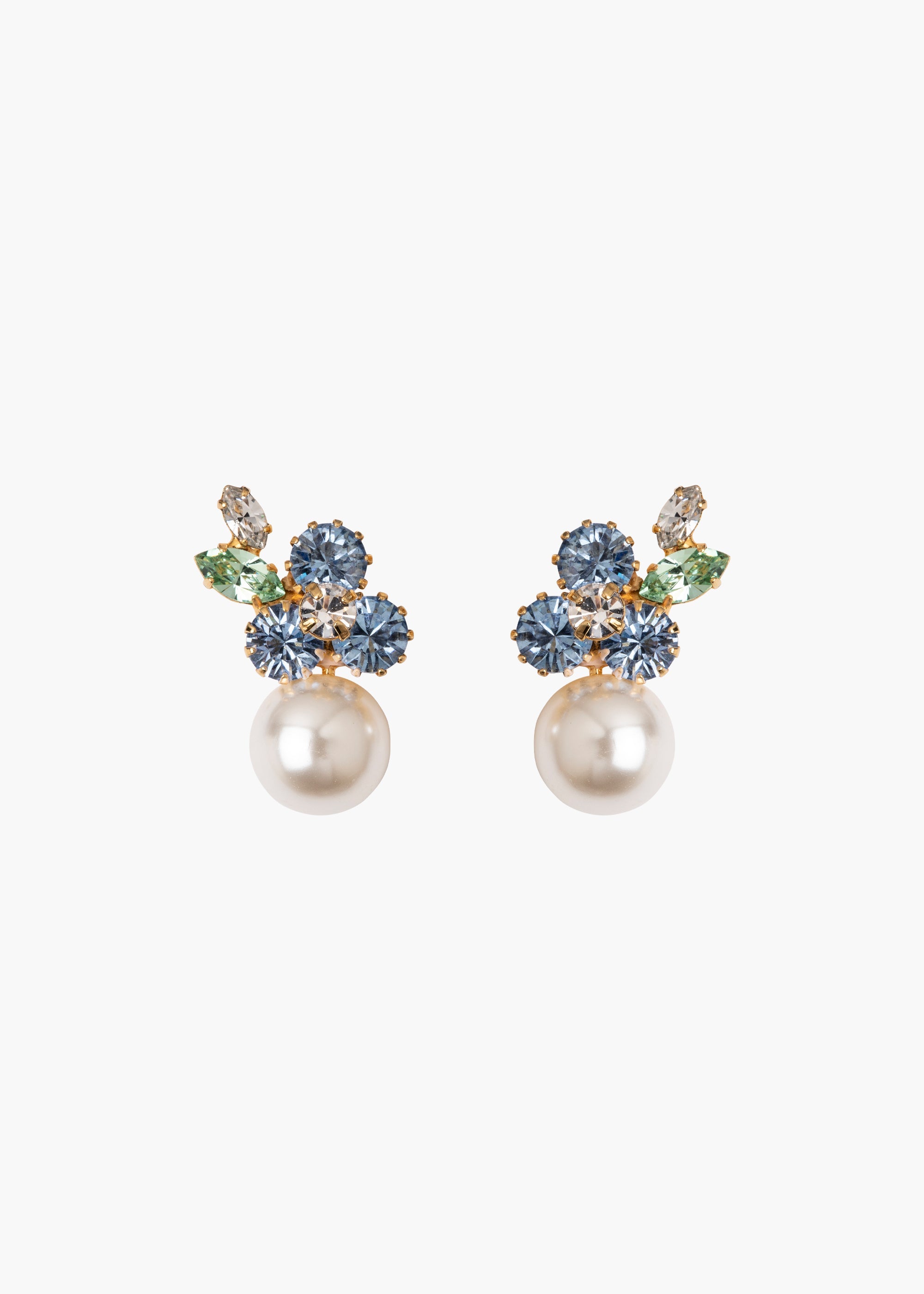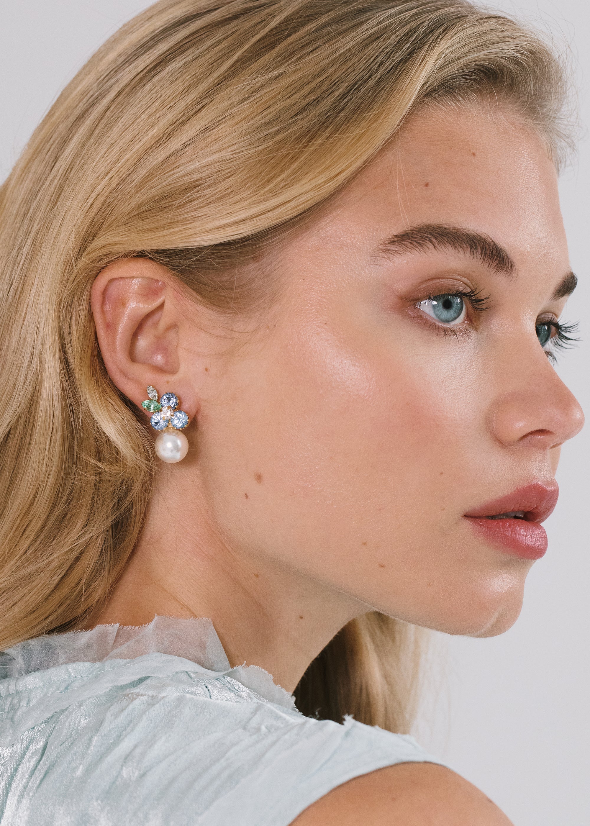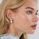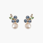 The sweet Vivi Earrings feature an intricate floral motif, offset with a striking drop. Crystals in an array of shapes and sizes are pieced together like a mosaic, forming a painterly floral composition. These crystal pearls are carefully selected to mimic a natural pearl, with the same color and shine. Dimensions: 1.125" length.