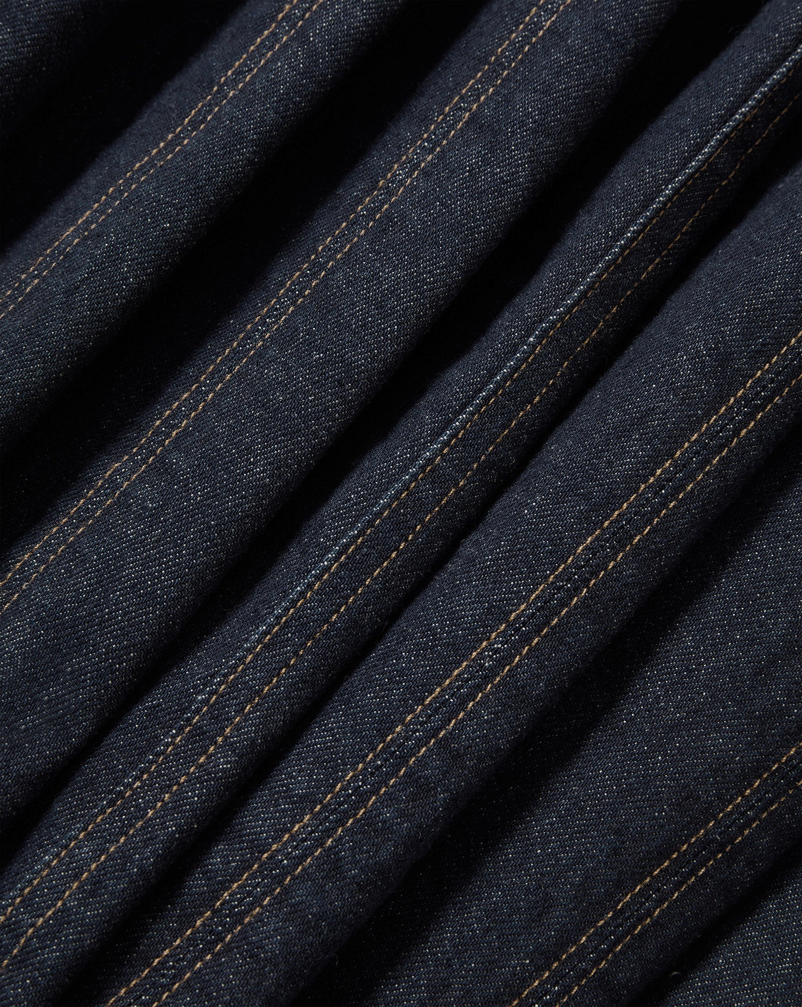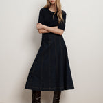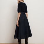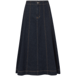 The denim skirt—perfected. Made in LA from dark-blue Italian stretch denim, the Alix circle skirt sits high on the waist and falls to a midi length with fluid movement. All-over contrast seams create a paneled effect, while a wide hem that hits just above the ankle adds extra swing. A seasonless staple, pair it with slingback heels for an elevated finish or tall boots for a more layered look.