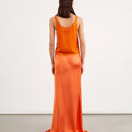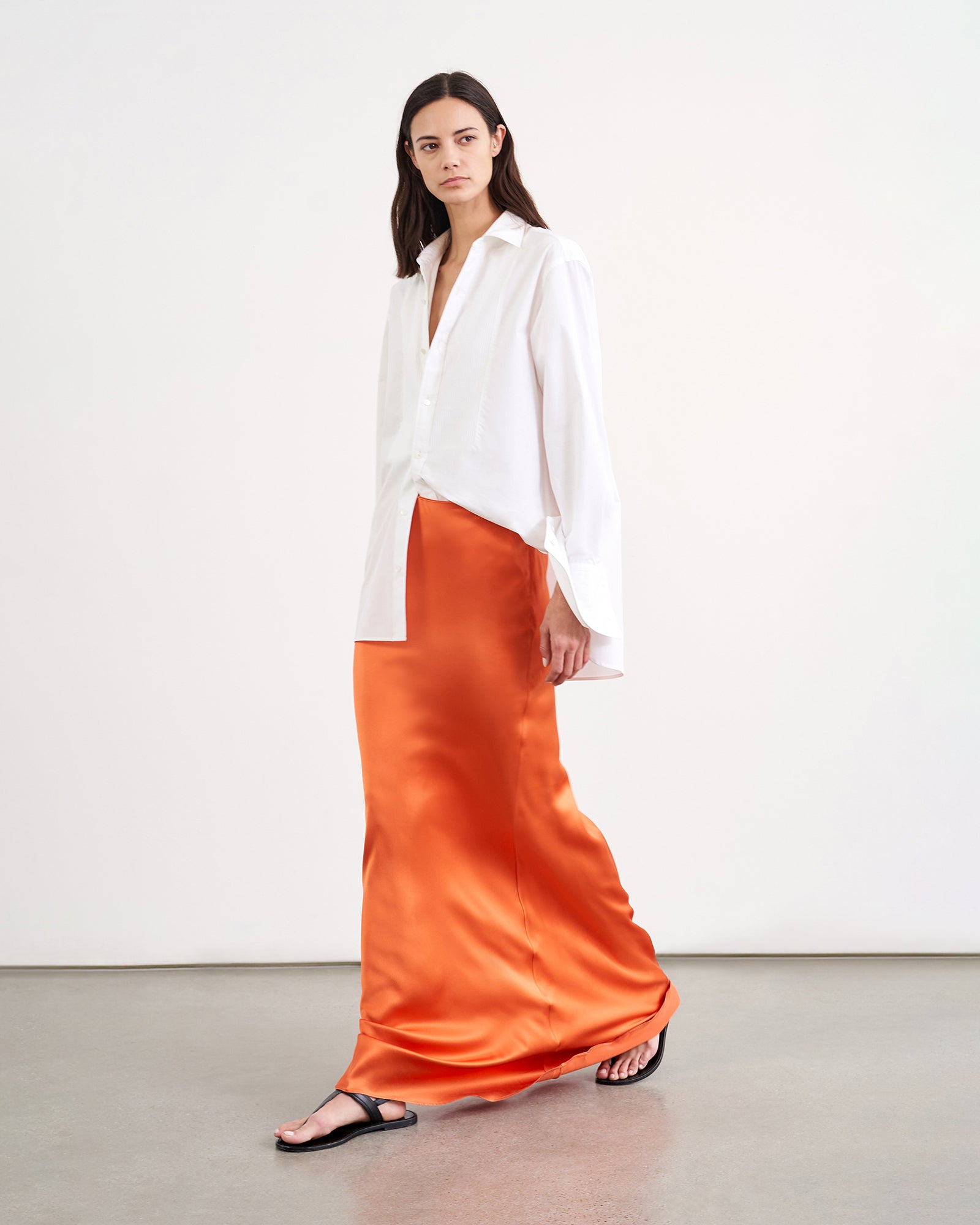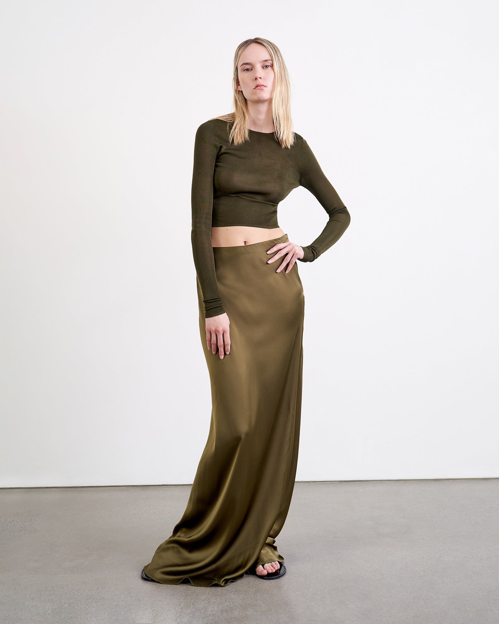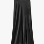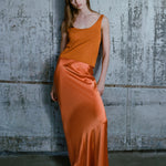 Floor length skirt in heavy silk charmeuse. Zip closure. Unlined.