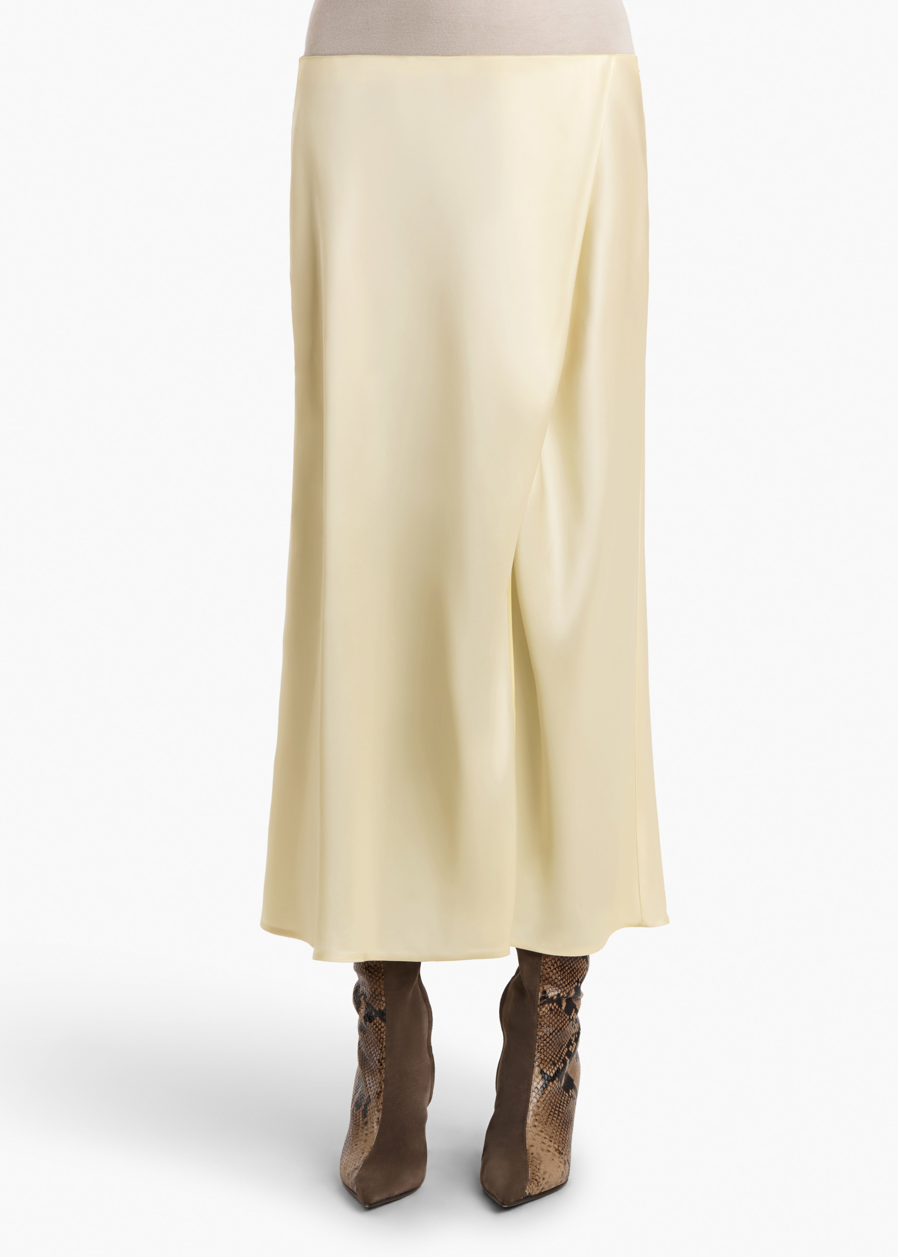 A fluid midi skirt in luminous satin that is cut on the bias for a body-skimming fit. Draped detail at folded front. Concealed zipper closure at left side.