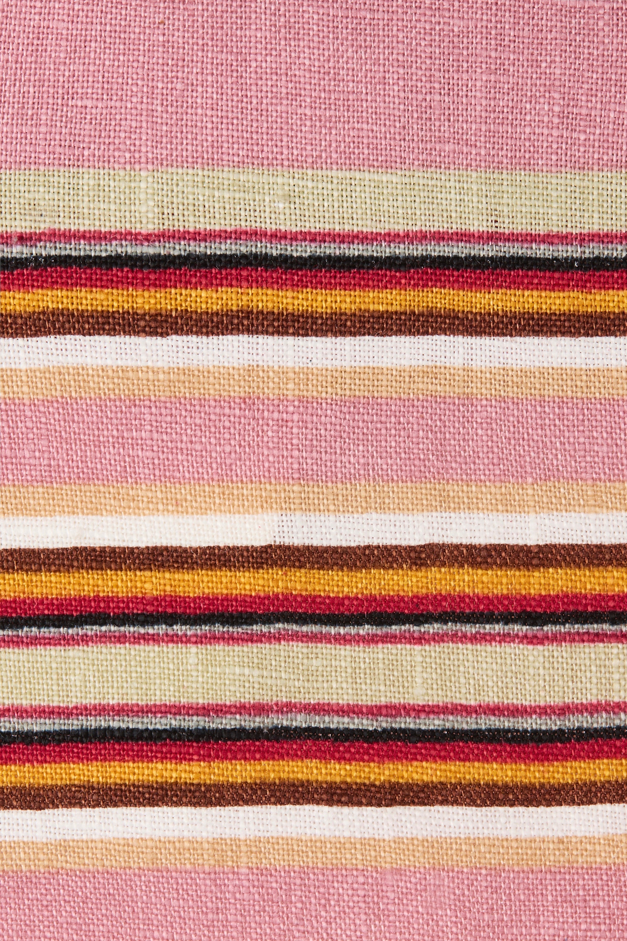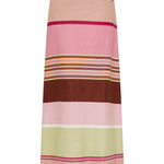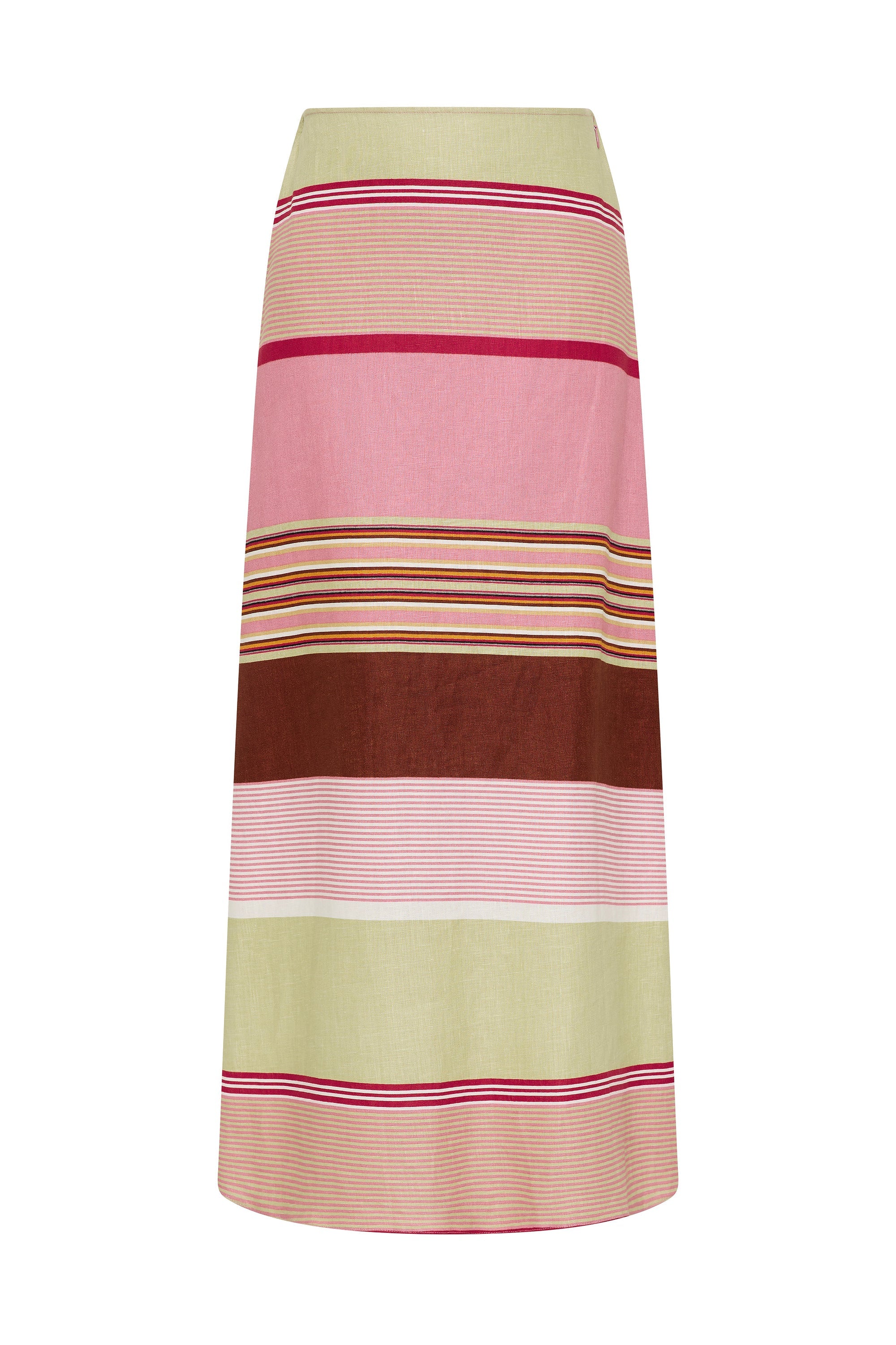 A vacation-inspired maxi skirt, designed from a signature 100% European Flax® linen in a warm multi-colour stripe, bringing in tones of mauve, olive and chocolate brown. Sitting high-rise on the waist with an elasticated back waist, it flares into a soft A-line skirt that crops around the ankles. Style with the matching Martina Maxi Skirt for effortless summer set dressing.