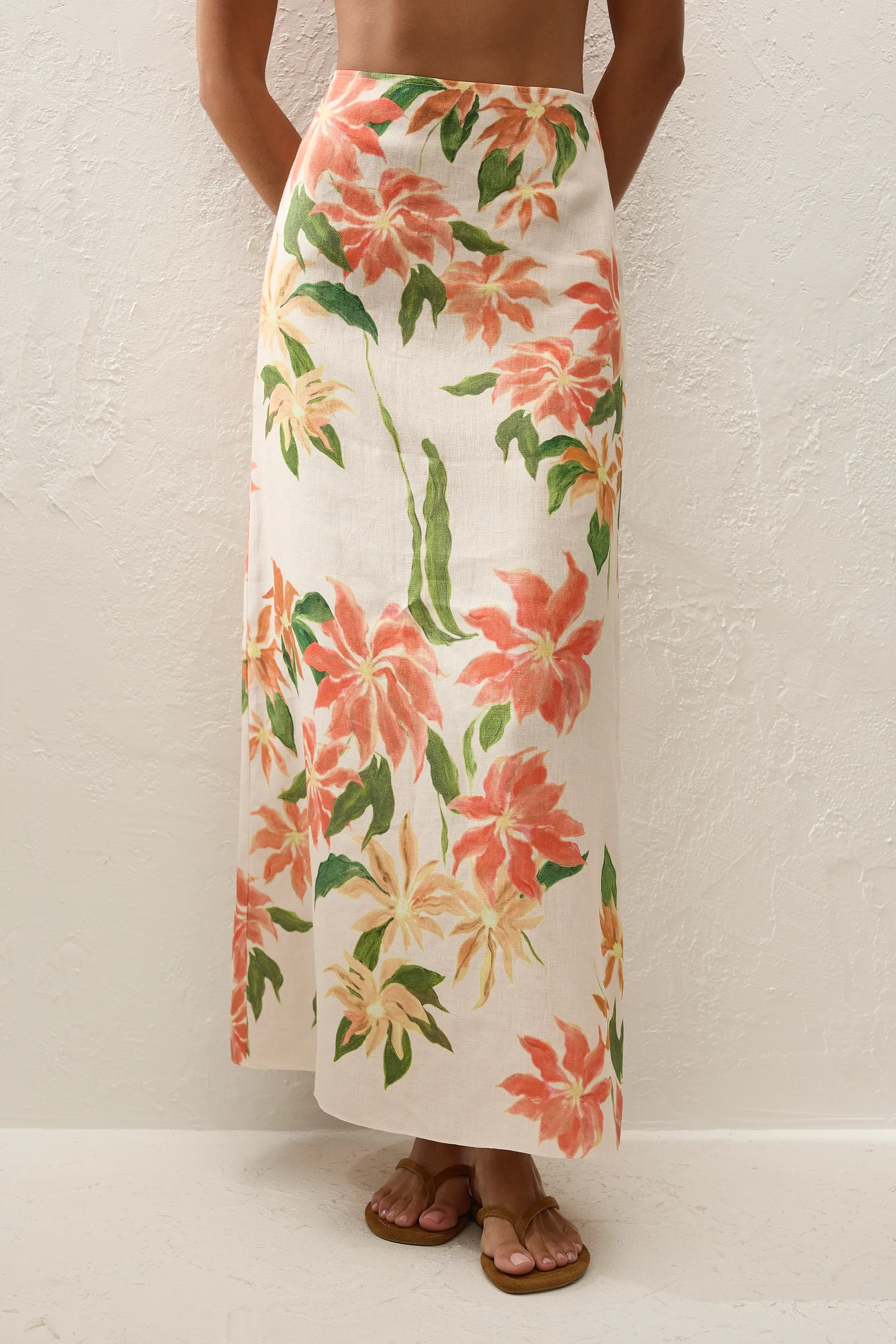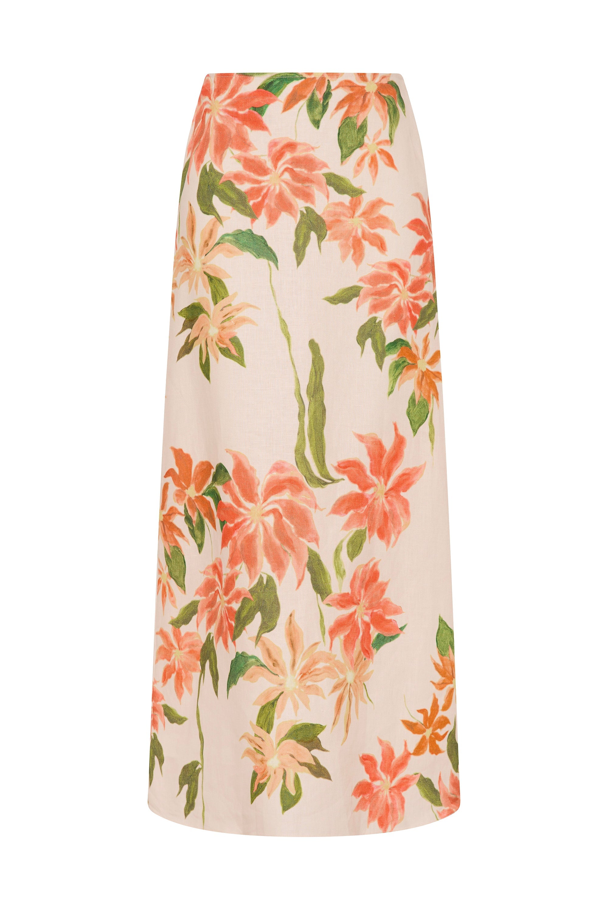A vacation-inspired maxi skirt, designed from a signature 100% European Flax® linen in a custom floral print, nodding to the colours and vibrancy of Mexico by bringing together creamy neutrals with warm apricots and soft greens. Sitting high-rise on the waist with an elasticated back waist, it flares into a soft A-line skirt that crops around the ankles. Style with the matching Eleanore Strapless Top for effortless summer set dressing.