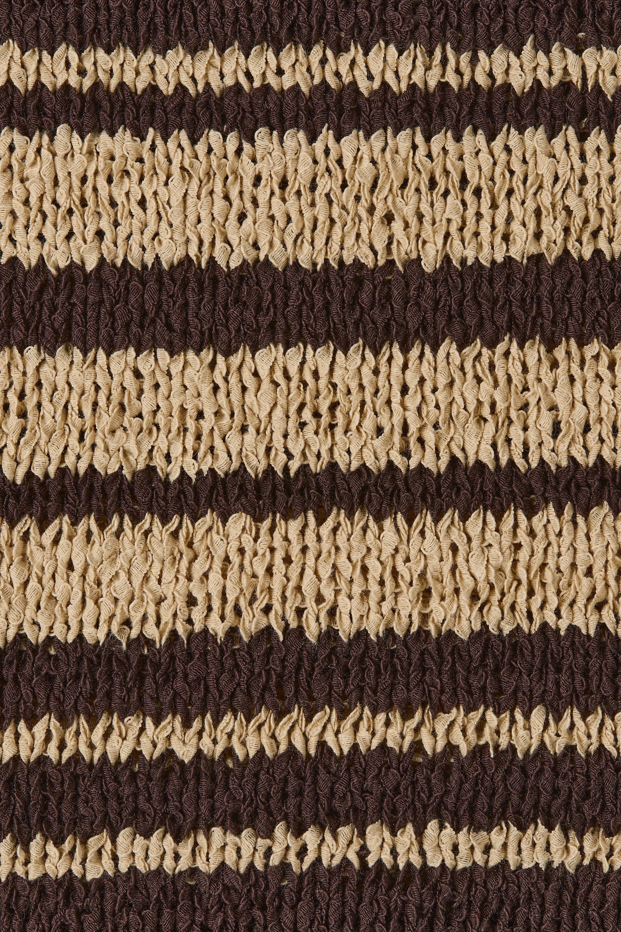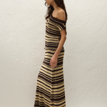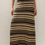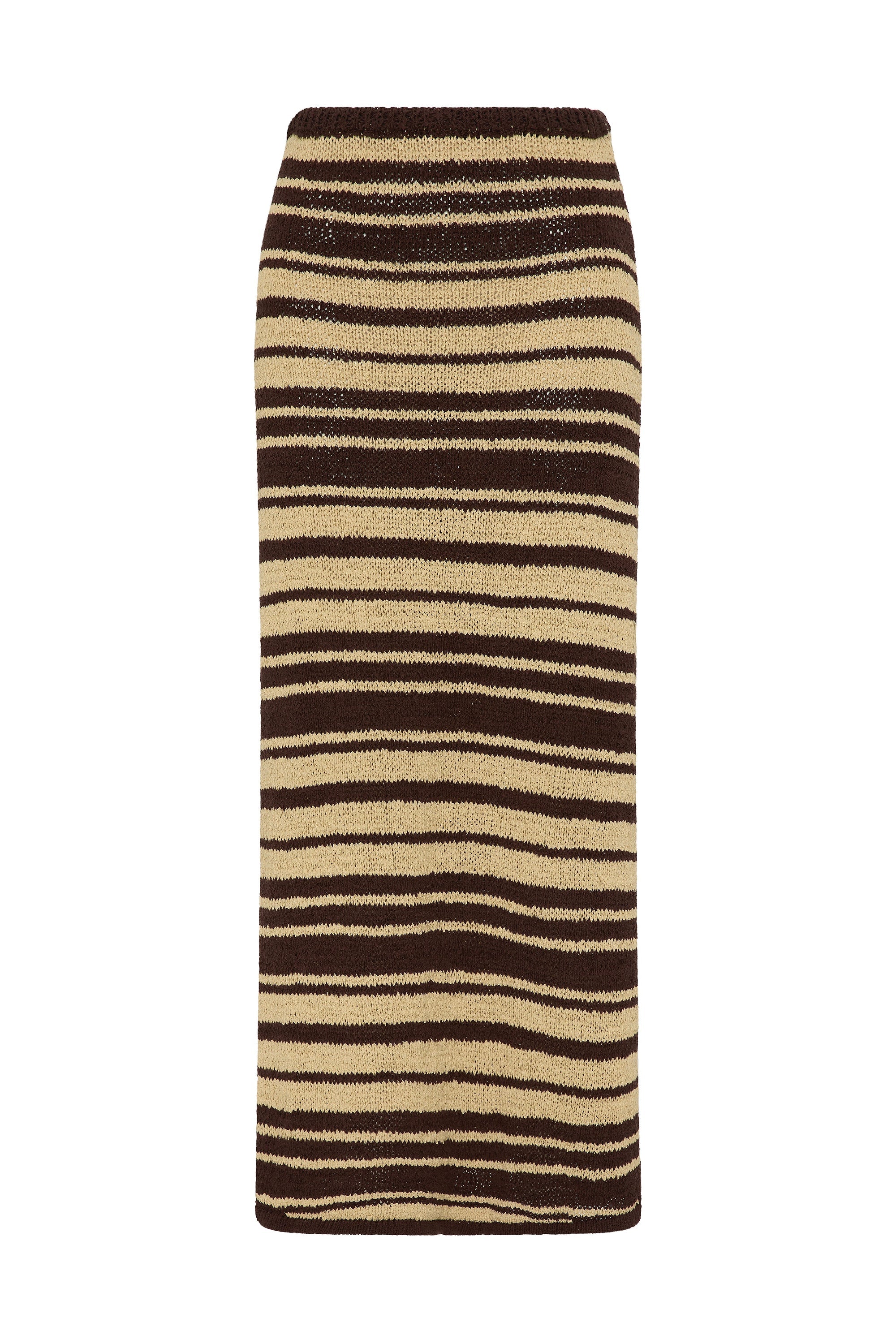 A mid-rise maxi skirt, designed from a unique heavy-weight jersey knit, blending cotton and nylon, in a neutral two-tone stripe. Elasticated at the waist with a ribbed chocolate brown band, it is relaxed in shape and falls in an A-line silhouette. Style with the matching Micah Top for beach to bar dressing.
